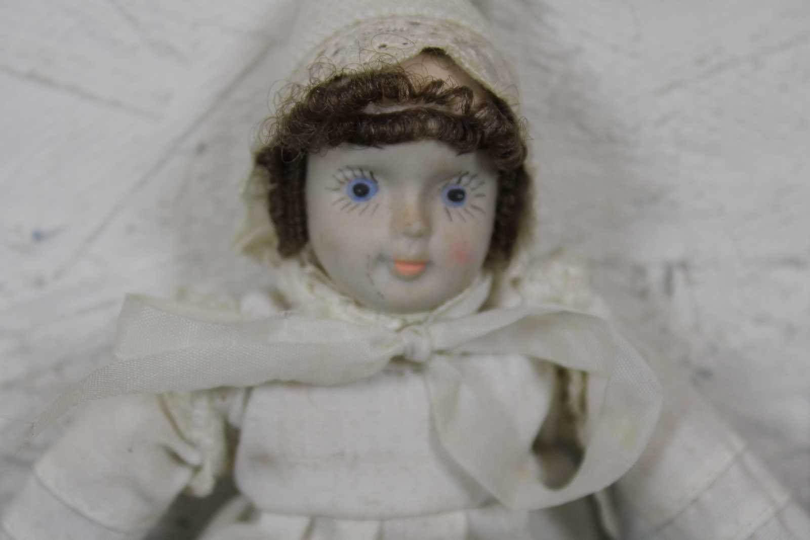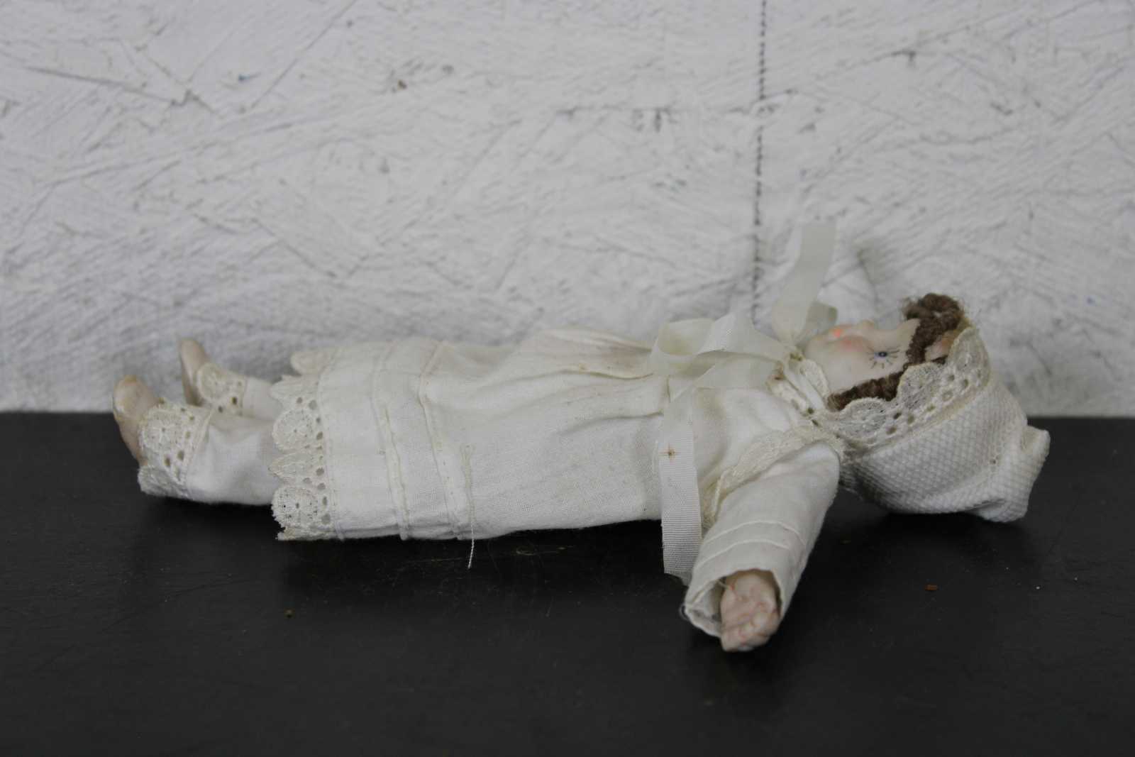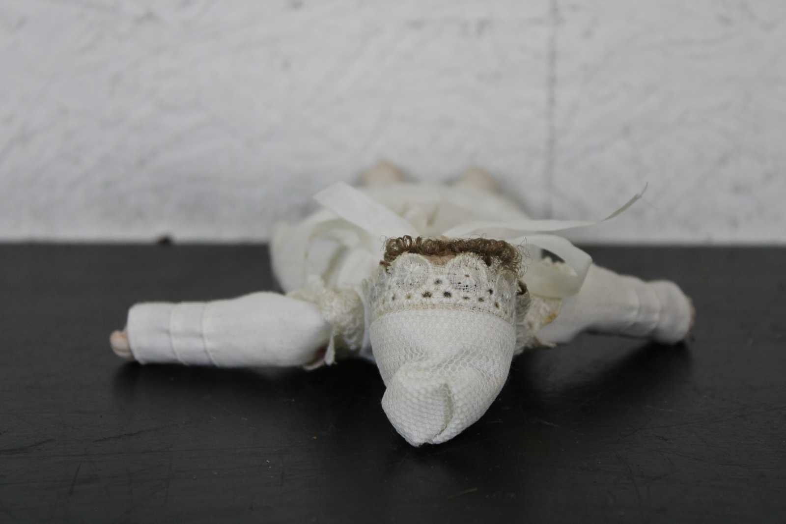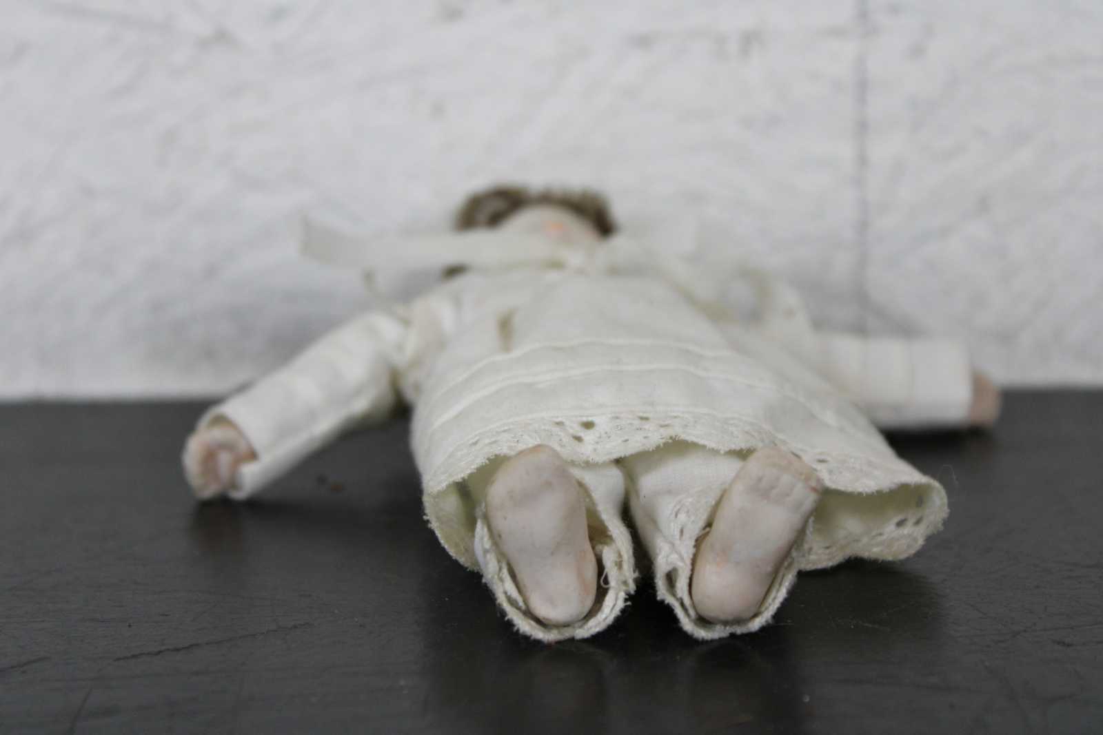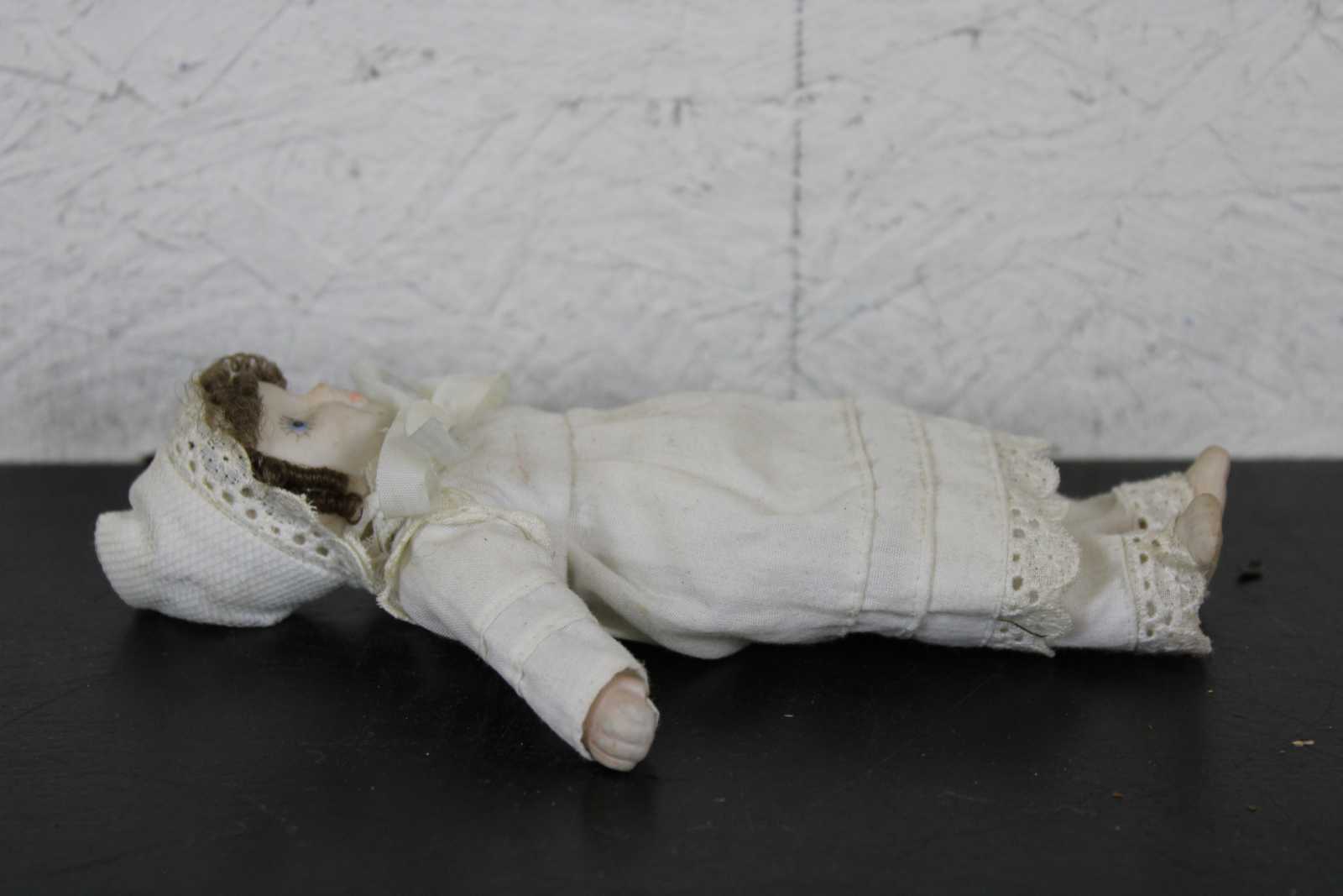 Antique doll with painted bisque head, hands, and feet, brown curls and dressed in white bed clothes.