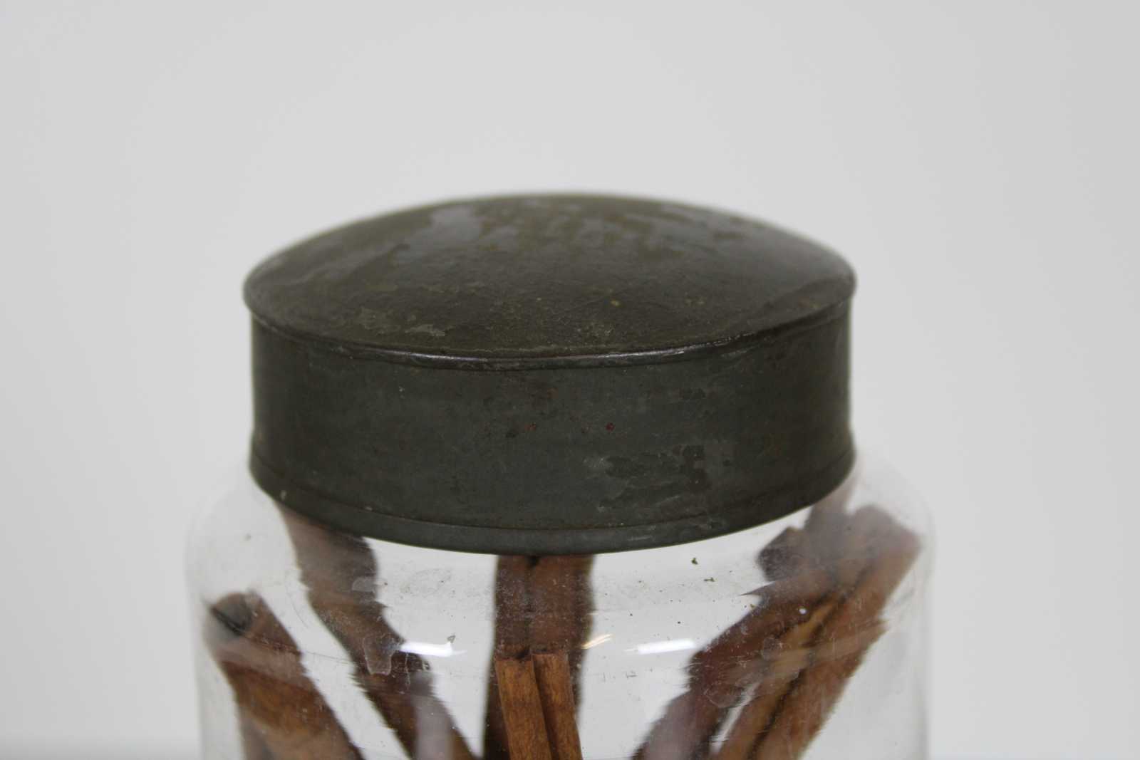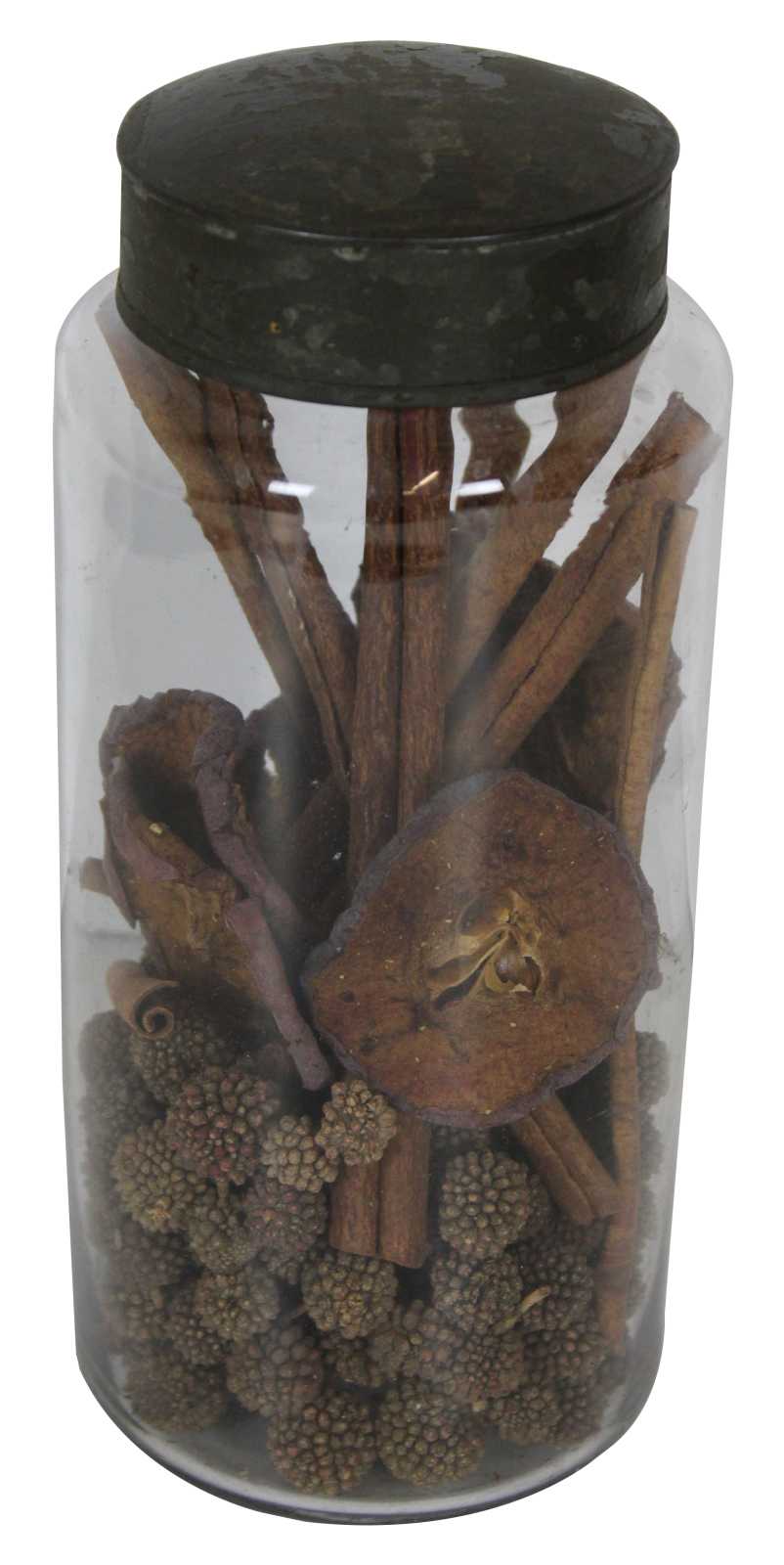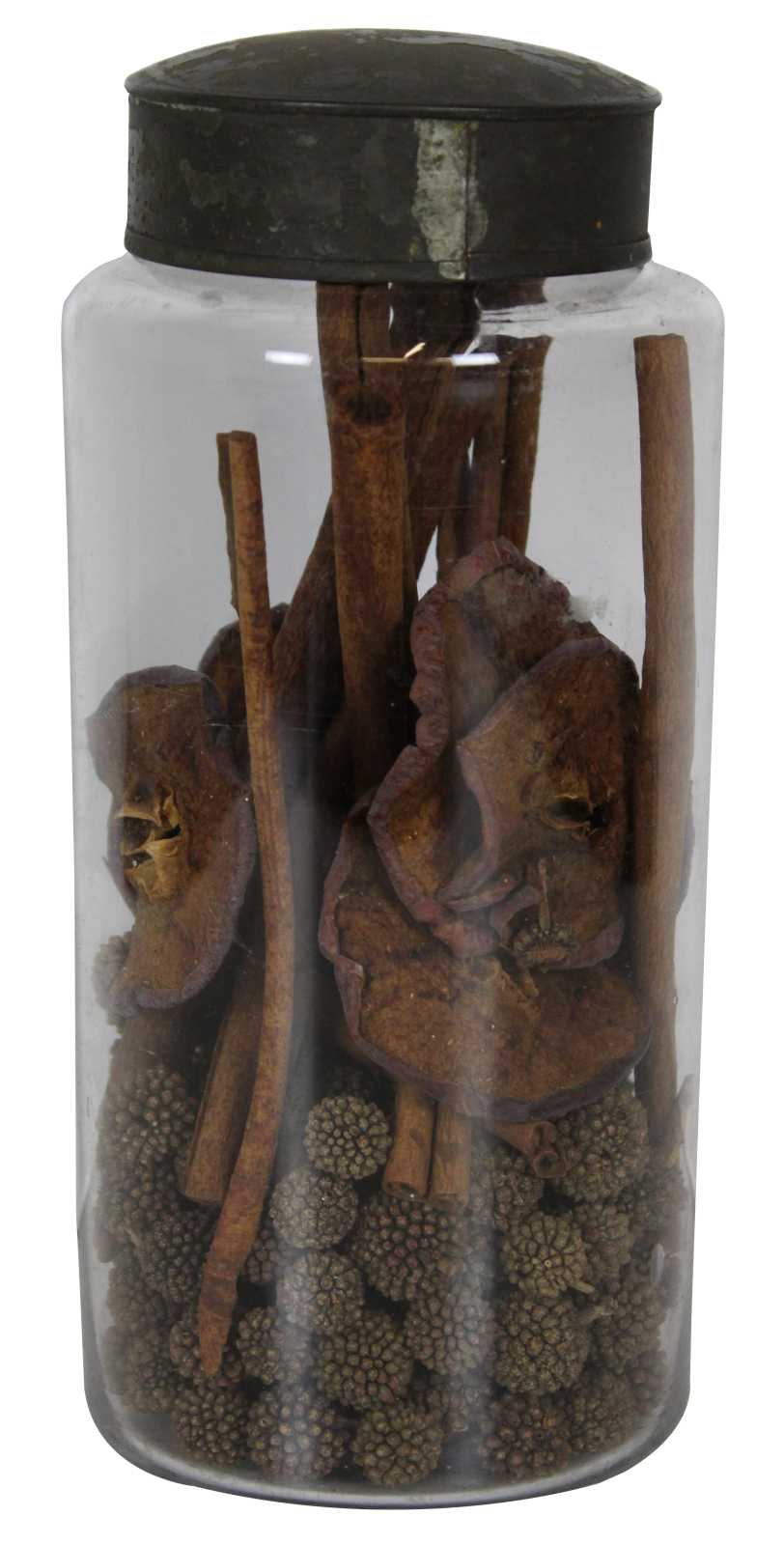 Antique Early American folk art hand blown glass apothecary jar with tin lid, filled with dried oranges/apples, cinnamon sticks and what is probably golpipal (aka Round Pipal, related to long pepper) or blackberries.