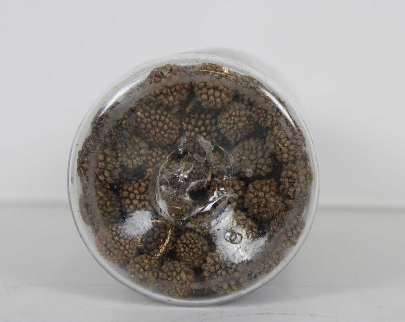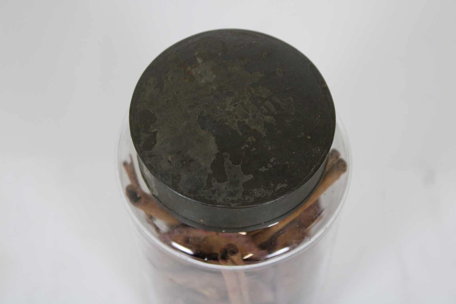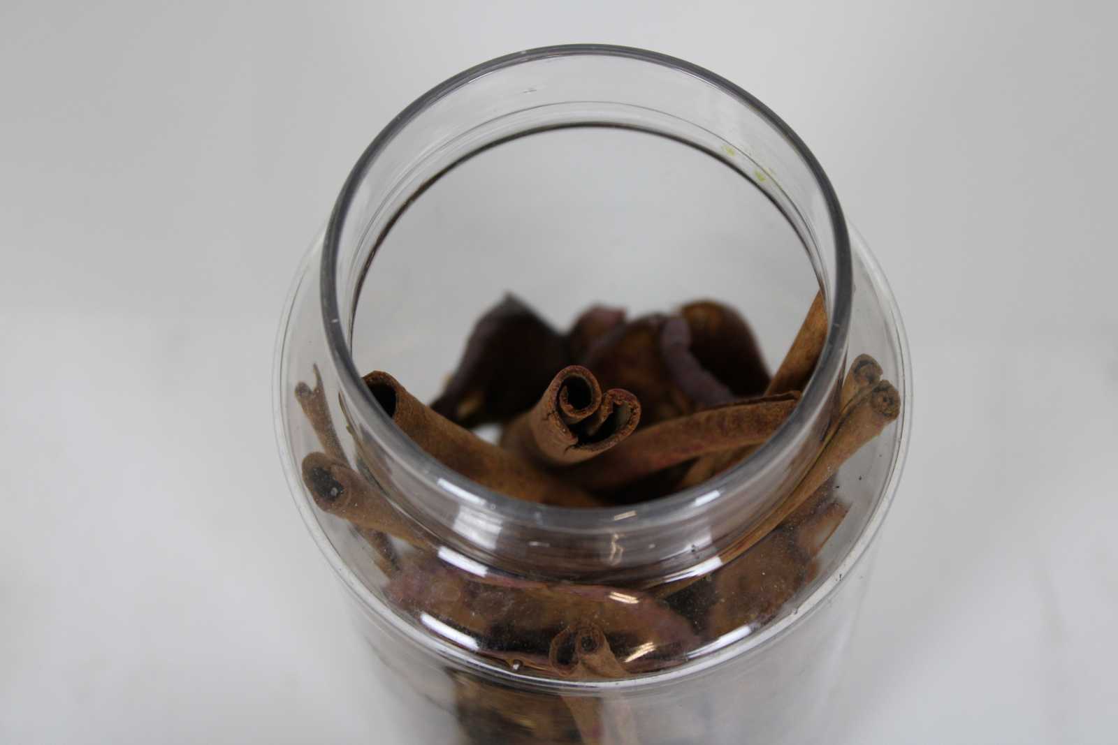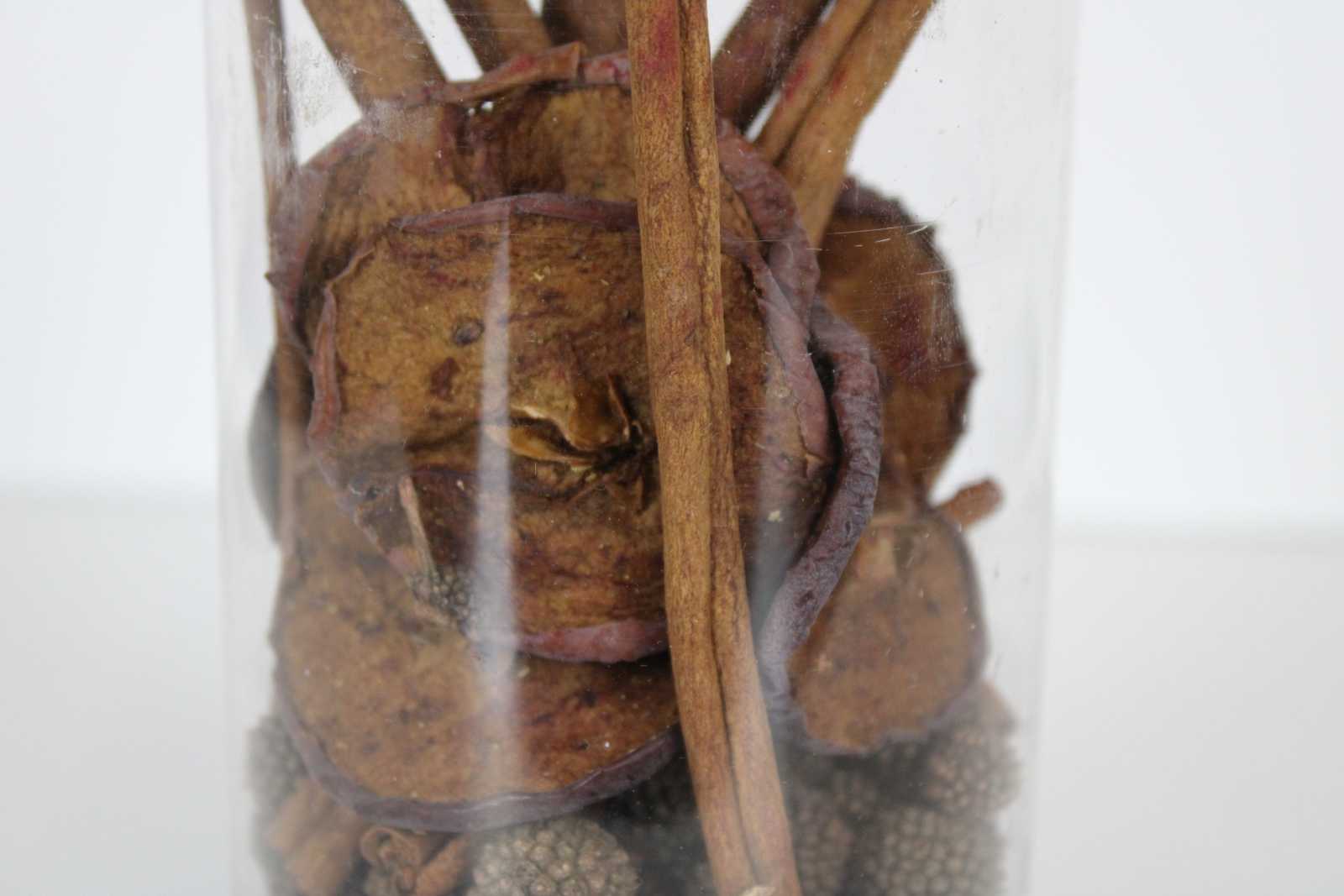 Antique Early American folk art hand blown glass apothecary jar with tin lid, filled with dried oranges/apples, cinnamon sticks and what is probably golpipal (aka Round Pipal, related to long pepper) or blackberries.