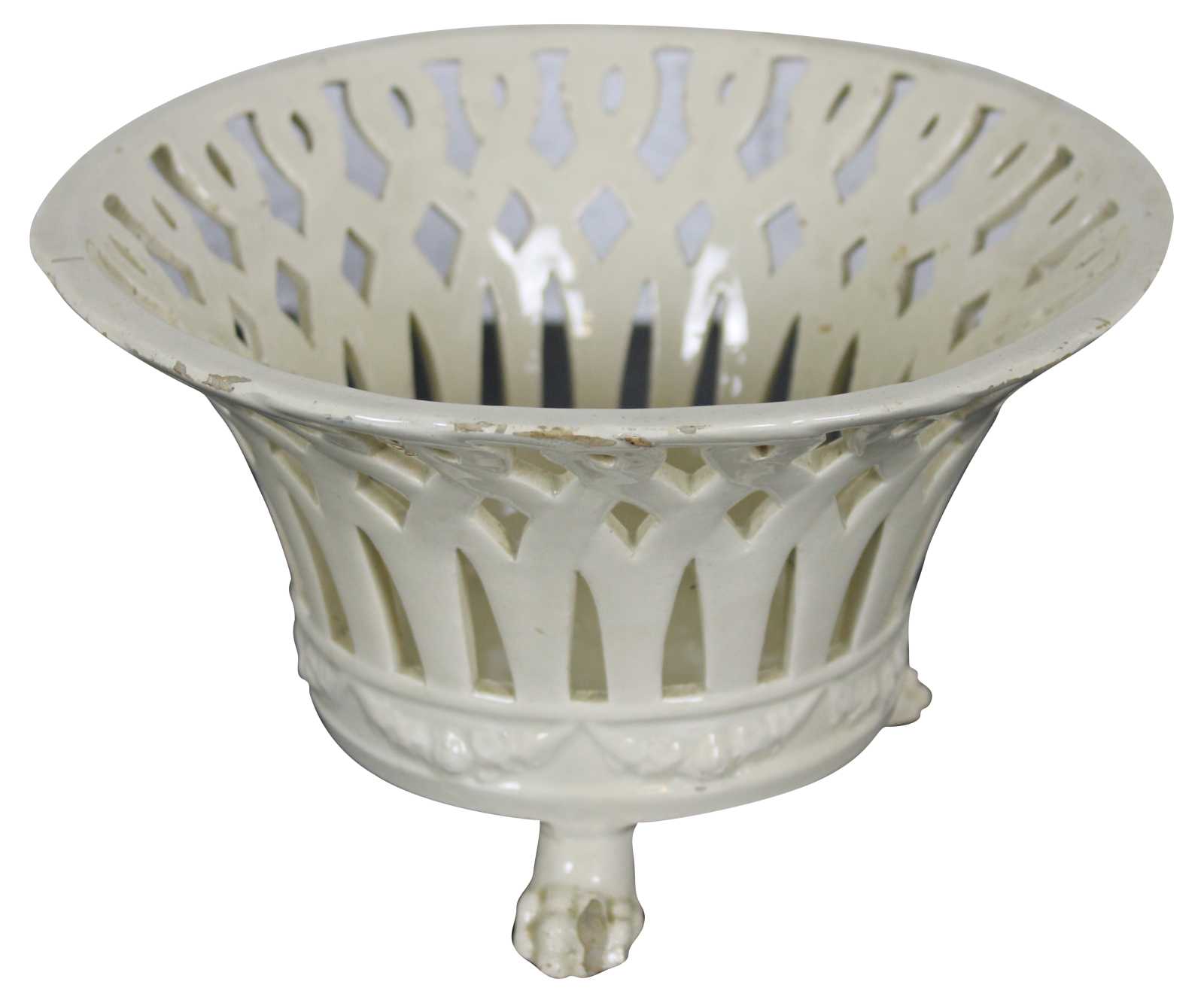 Vintage empire style openwork or pierced footed basket centerpiece. Features floral swag along the base and three paw feet.