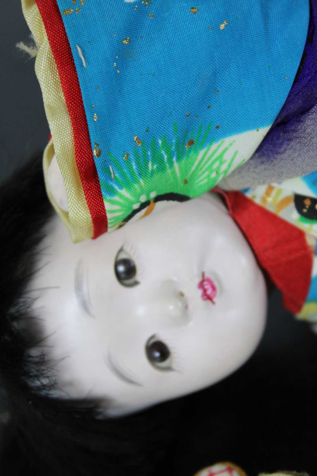 Kimekomi 'means ""tuck in"" in Japanese and refers to a method of making dolls. The ancestors of Kimekomi dolls are the Kamo (""willow-wood"") dolls, small dolls carved of willow and decorated with cloth scraps. Kimekomi dolls start with a carved and/or molded base of wood, wood compo, or paulownia sawdust mixed with glue. A design of different patterned cloth made of silk brocade with traditional Japanese design scraps is planned out, and the base is grooved so that the edges of the cloth can be hidden in the grooves. The cloth is glued on and the edges tucked in. The head and hands (if any) of the doll are usually finished with gofun (crashed oyster shell), doll's face covered in a highly burnished gofun and hand-painted, the hair may be a part of the molded head or be a separate wig. These lovely dolls have become a very popular Japanese craft.