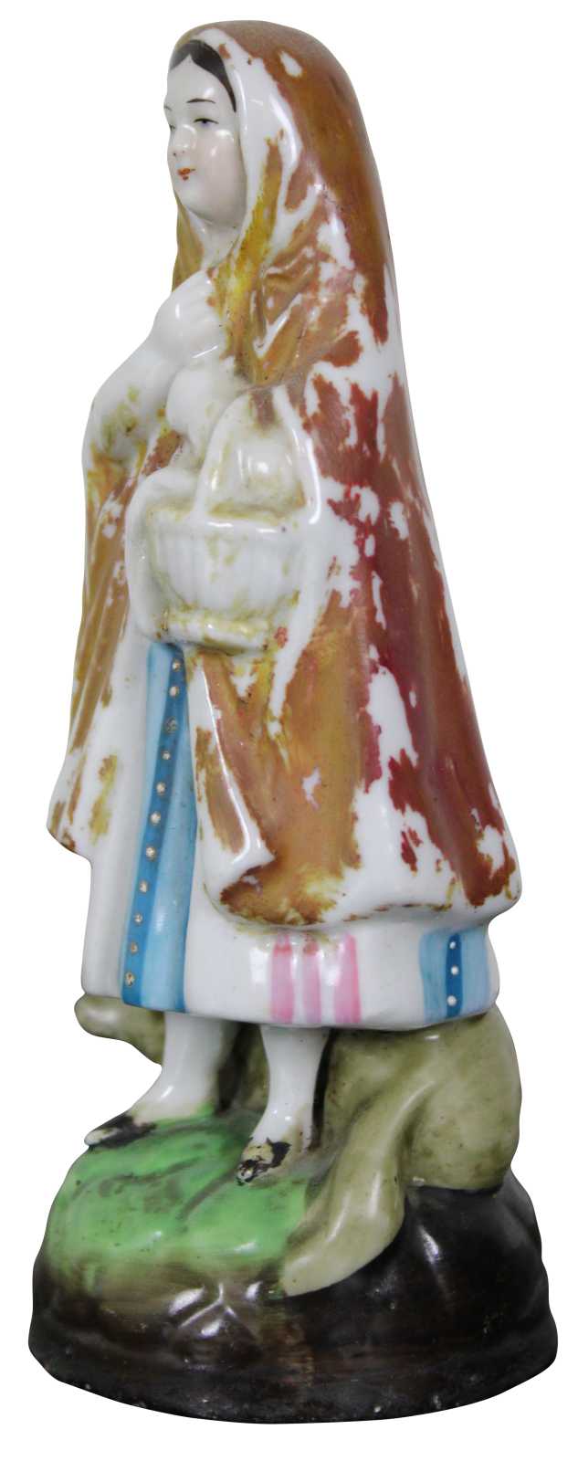Antique 19th century miniature Staffordshire porcelain figurine of a peasant woman (Red Riding Hood) wrapped in a cloak, holding a basket, with a wolf at her feet.