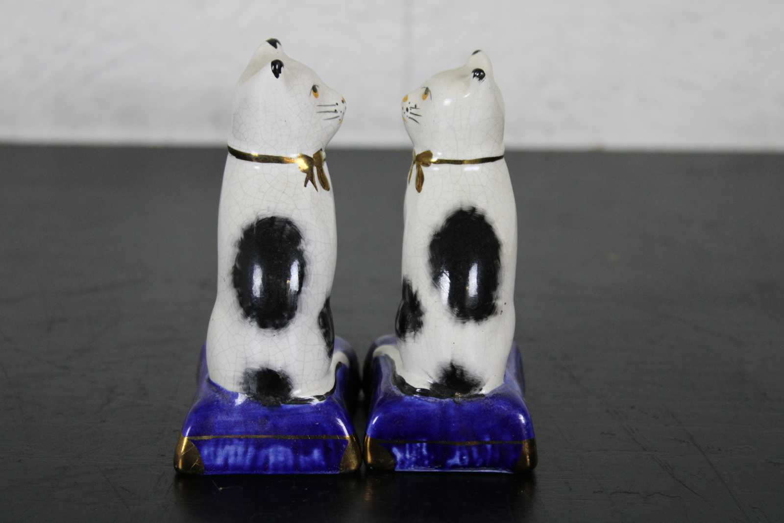 Pair of antique Staffordshire porcelain miniature black and white spotted cat figurines.