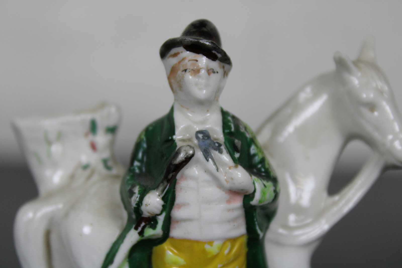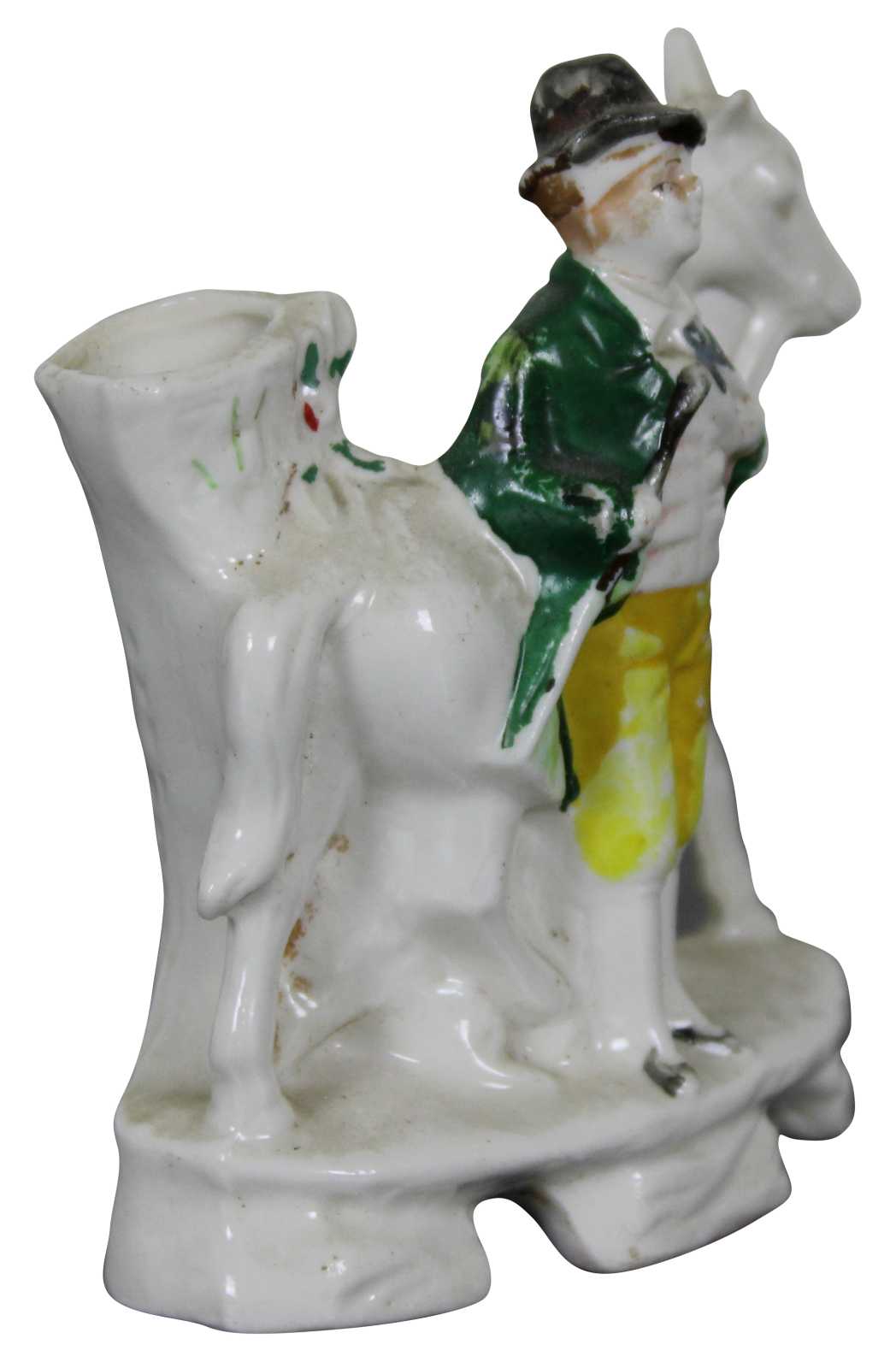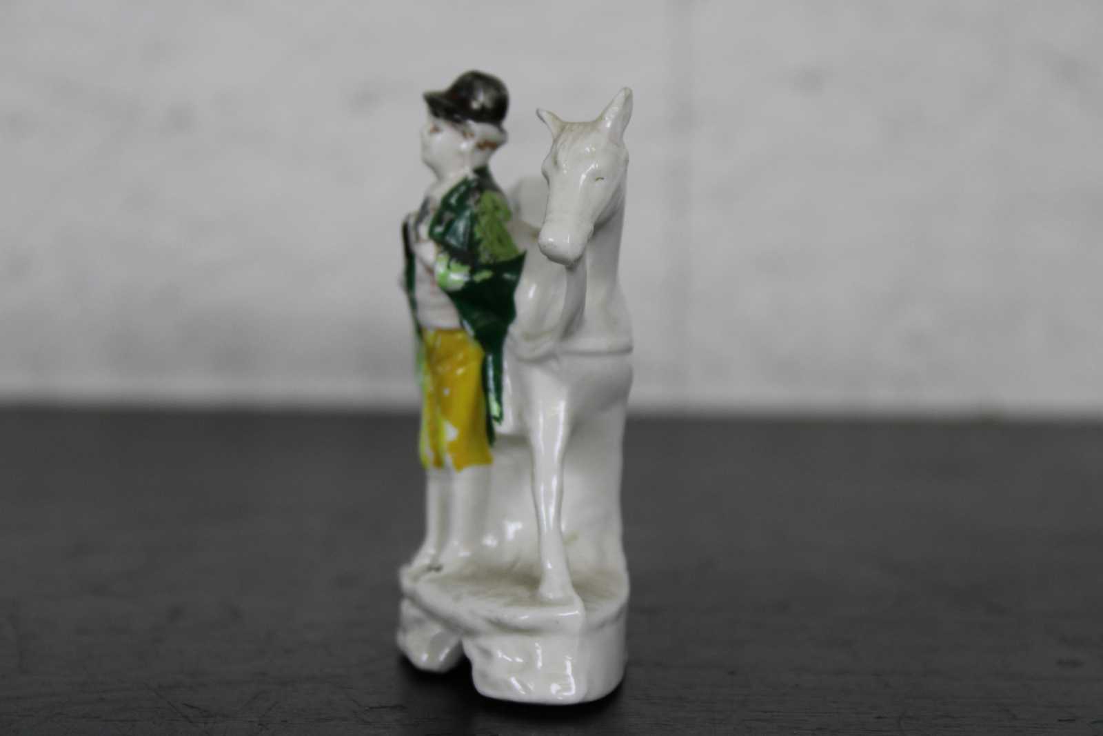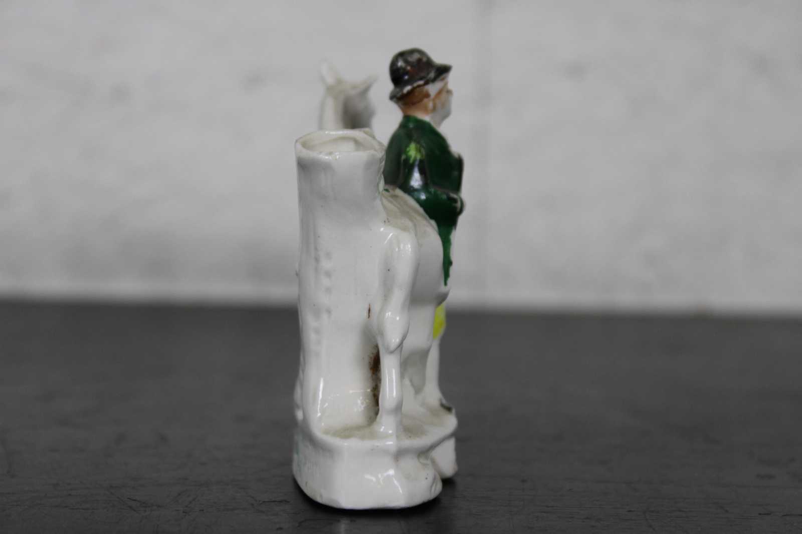 Antique 19th century Staffordshire porcelain miniature bud vase figurine in the shape of a gentleman standing with a horse.