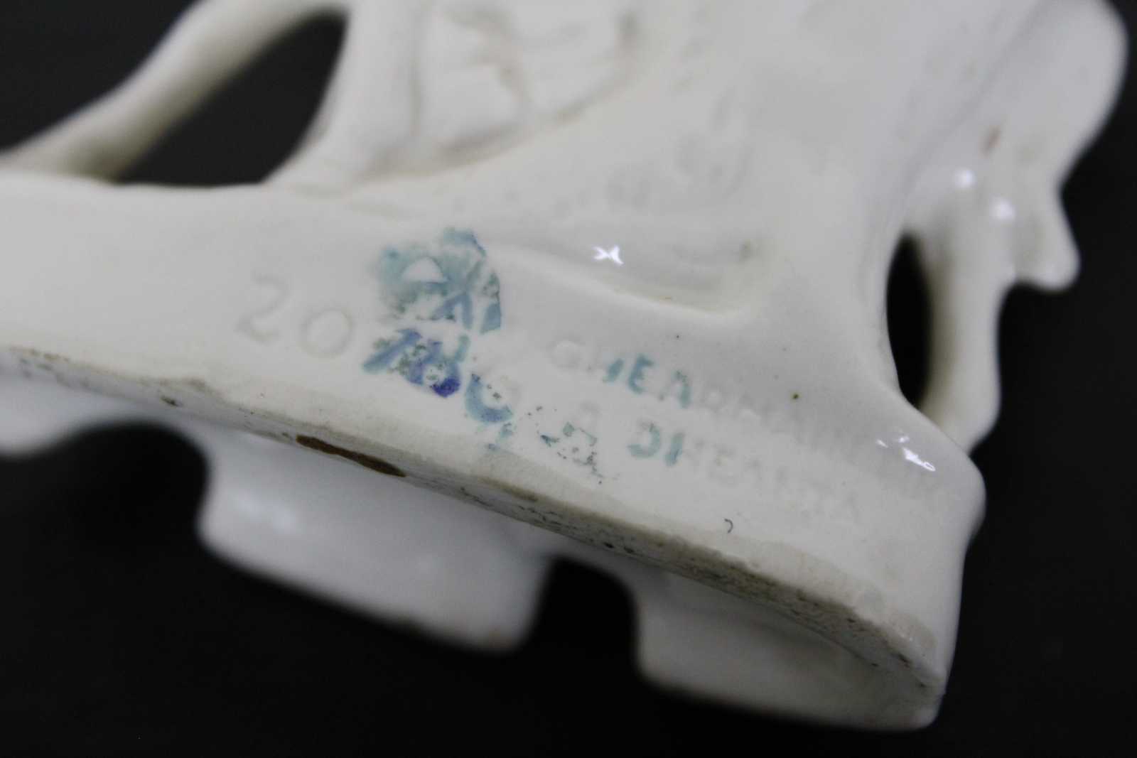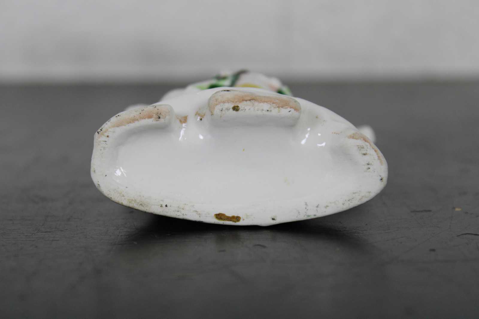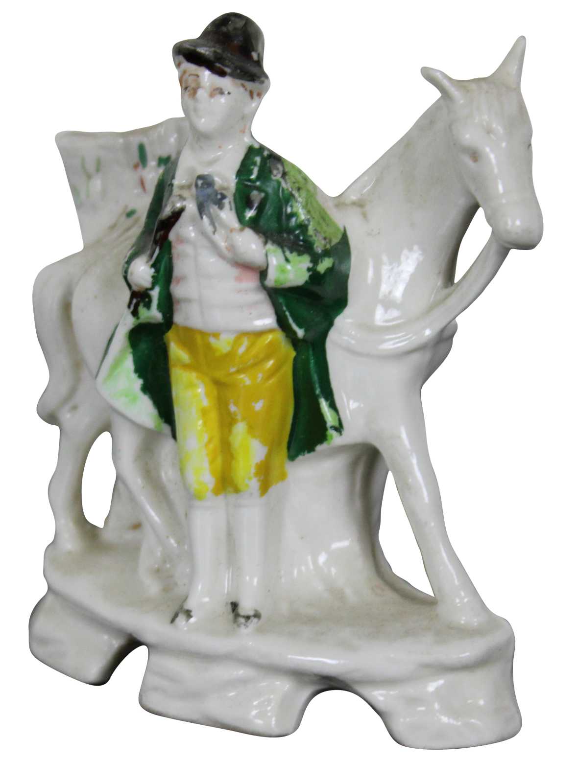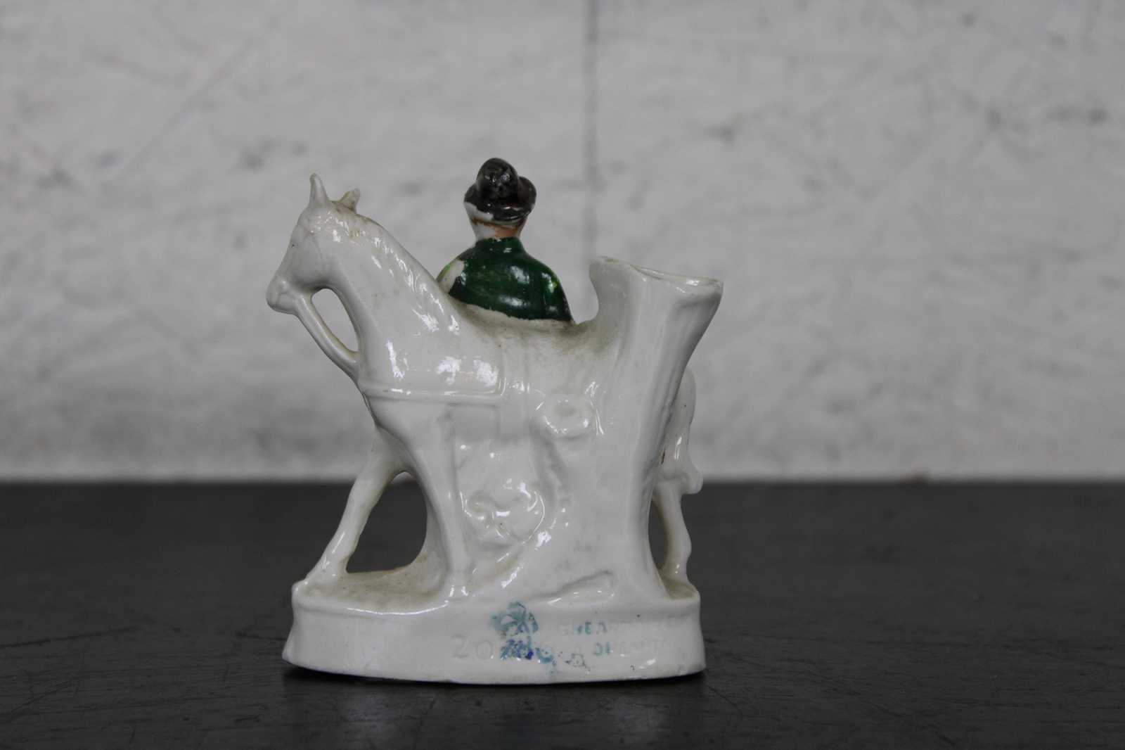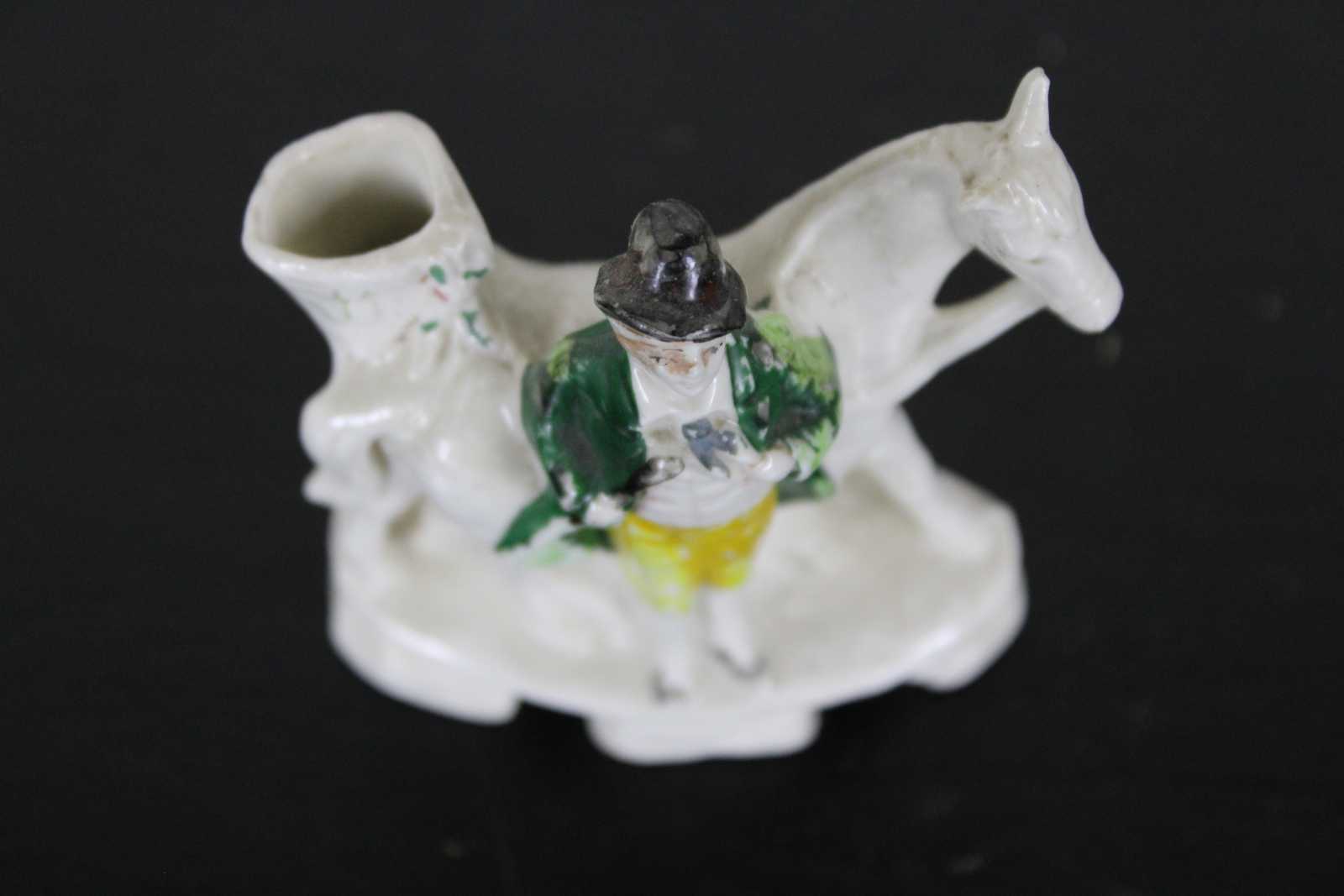 Antique 19th century Staffordshire porcelain miniature bud vase figurine in the shape of a gentleman standing with a horse.