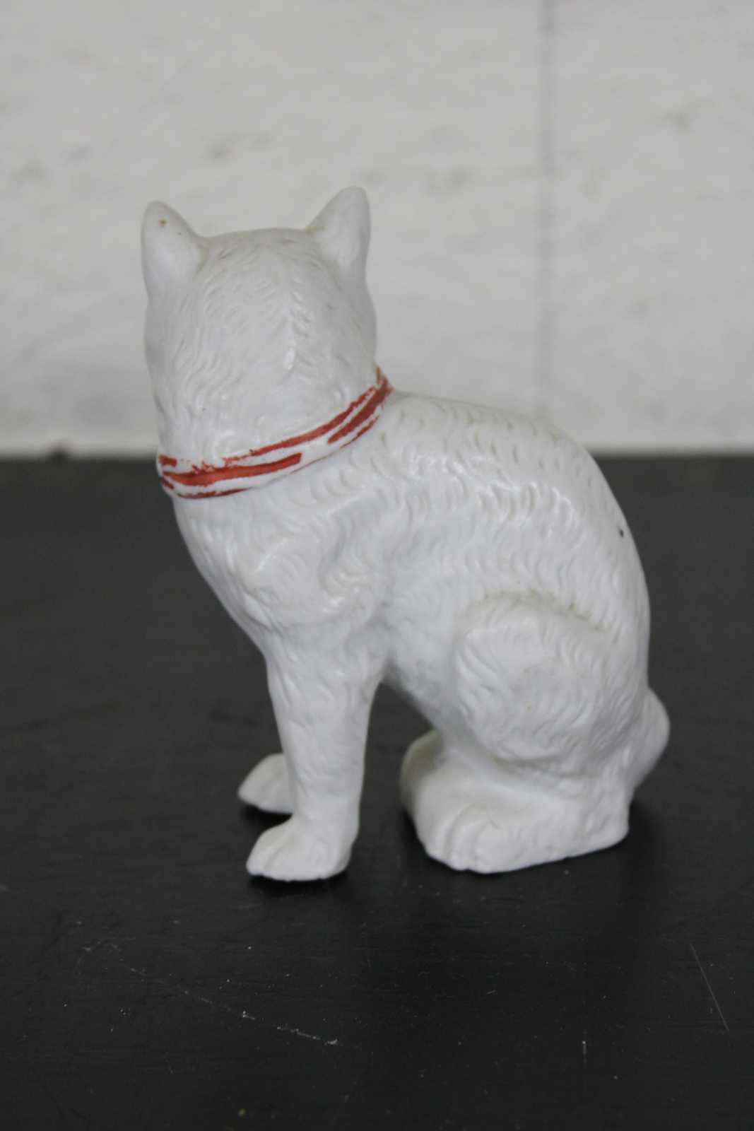 Small antique bisque figurine in the shape of a seated white, long haired cat, wearing a red ribbon.