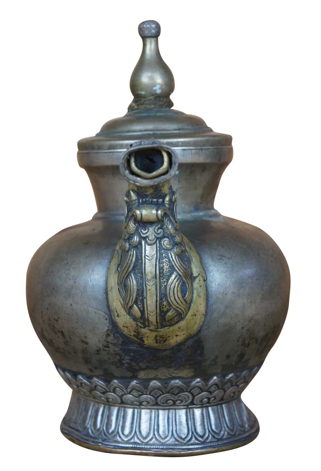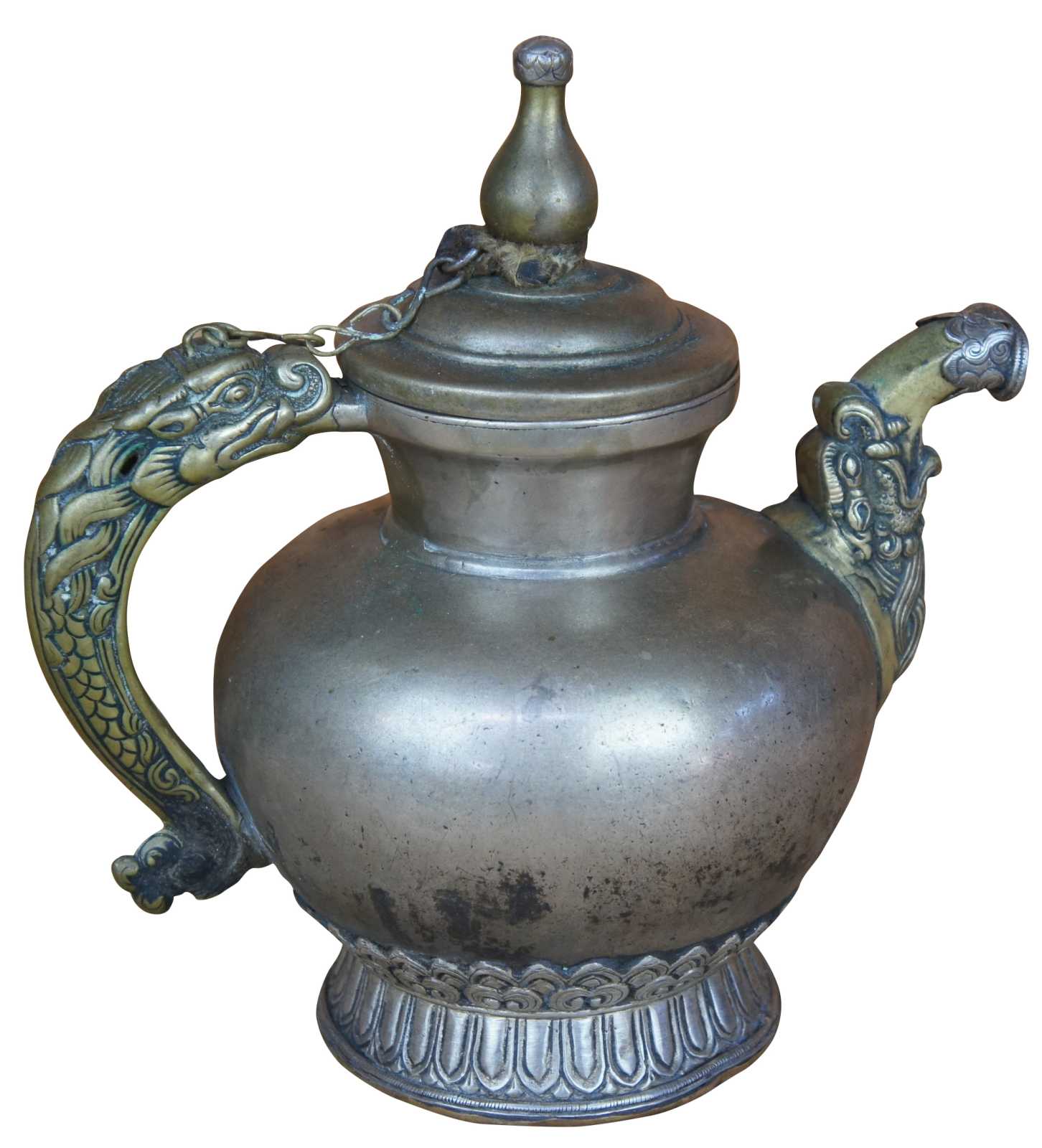 Antique 19th century teapot or kettle made from silver and brass with stylized dragon over the spout and handle.
