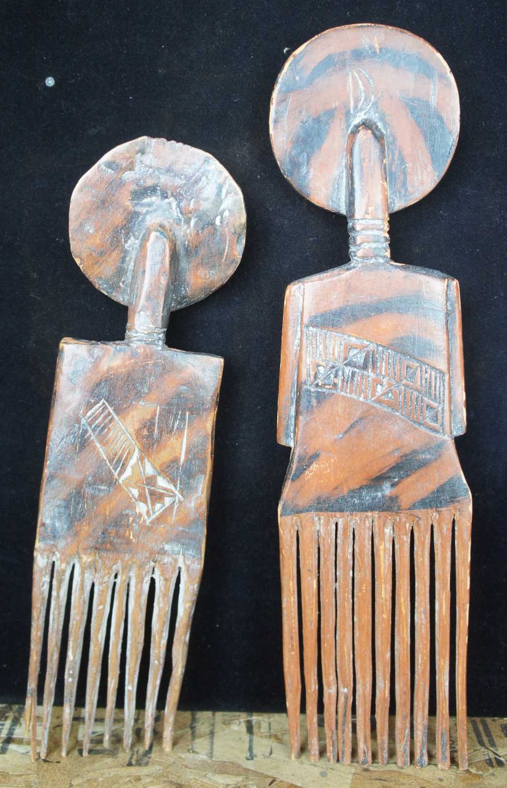 Two large female carved Ashante or Asanti wooden combs from Africa (Ghana - Ashanti tribe).