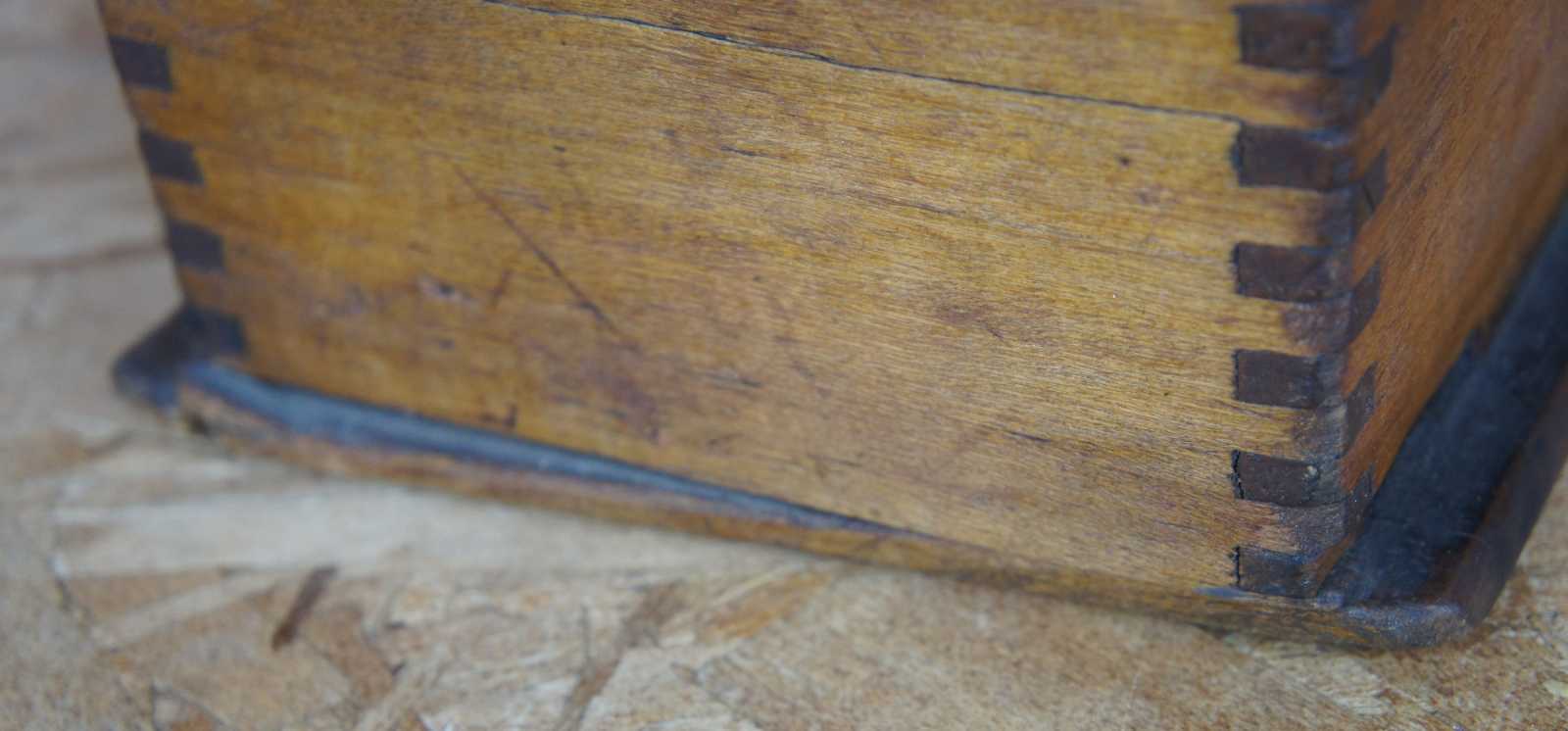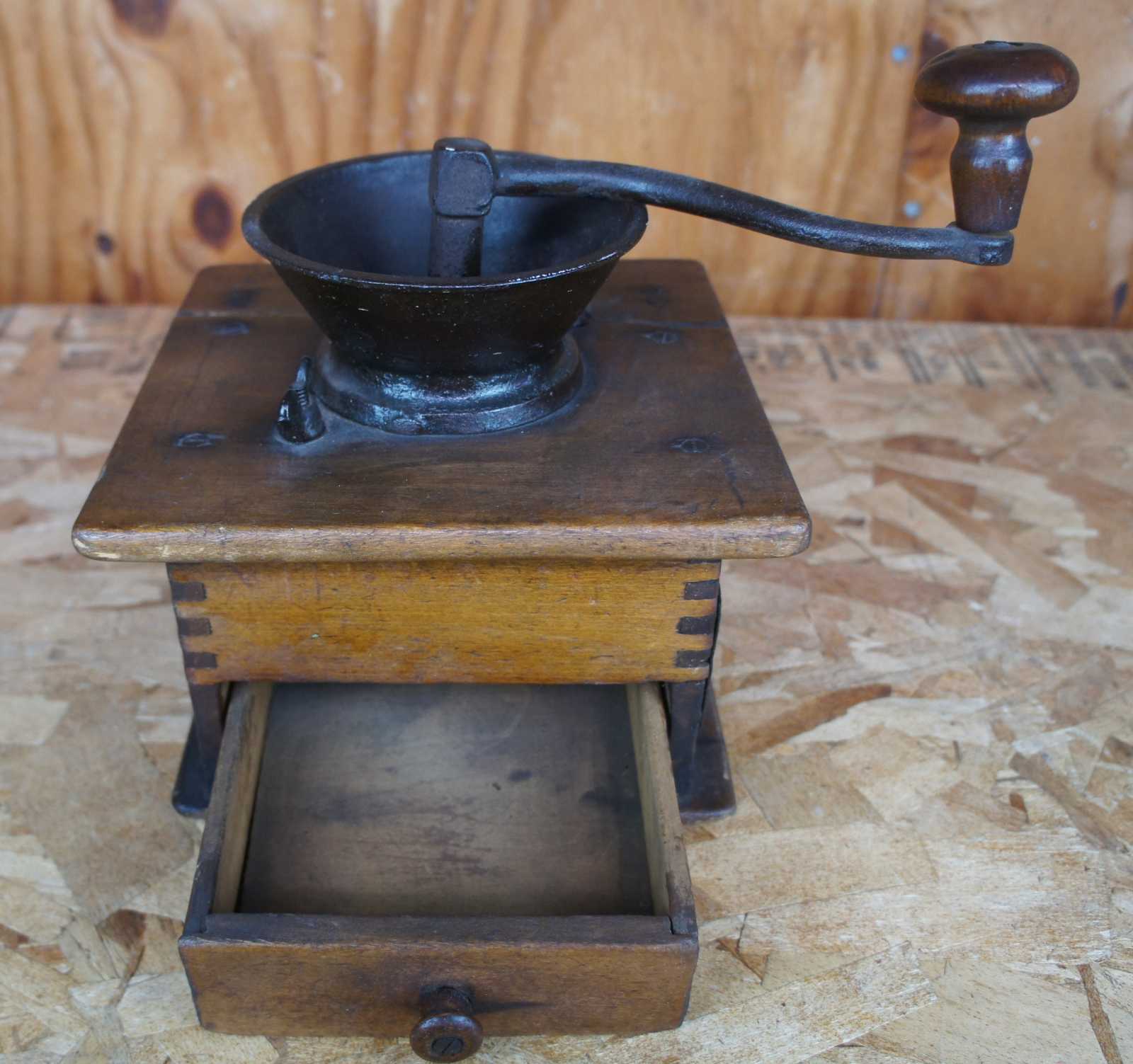 Antique cast iron and dovetailed wood coffee mill bean grinder.
