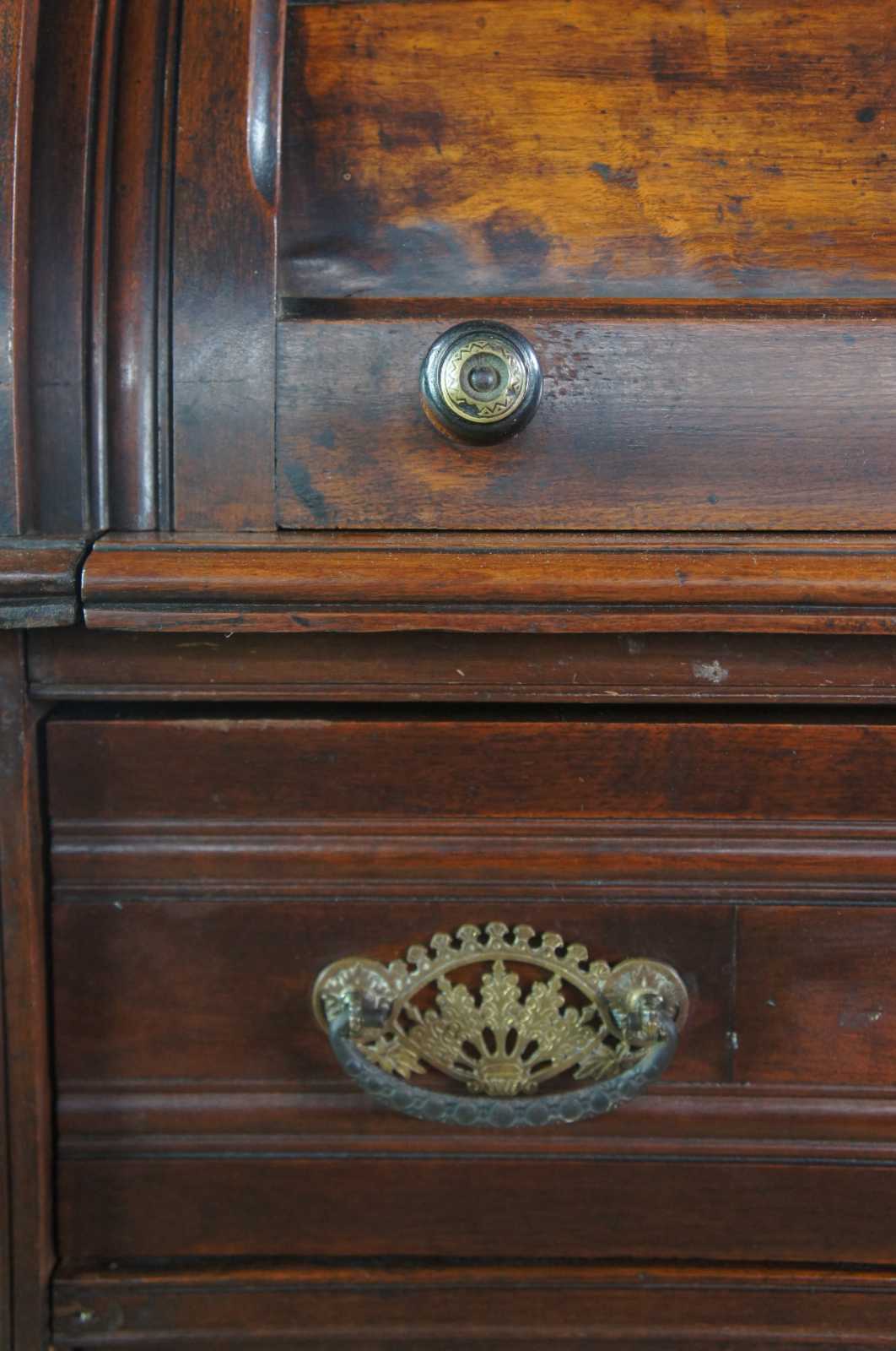 Antique Victorain period Eastlake cylinder roll top secretary writing desk, circa 1880s. Made of walnut featuring lower chest with three drawers, a half cylinder roll top that opens to pullout writing surface with multiple drawers and cubbies, and aesthetic period brass hardware. Includes a key.