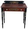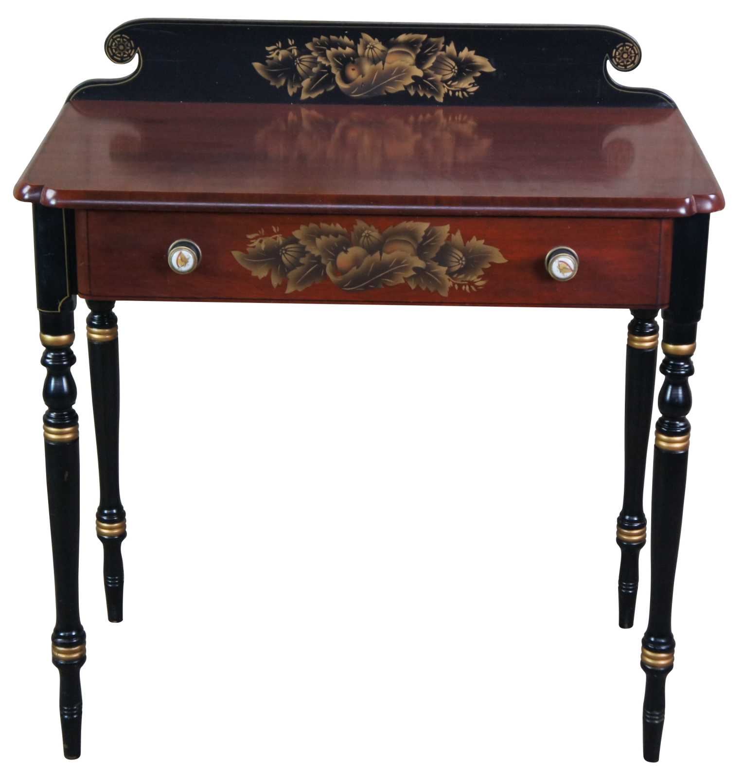 Vintage Lambert Hitchcock Black Forest stenciled Legacy writing desk or console. Made of maple featuring black ebonized finish with gold accents and stenciled arrangement of goards and vegetables. Includes porcelain knobs with an eagle carrying a flag.