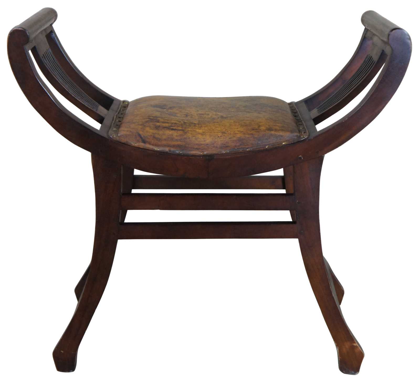 Antique early 20th Century curule chair. Made from mahogany with saddle shaped seat leading to satted arms over flared base.