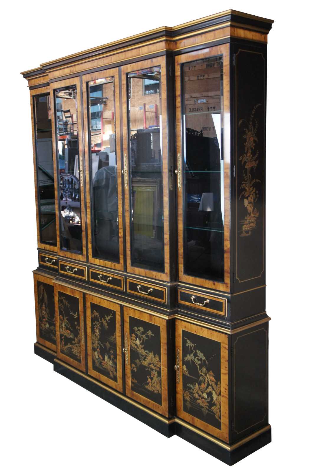 Vintage 1984 Drexel Heritage Et Cetera Chinoiserie breakfront china cabinet featuring black lacquer with gold painted accents, and pagoda mountain / water landscape scenes with geisha, fisherman, trees, and birds.