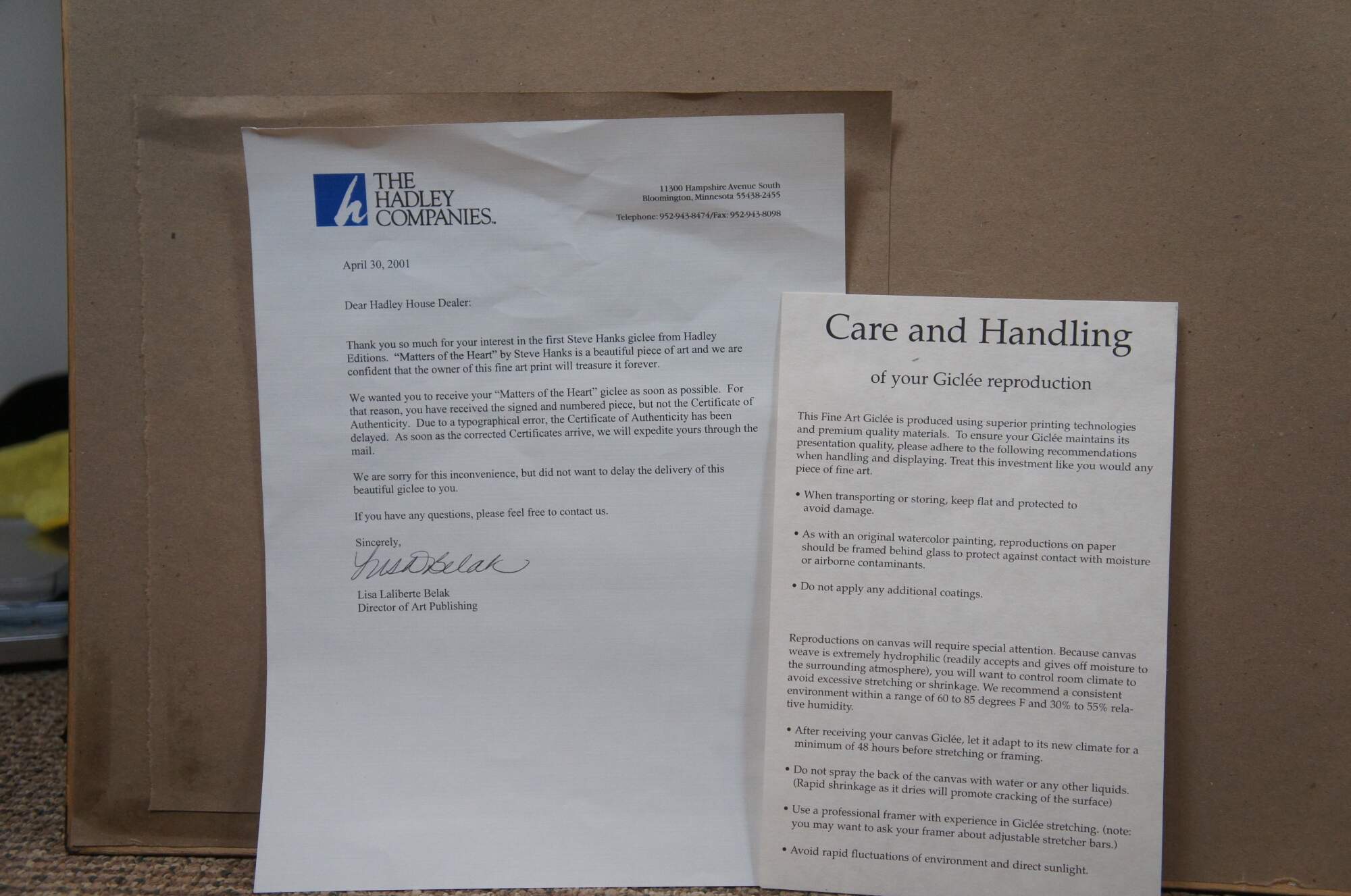 A numbered & framed lithograph by artist Steve Hanks titled ‘Comforting the Heart’ depicts a young woman resting on a chiase lounge. Framed in a victorian revival oak and gold toned frame. Comes with original papwork.