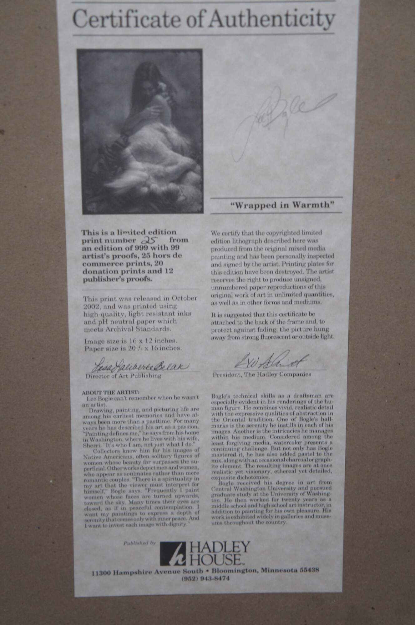 This numbered lithograph by artist Lee Bogle depicts a native american woman, is titled ‘Wrapped in Warmth’ and comes with a certificate of authenticity.