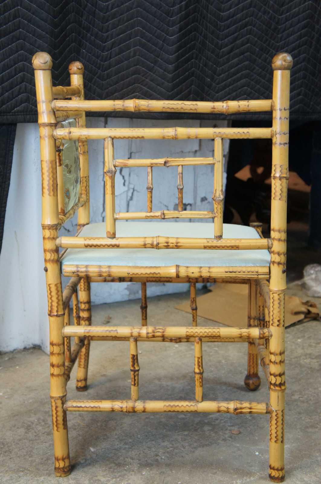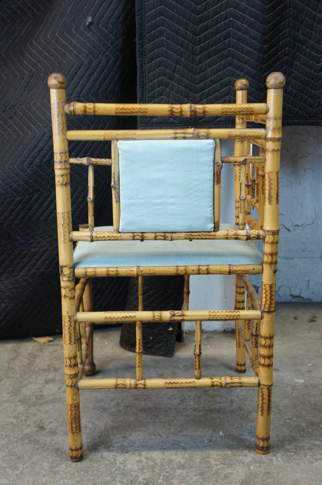 Scorched bamboo Victorian corner chair, circa 1900s. Features silk upholstery with a dragon scene along the seat back. The geometric frame is neatly accented by ball finials.