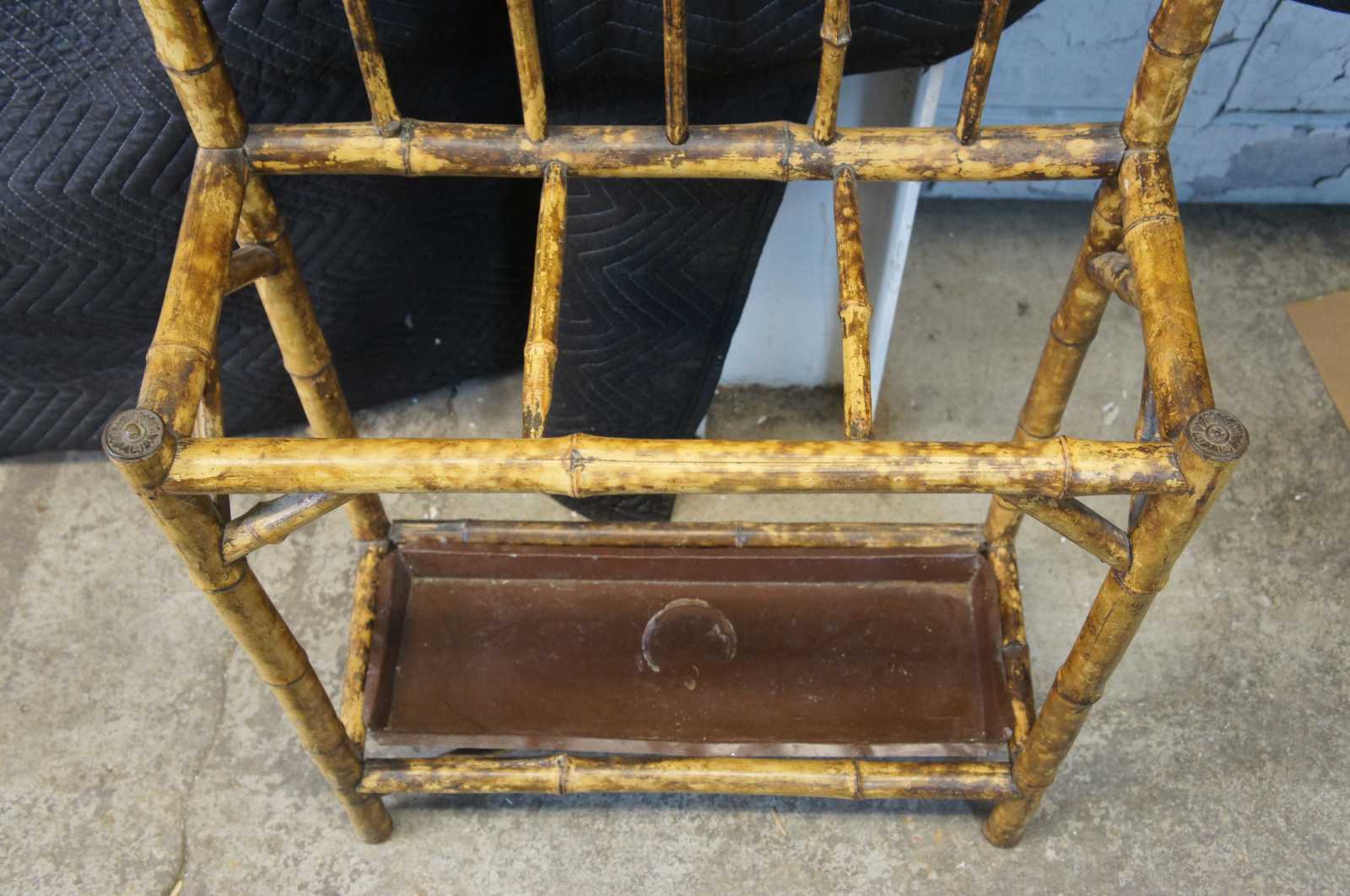 Circa 1880s Aesthetic Movement Hall Tree. Made from scorched bamboo with beveled mirror, 6 coat or hat holders, and 3 compartments for canes or umbrellas. Includes a metal pan along the base. The perfect addition to any victorian era, modern or boho chic space.