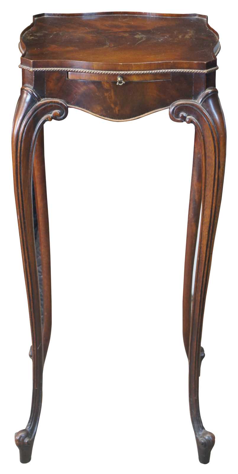 Circa 1940s mahogany pedestal or tray table. A neat mix of English and French Styling. Features flame mahogany top and apron over long cabriole legs leading to scrolled peg feet. Includes a rope twisted trim and inset top.