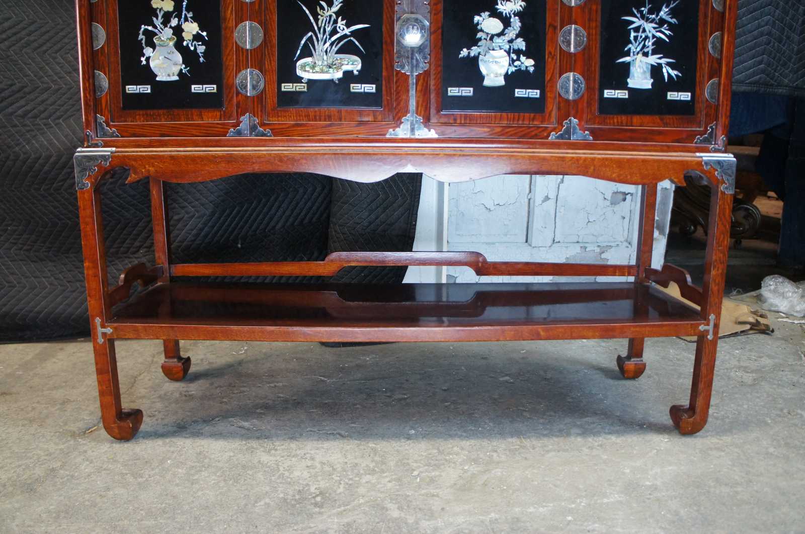 An exquisite chinese chest or cabinet on stand. A rectangular form made from elm with vibrant mother of pearl inlay set within black cabinet and drawer fronts. Neatly accented with silvertone hardware. The cabinet features four upper drawers and lower cabinet with lock Lower cabinet opens to a central space that shows a glimpse of two hidden drawers. Each drawer is revealed when the cabinet doors are slid towards the middle. The cabinet is supported by a ming style base.