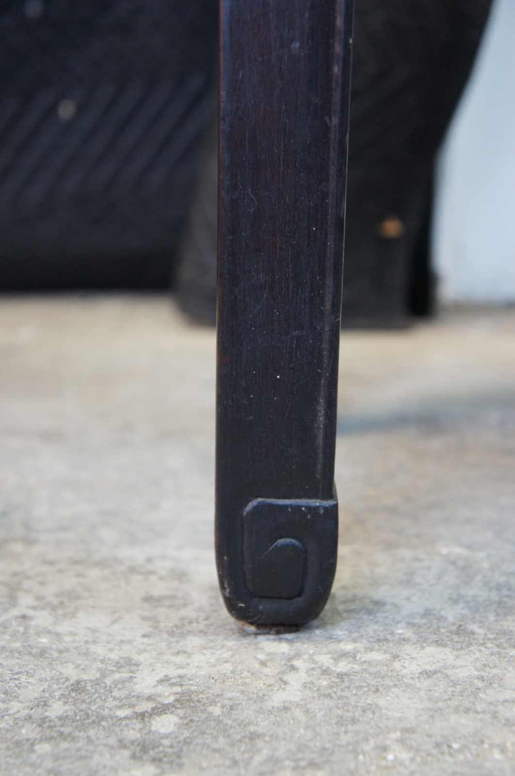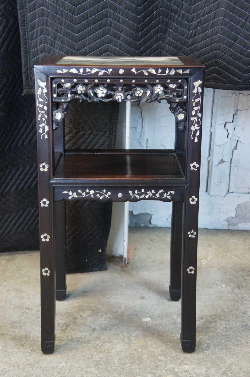 A rare and impressive early Qing dynasty marked 19th Century Chinese Stand by Yi Zhang. A rectangular form made from rosewood with mortise and tenon construction featuring inset gray marble top over a mother-of-pearl inlaid and pierced foliate frieze. An exceptional design with beautiful floral inlays throughout. The stand includes an inset lower shelf over long legs with carved feet. Signed beneath the stone and along the bottom side of the table in several places.