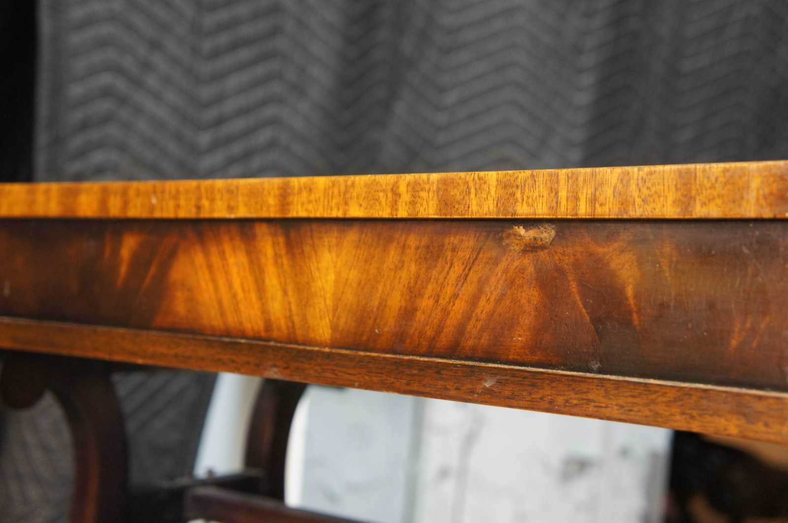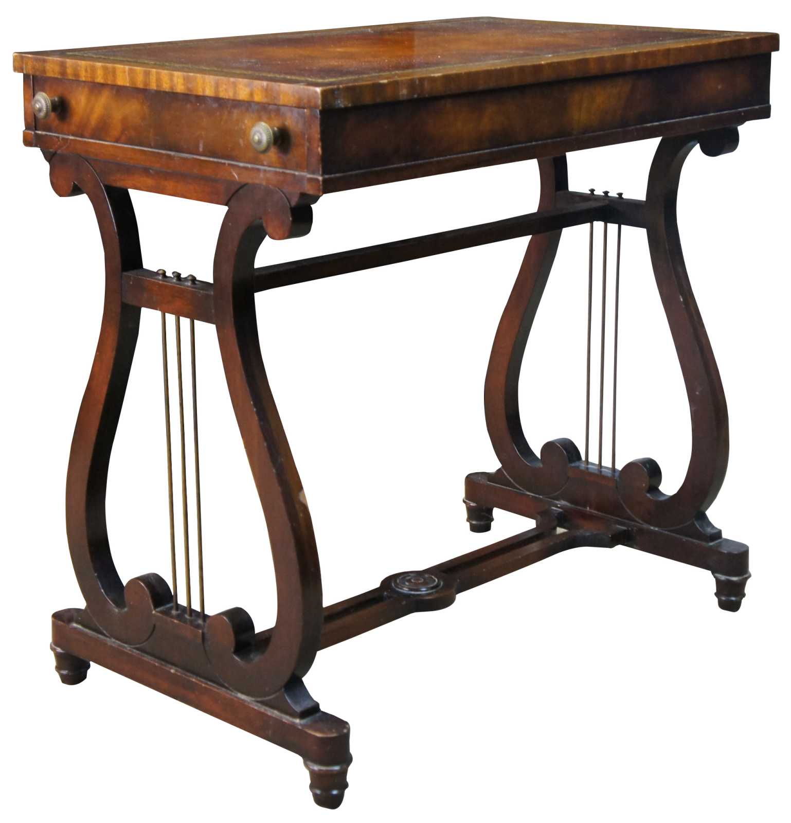 An elegant pair of Heirloom Weiman end tables, circa 1930s. Features a rectangular top with tooled leather top and drawer over a lyre shaped base. Made from mahogany with flame mahogany apron and drawer front. #9405