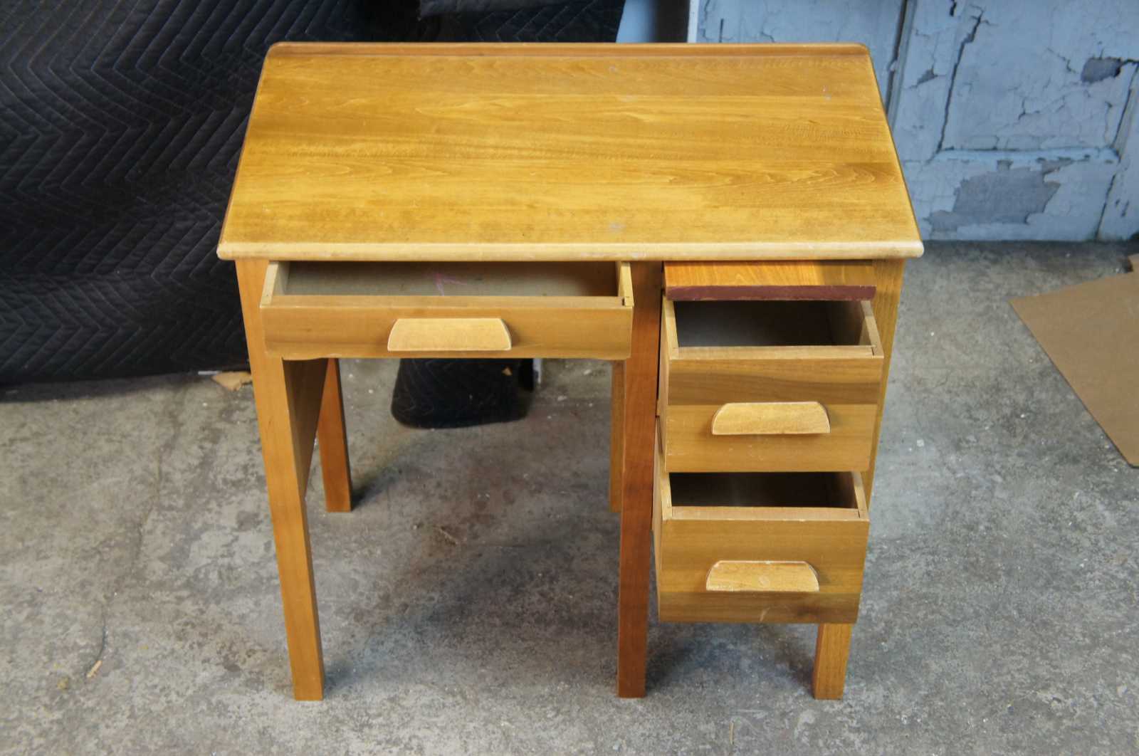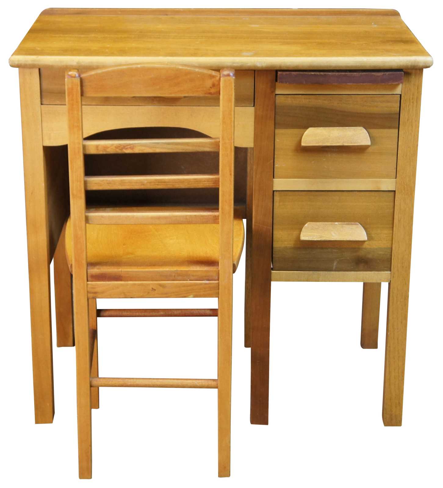 Mid 20th century childs size school desk and chair. Made from maple. Includes 3 drawers and pullout writing surface.