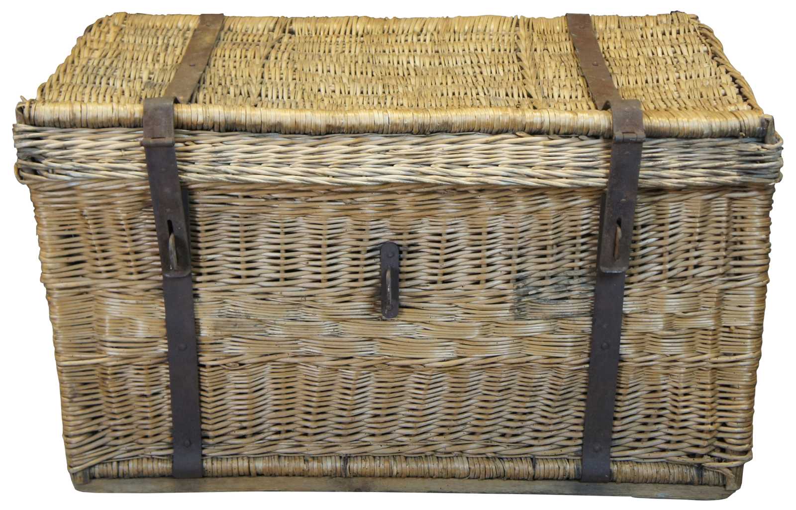 Early 20th century European wicker trunk. A nice oversized carrier with iron locking system. Features handles on each side. Great for use as a hamper, table or accent piece.