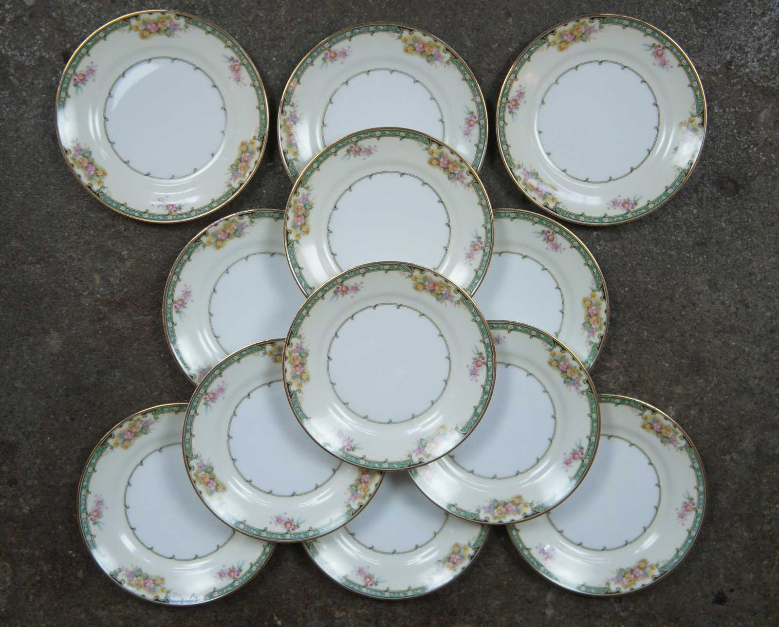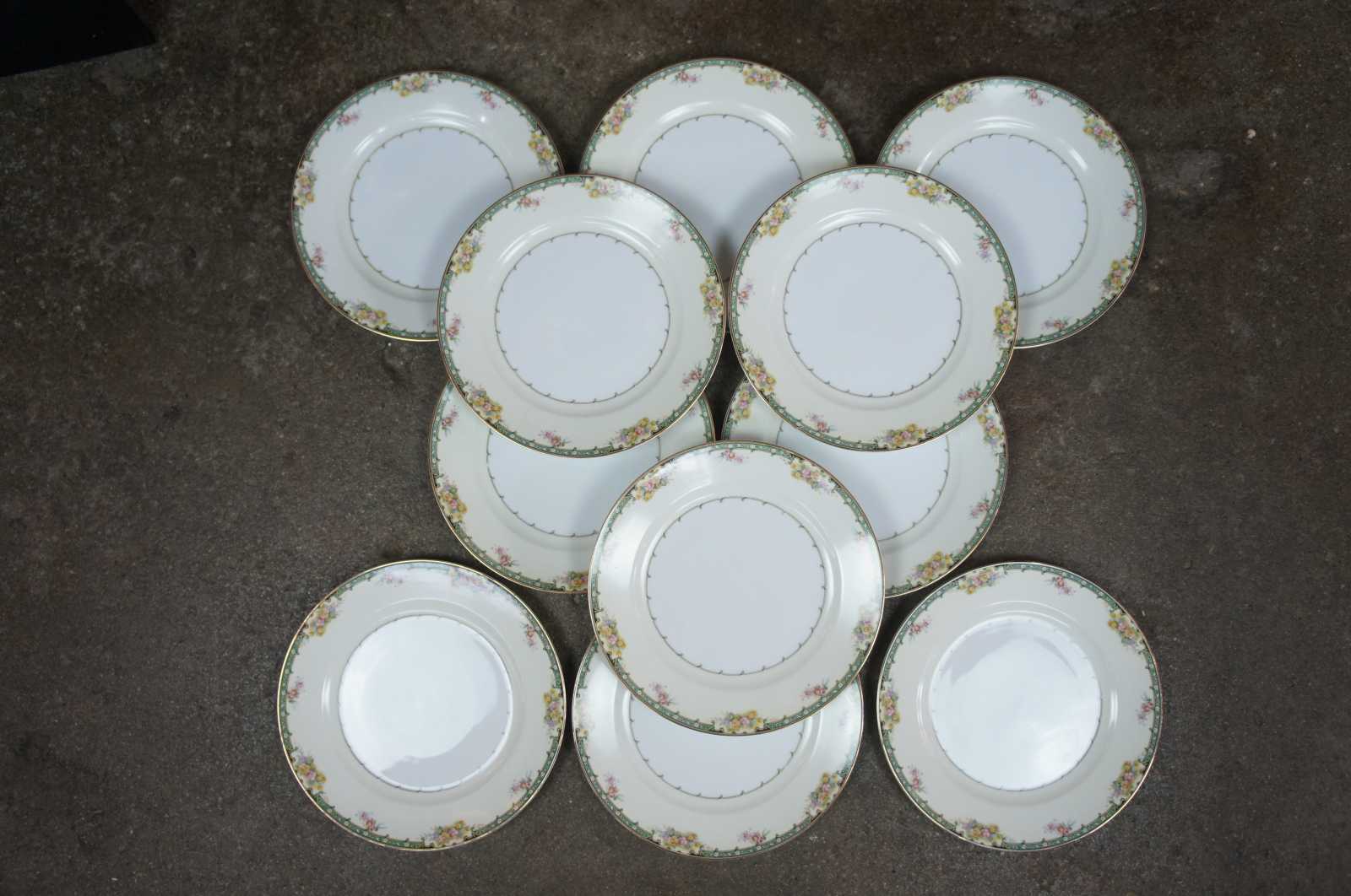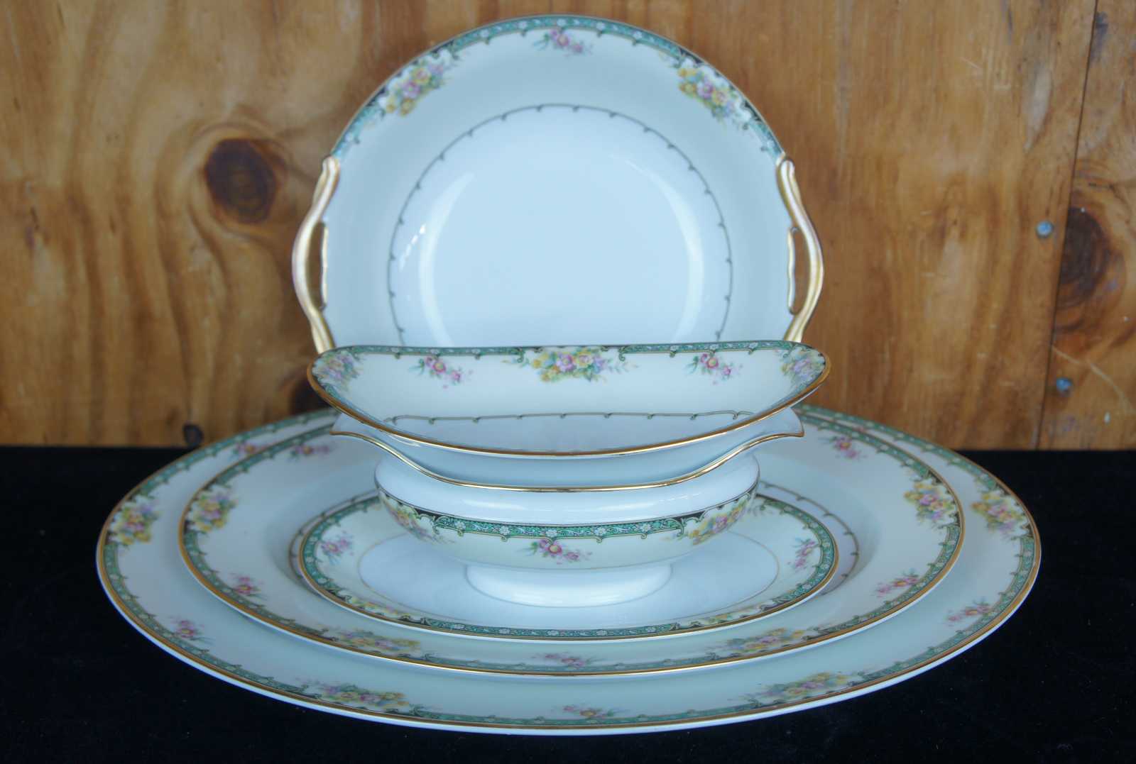 75 Piece Art Deco Era Noritake Estelle Dinnerware. White Flowers on Green Band with Florals. Production began in 1918, currently discontinued.