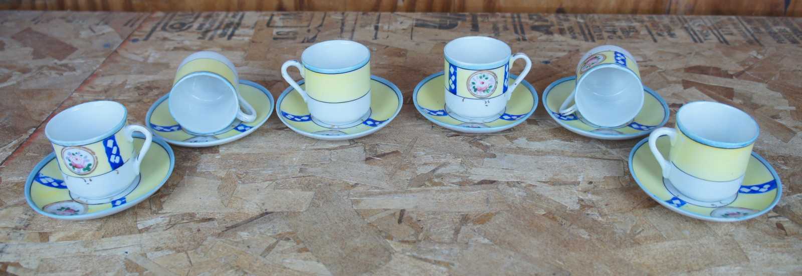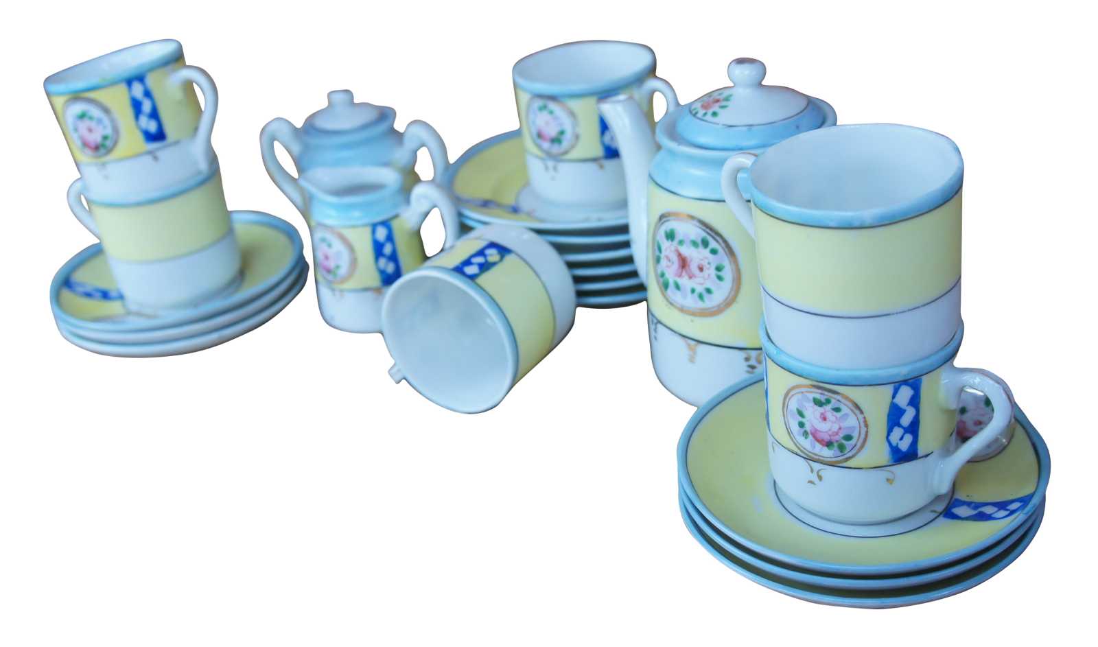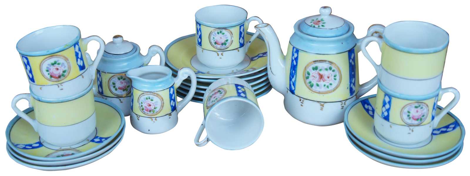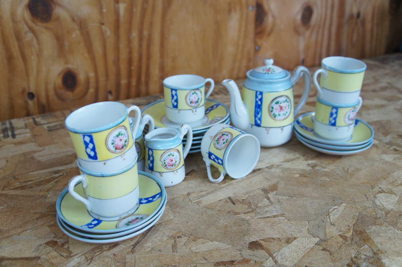 plate 6- 4.875" x 0.875"h, saucer 6- 4.25" x 0.625"h, teacups 6- 2.125" x 2.25"h, sugar- 3.75" x 2.25" x 3.5"h, creamer- 2.75" x 1.75" x 2.5"h, teapot- 5.5" x 3" x 4.75"h