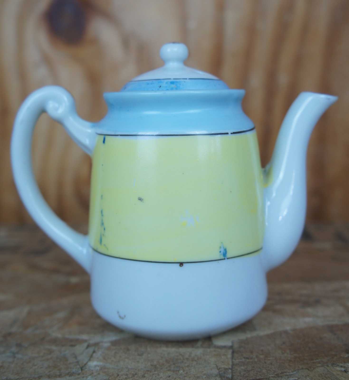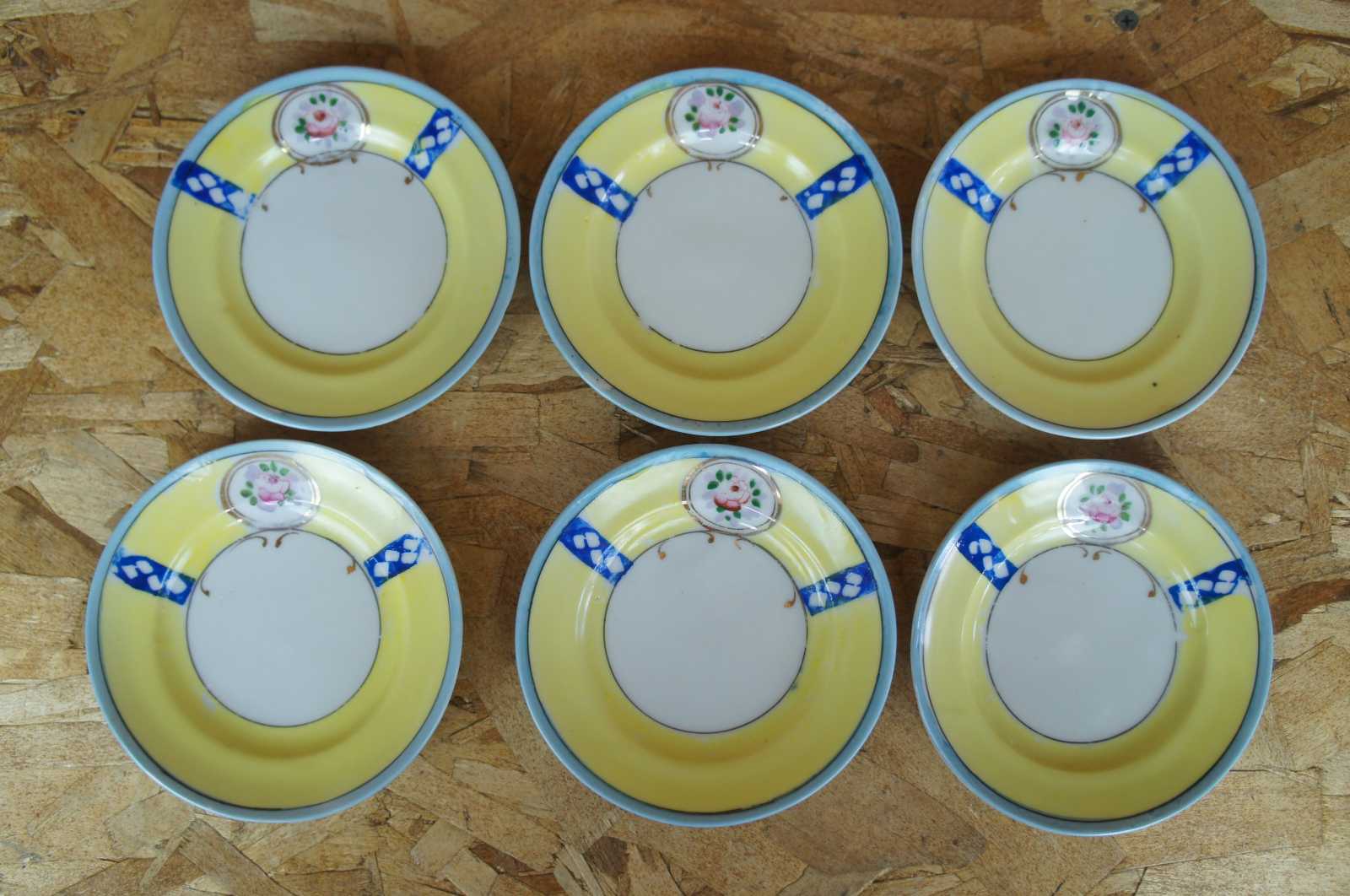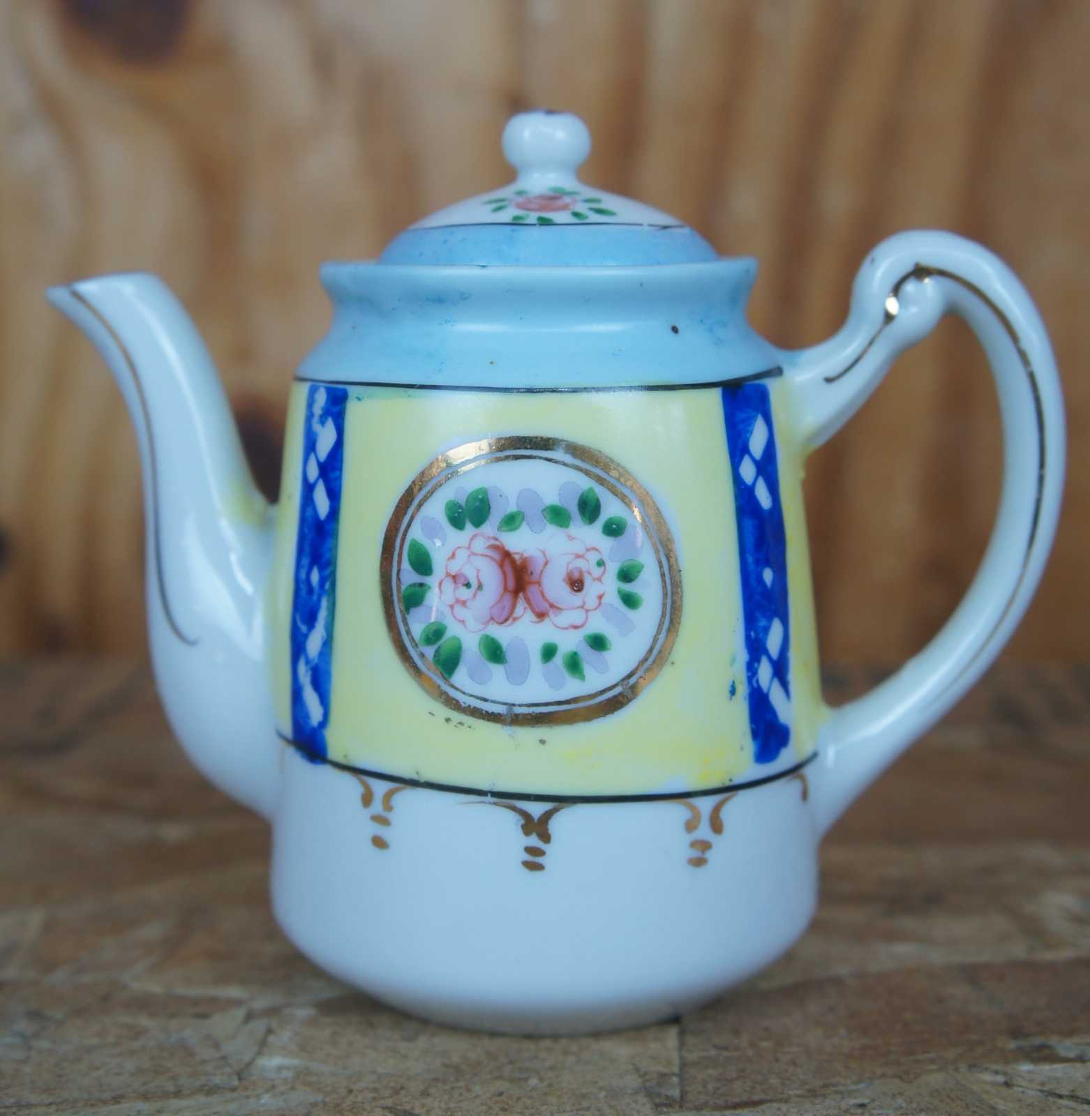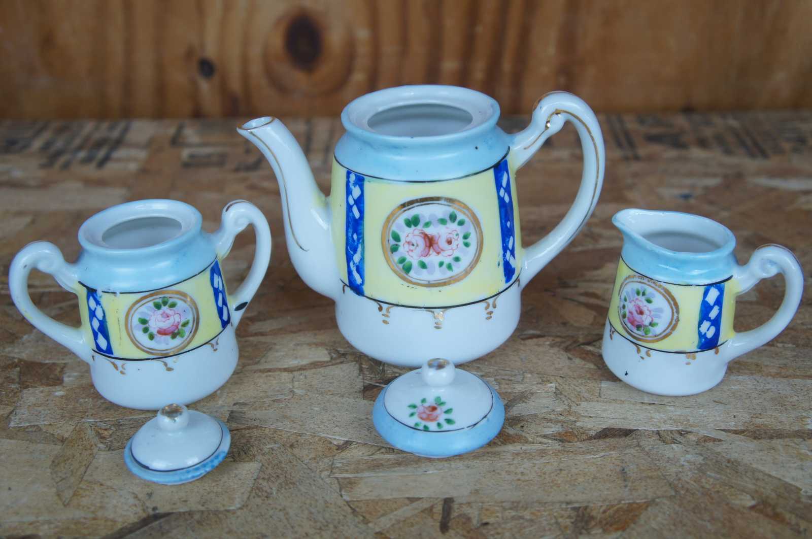 plate 6- 4.875" x 0.875"h, saucer 6- 4.25" x 0.625"h, teacups 6- 2.125" x 2.25"h, sugar- 3.75" x 2.25" x 3.5"h, creamer- 2.75" x 1.75" x 2.5"h, teapot- 5.5" x 3" x 4.75"h