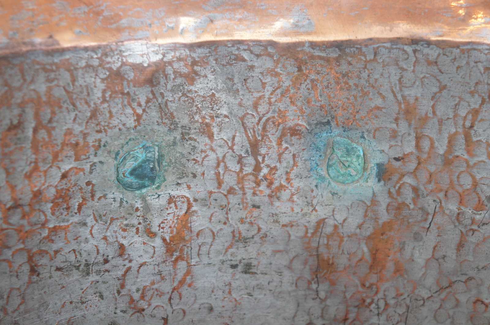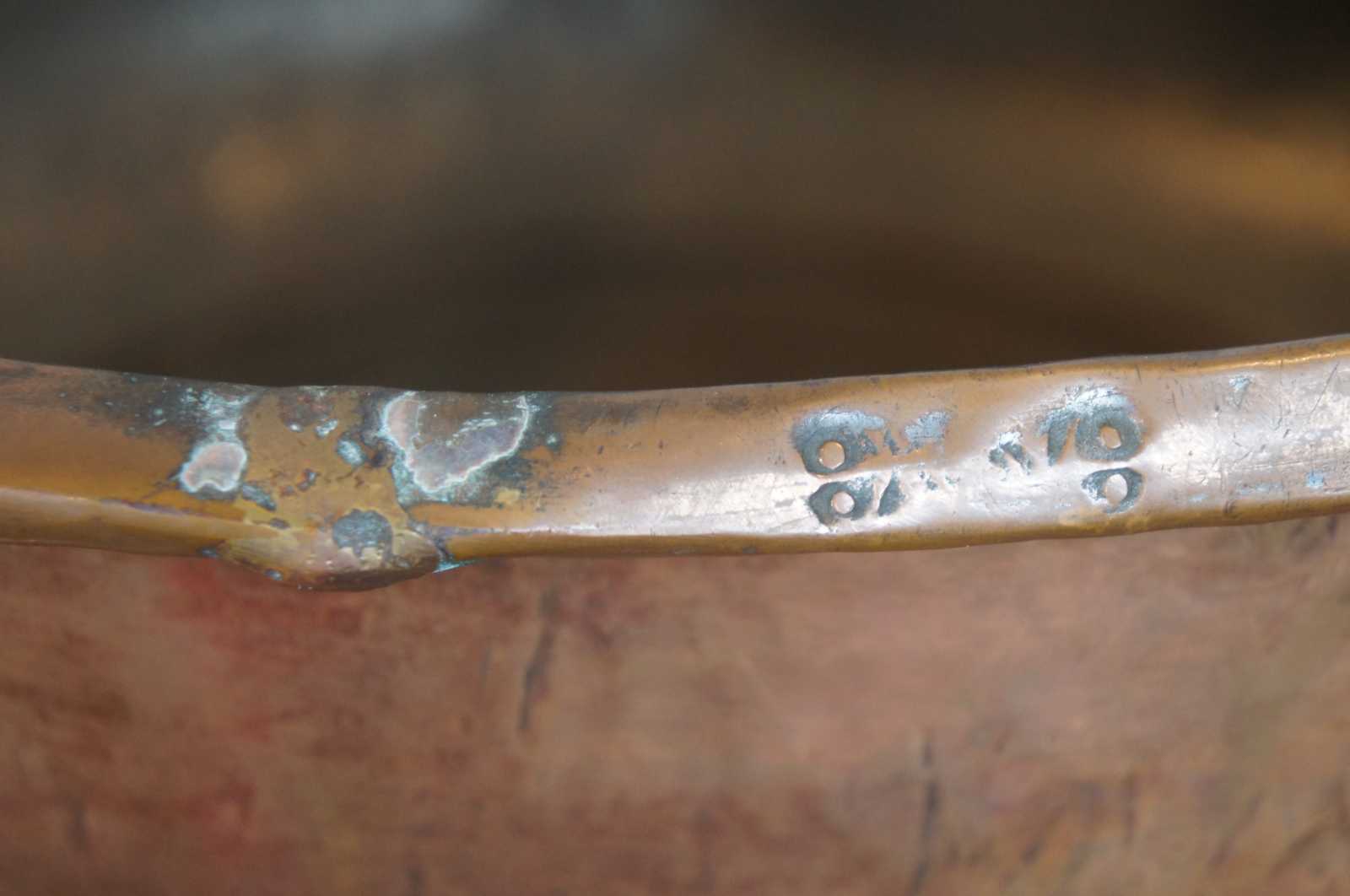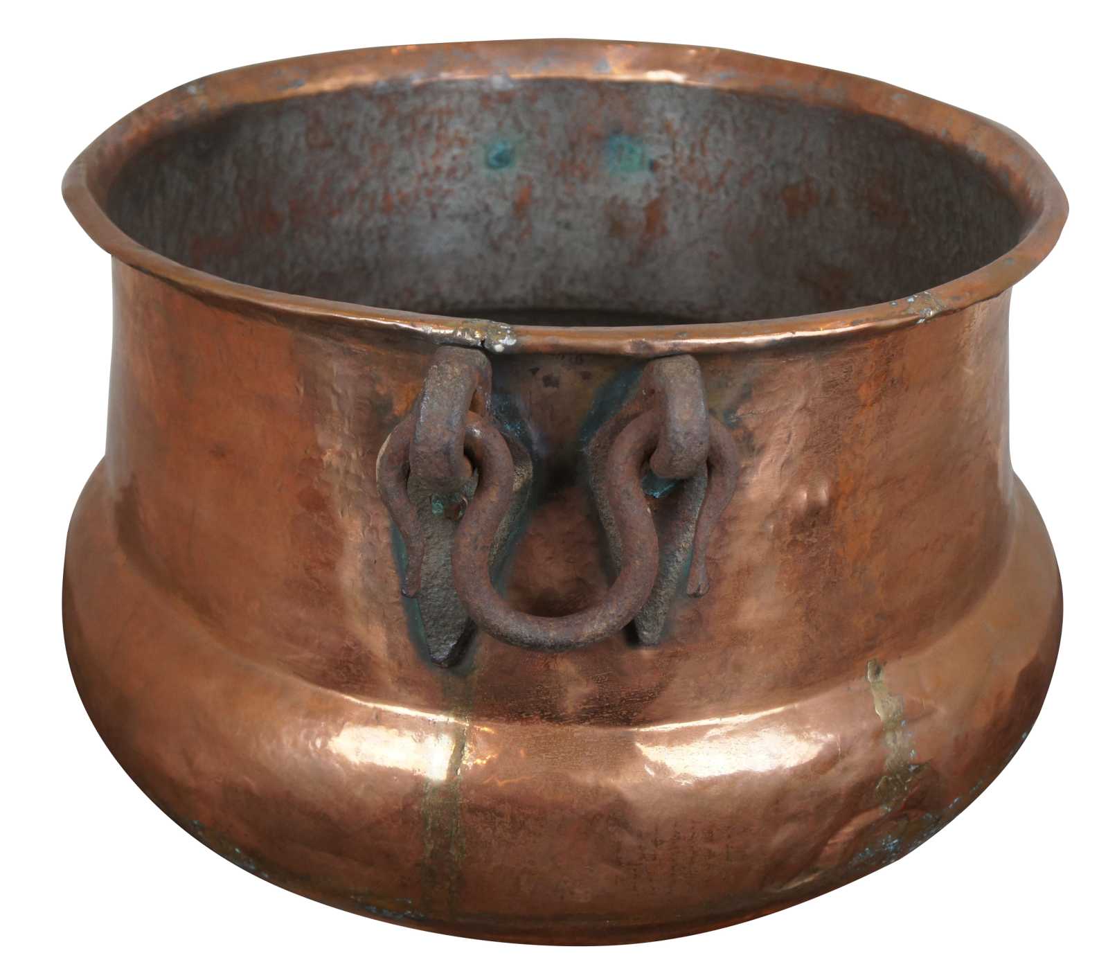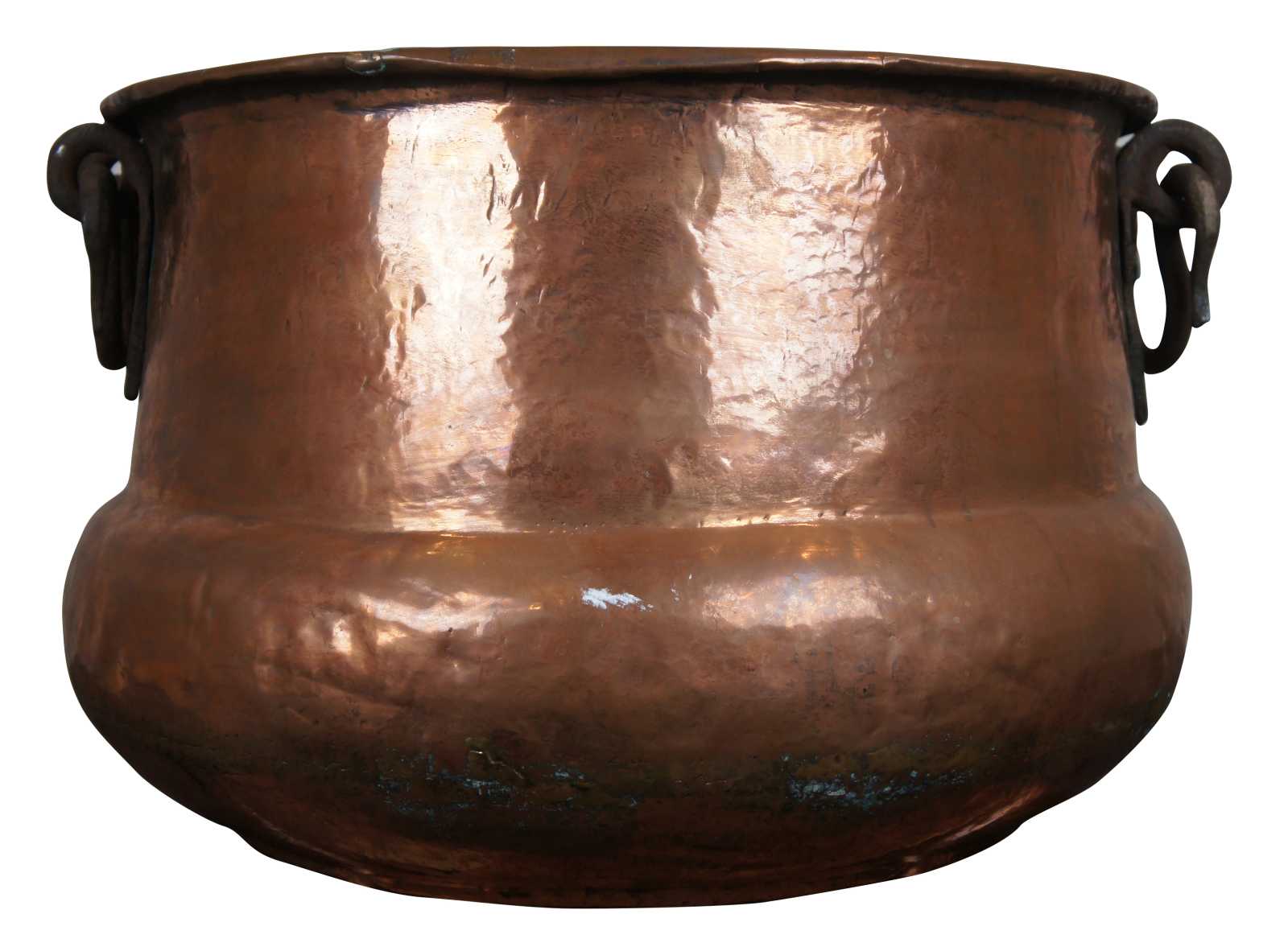 Monumental antique copper cauldron featuring hammered details with dovetailing and ornate forged iron handles.