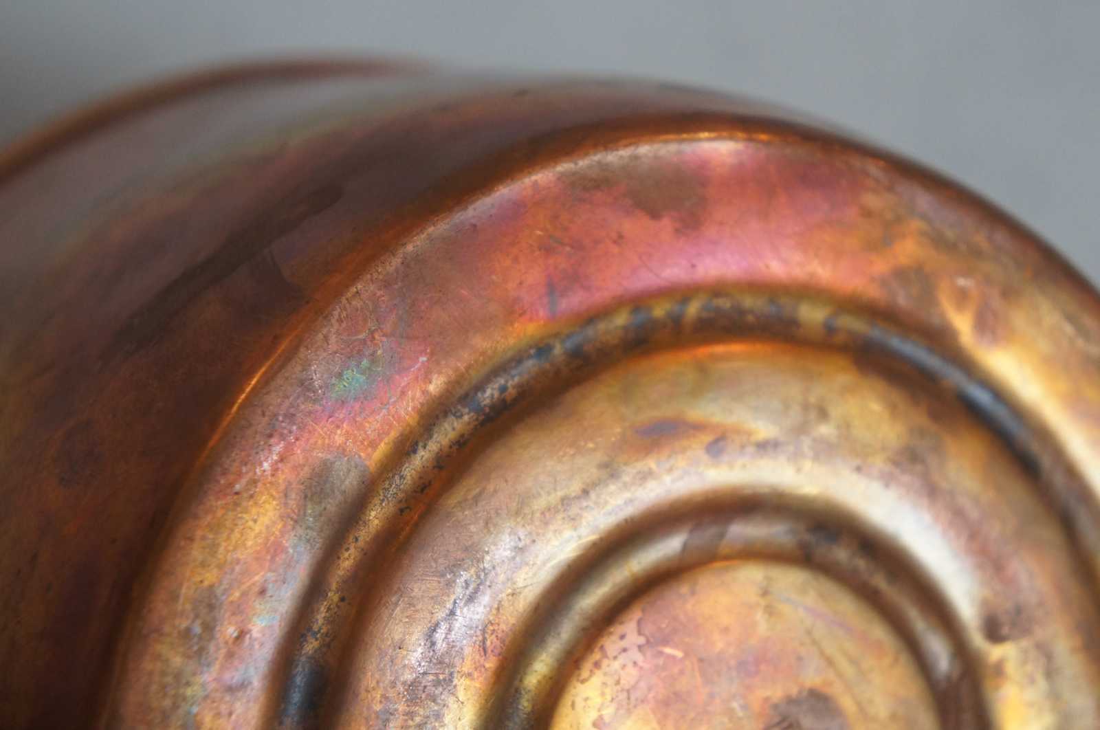 Antique copper tea kettle or pot featuring ornate styling with acorn finial. Made in England by Linton, circa 120s-1940s.