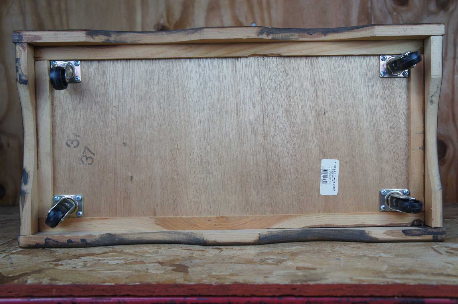 Vintage pine rolling storage chest or trunk featuring early american styling with serpentine skirt and hinged lid. Made by Mill Store of New Bedford Massachusetts.