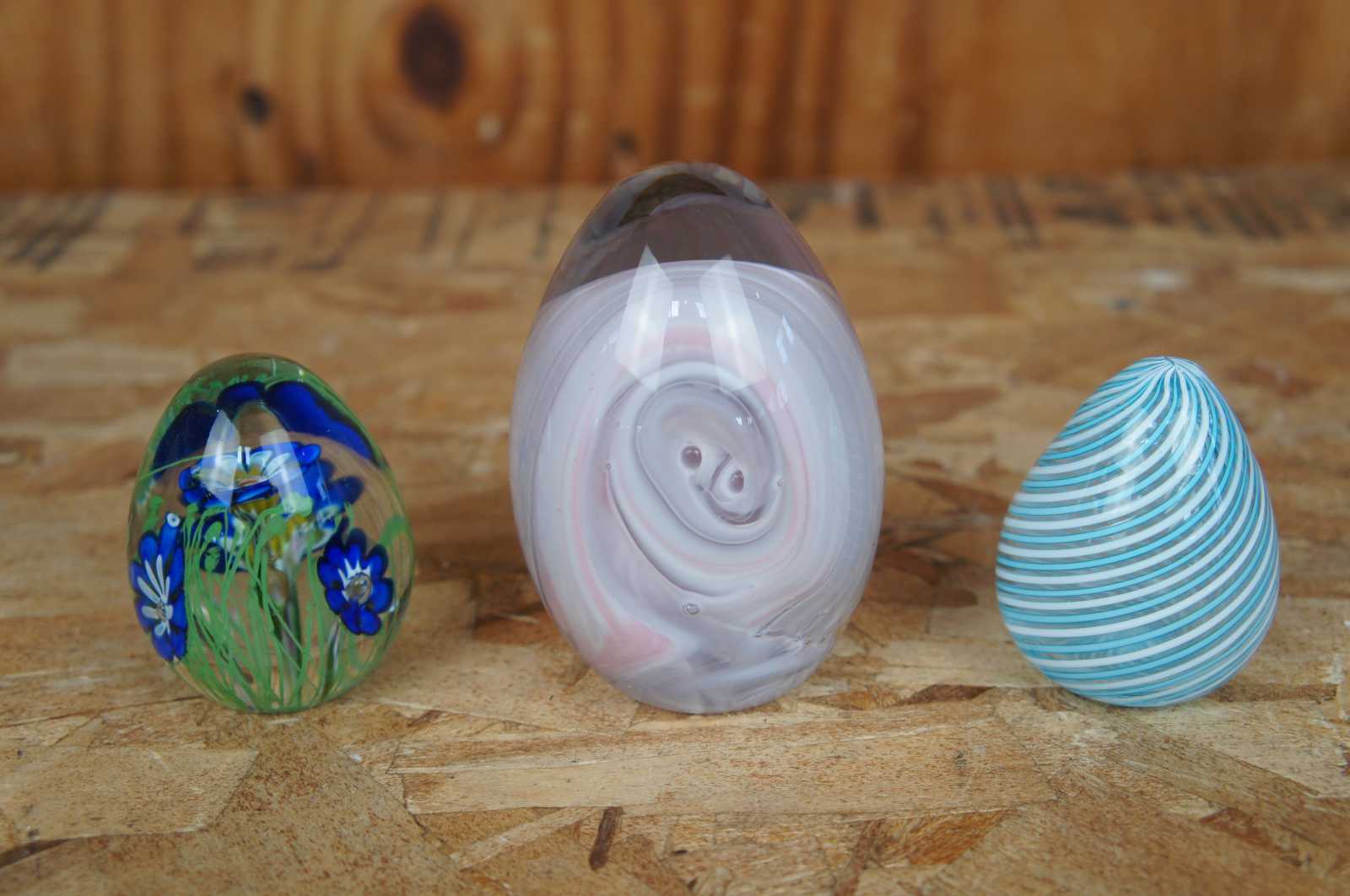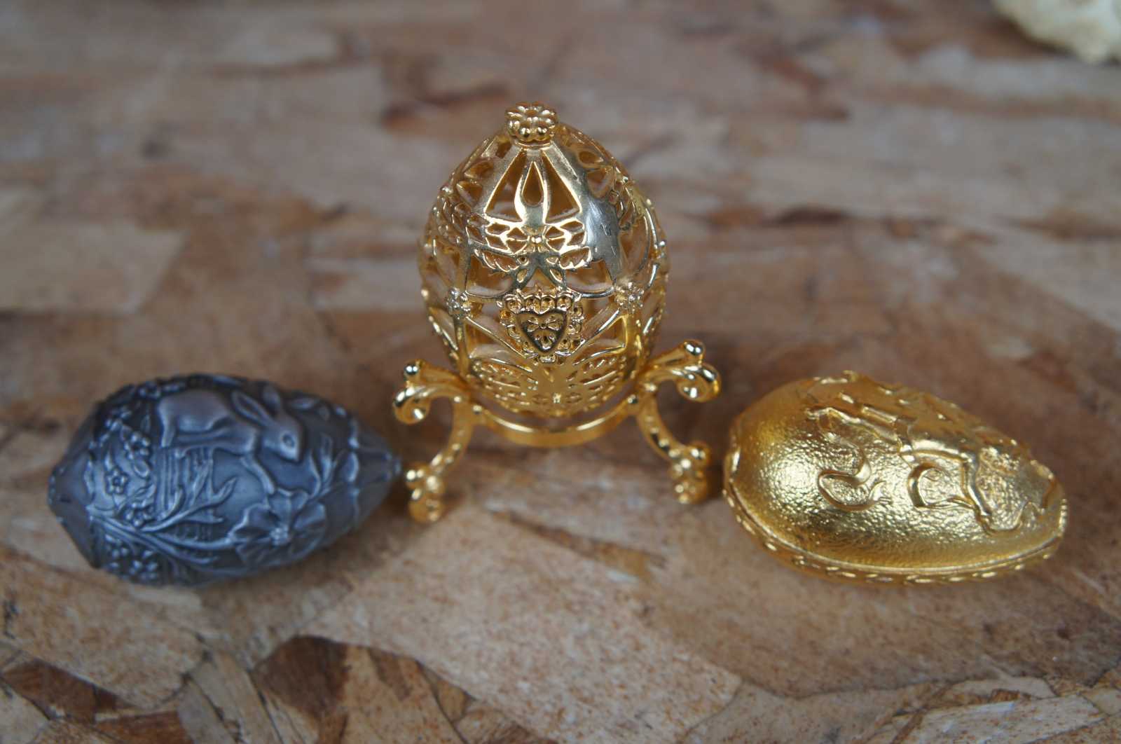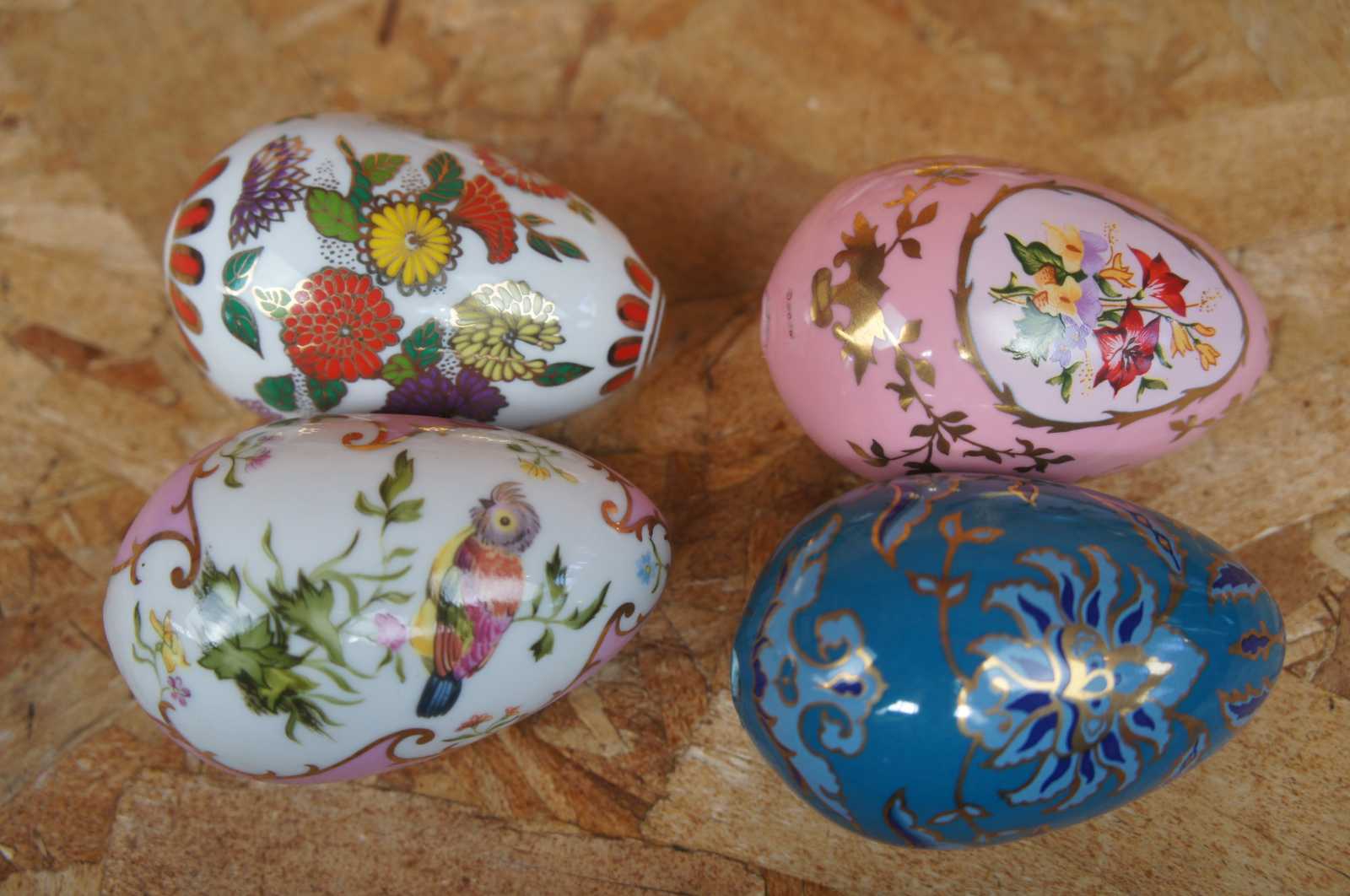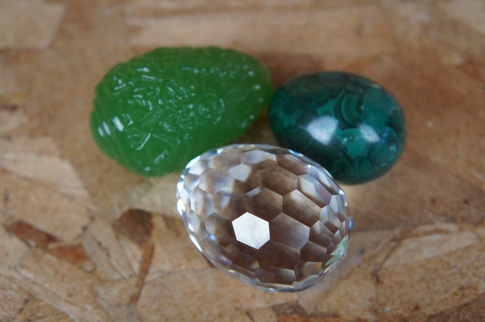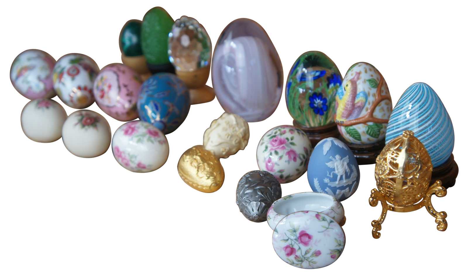Twenty one vintage ornamental eggs made of various materials including glass, painted ceramic, polished marble, enameled cloisonne, faceted, jade, reticulated metal, wedgwood style, pewter, and carved wooden holders.