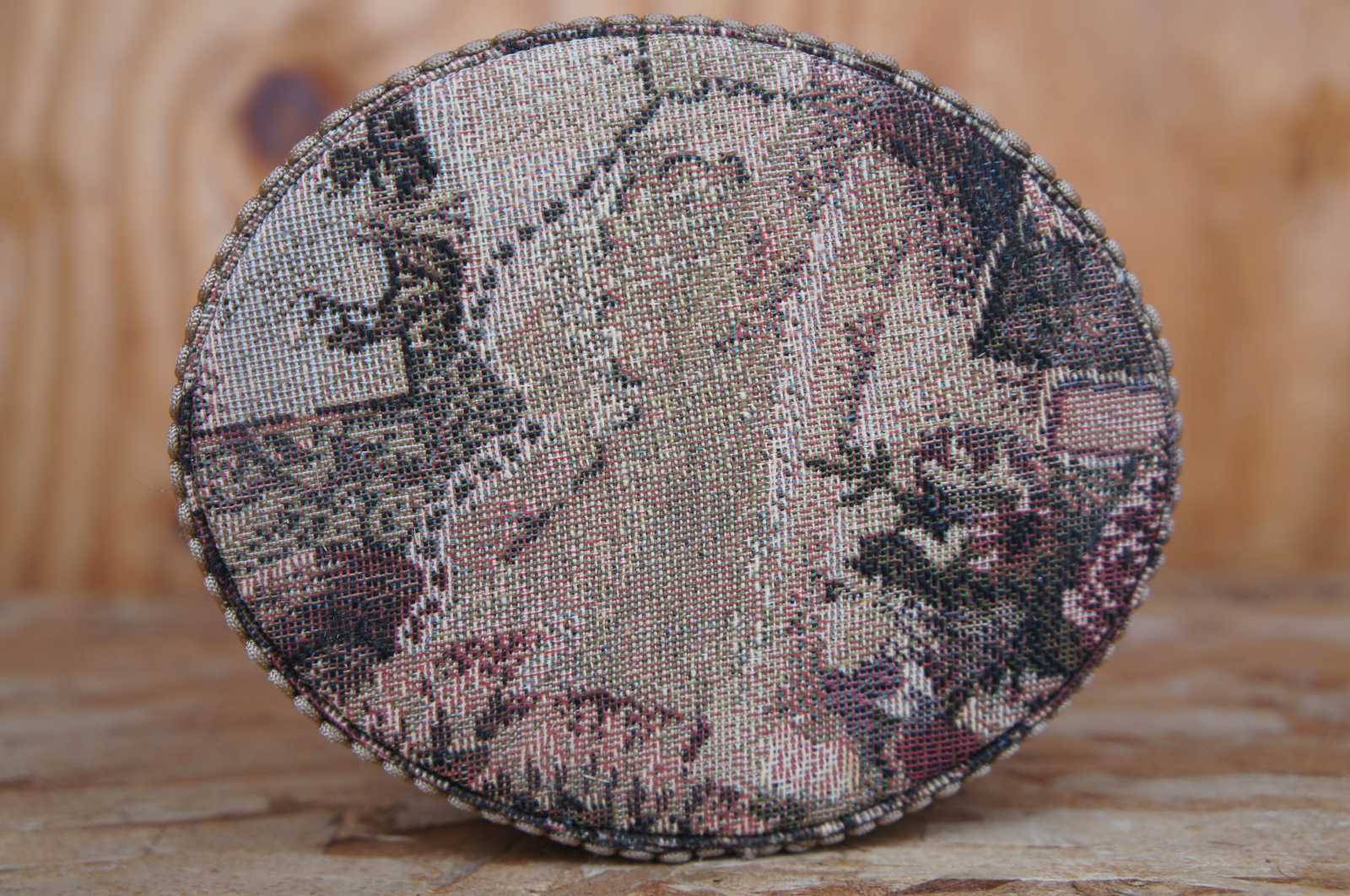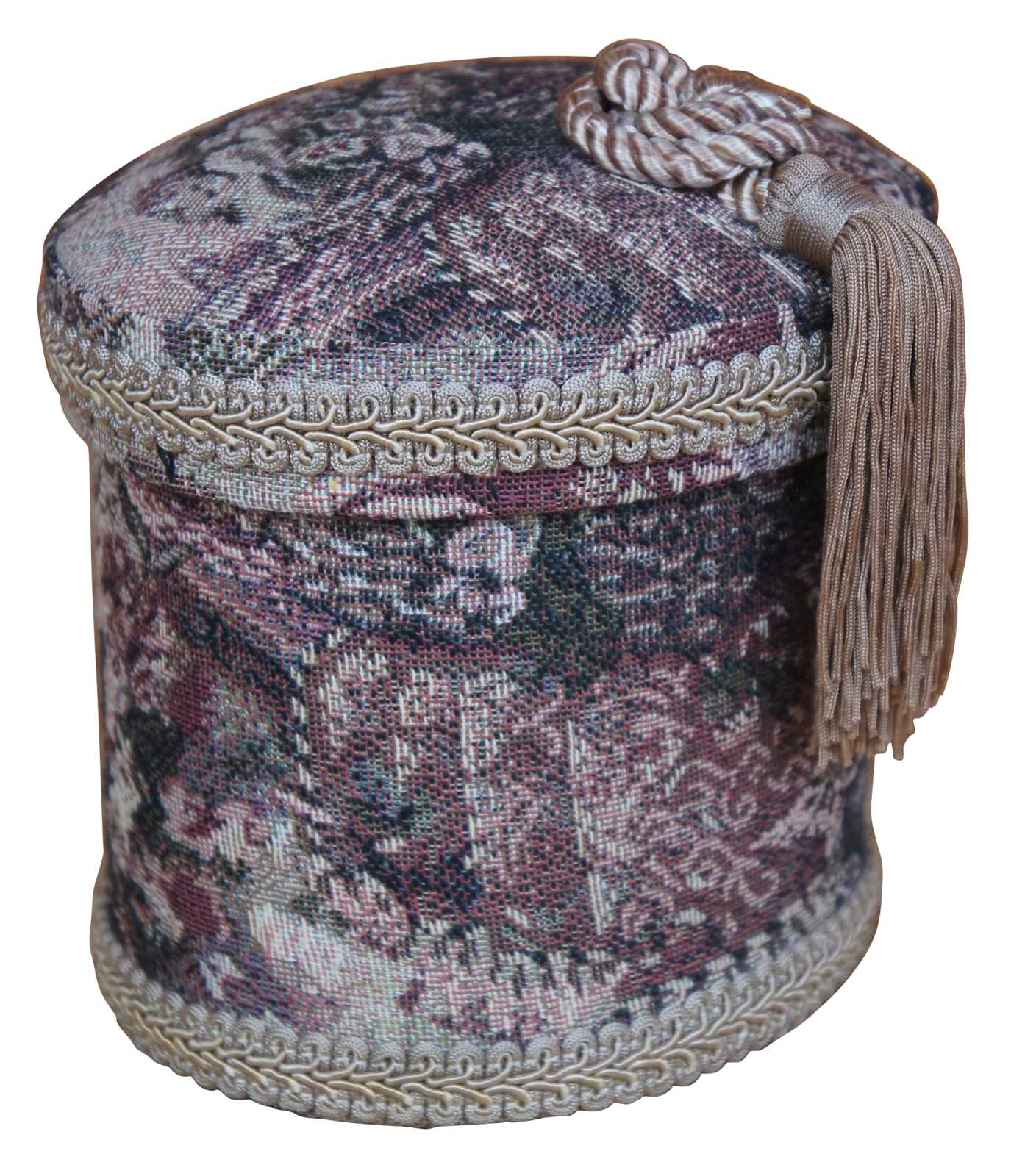 A lovely French brocade fabric covered keepsake jewelry, sewing, or boudoir box with decorative tassel.