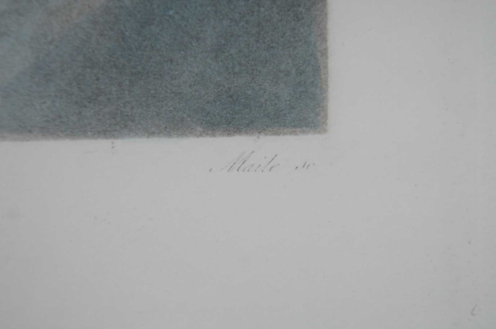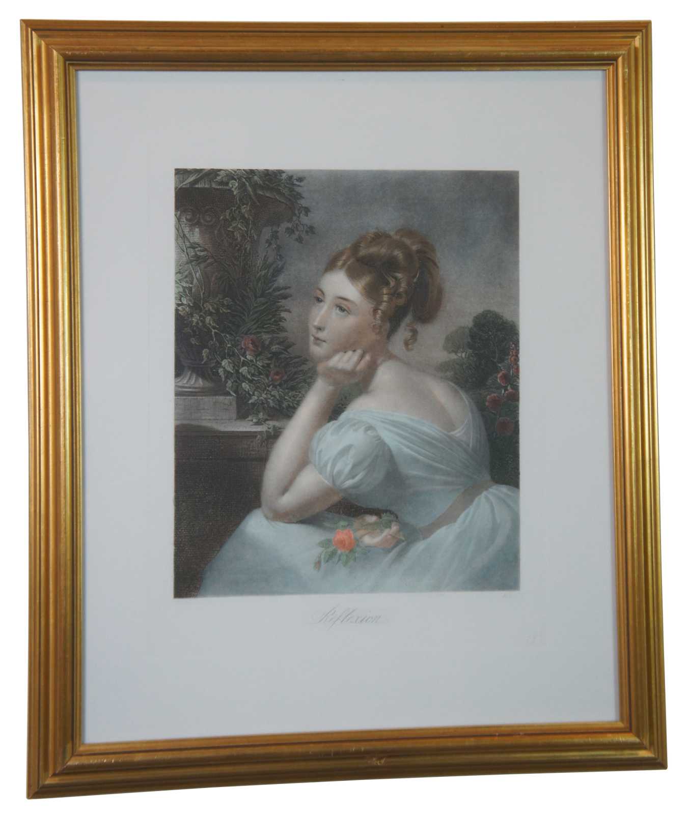 Two vintage French seductrice lithograph prints aptly titled Reflexion and Discretion by Maile Se. Both feature Victorian style women in pose, finished in gold frames.
