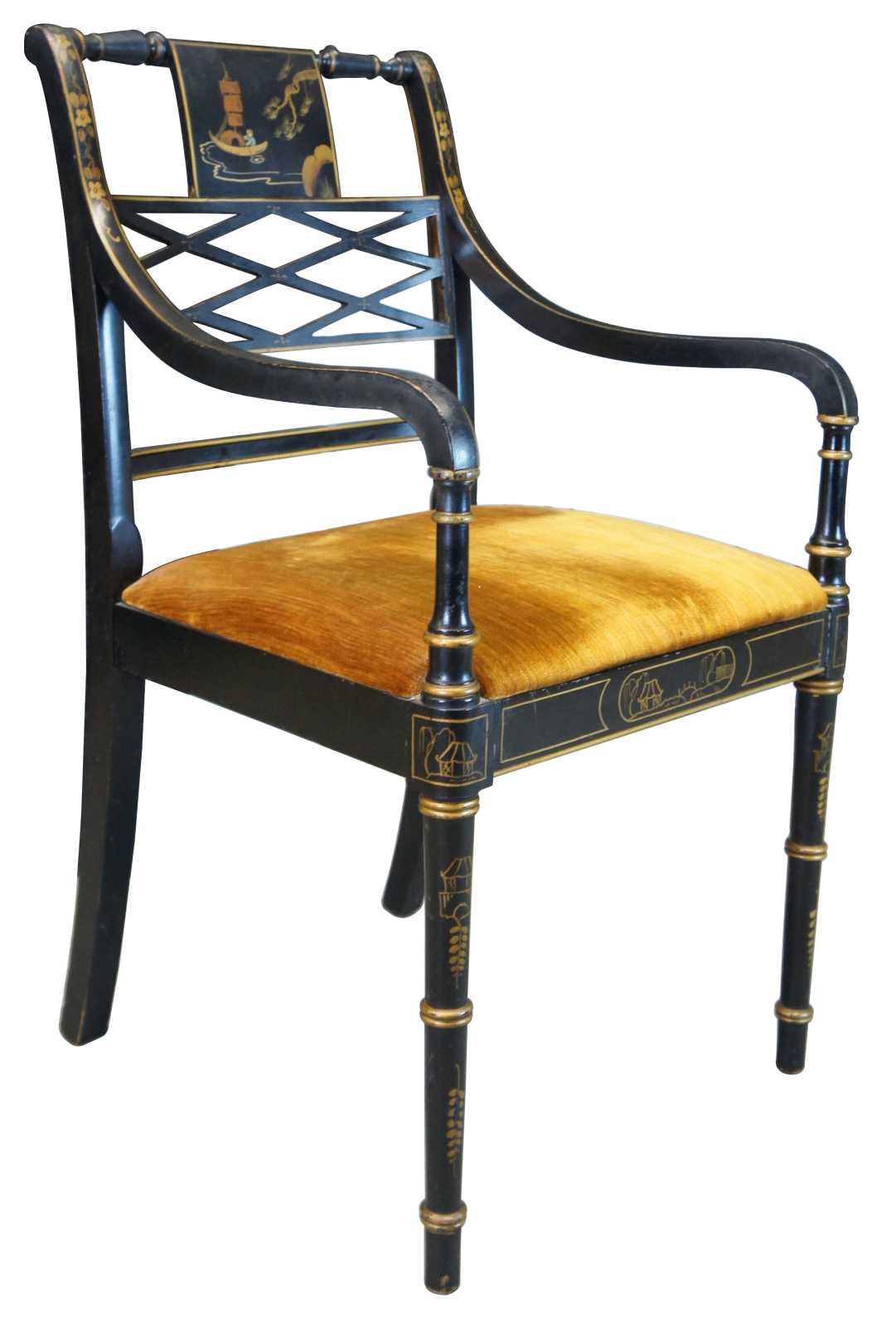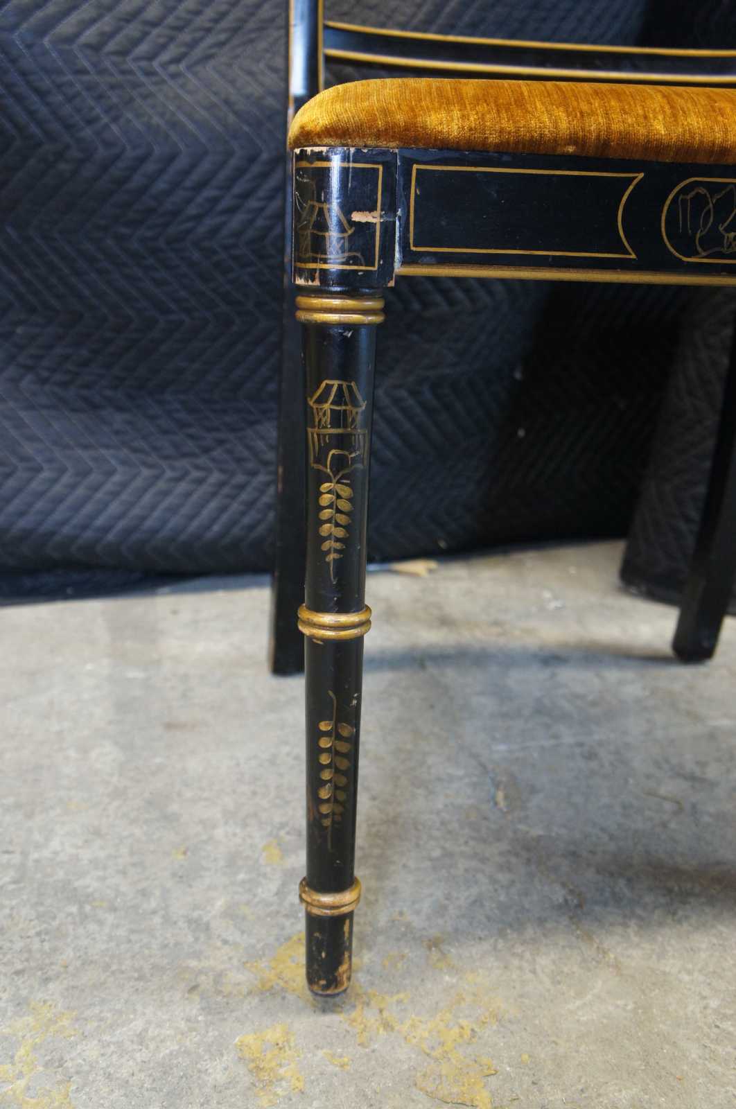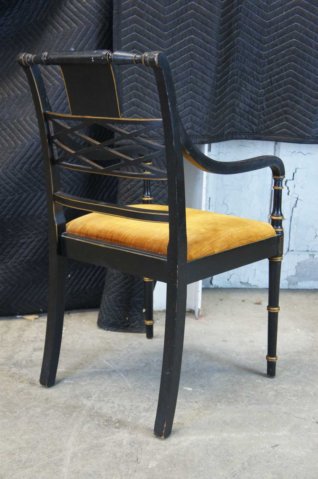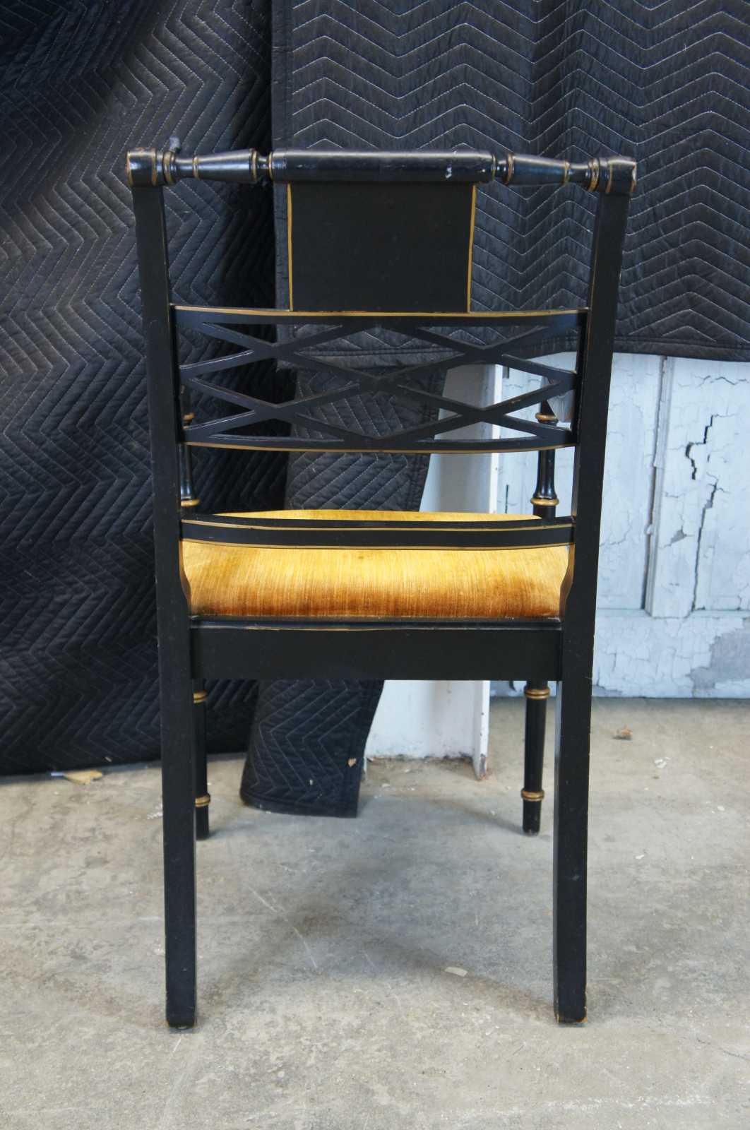 4 beautiful Chinese Chippendale inspired black lacquer dining chairs by Union National, circa 1980s. Features an open back with turned rail over painted sailboat waterscape and lattice fretwork. Each chair includes hand applied gold detail with florets and geisha scenes. Upholstered in gold.