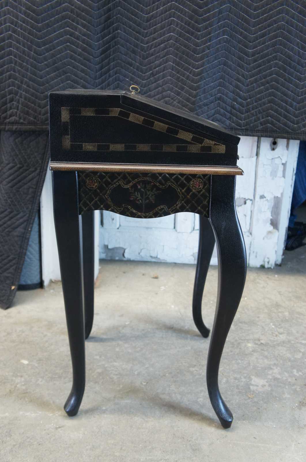 Black and gold petite secretary. Made from wood with leather like crackled black finish. Features painted, lattice, striped and floral designs. Includes 3 interior drawers as well as 1 lower drawer.