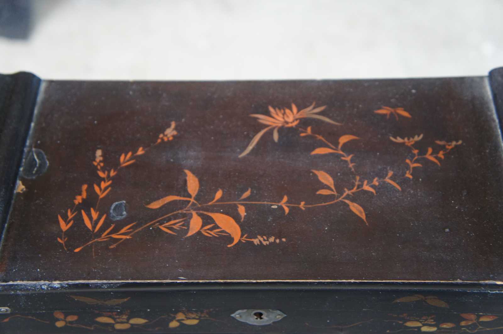 Antique Japanese Meiji Period vanity box in the form of a miniature armoire / chifferobe or Tallboy dresser, circa late 19th century. A rectangular form made from wood with black lacquer finish. Hand painted in red and gold featuring a foliate and bird design. Includes 5 drawers, cabinet with interior dividers, trapdoor below and upper sectioned compartment. The chest is supported by bracket feet and comes with the original key. The perfect organizer for curiosities, rings, necklaces and other jewelry.