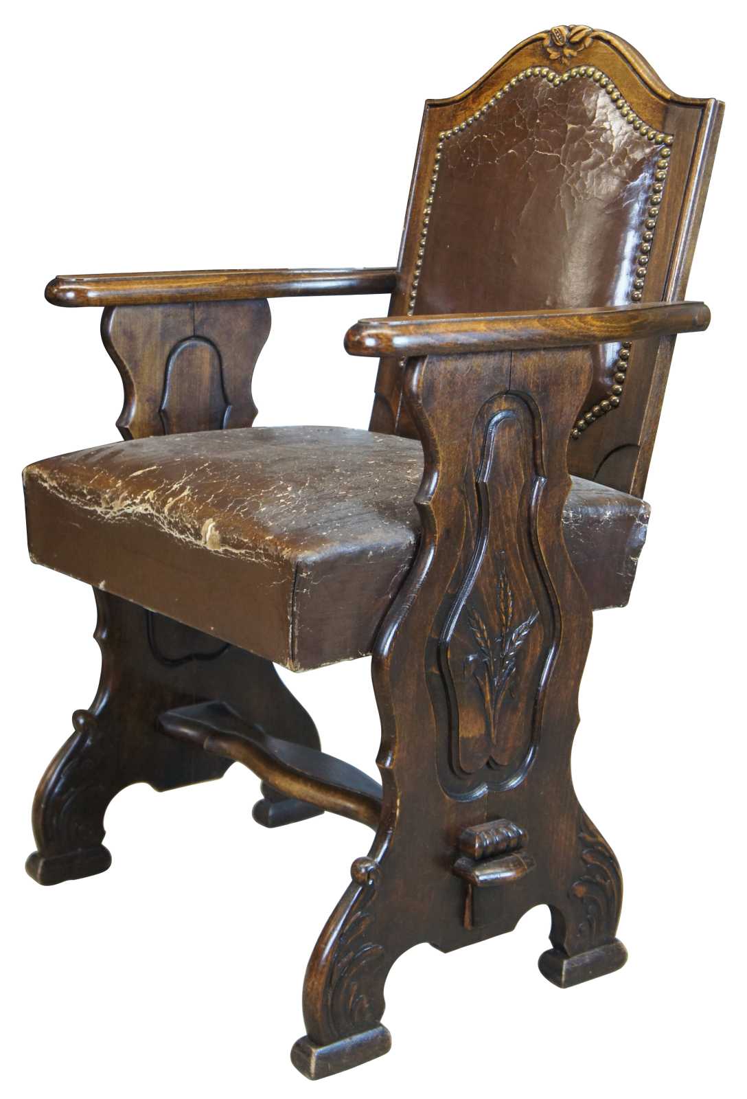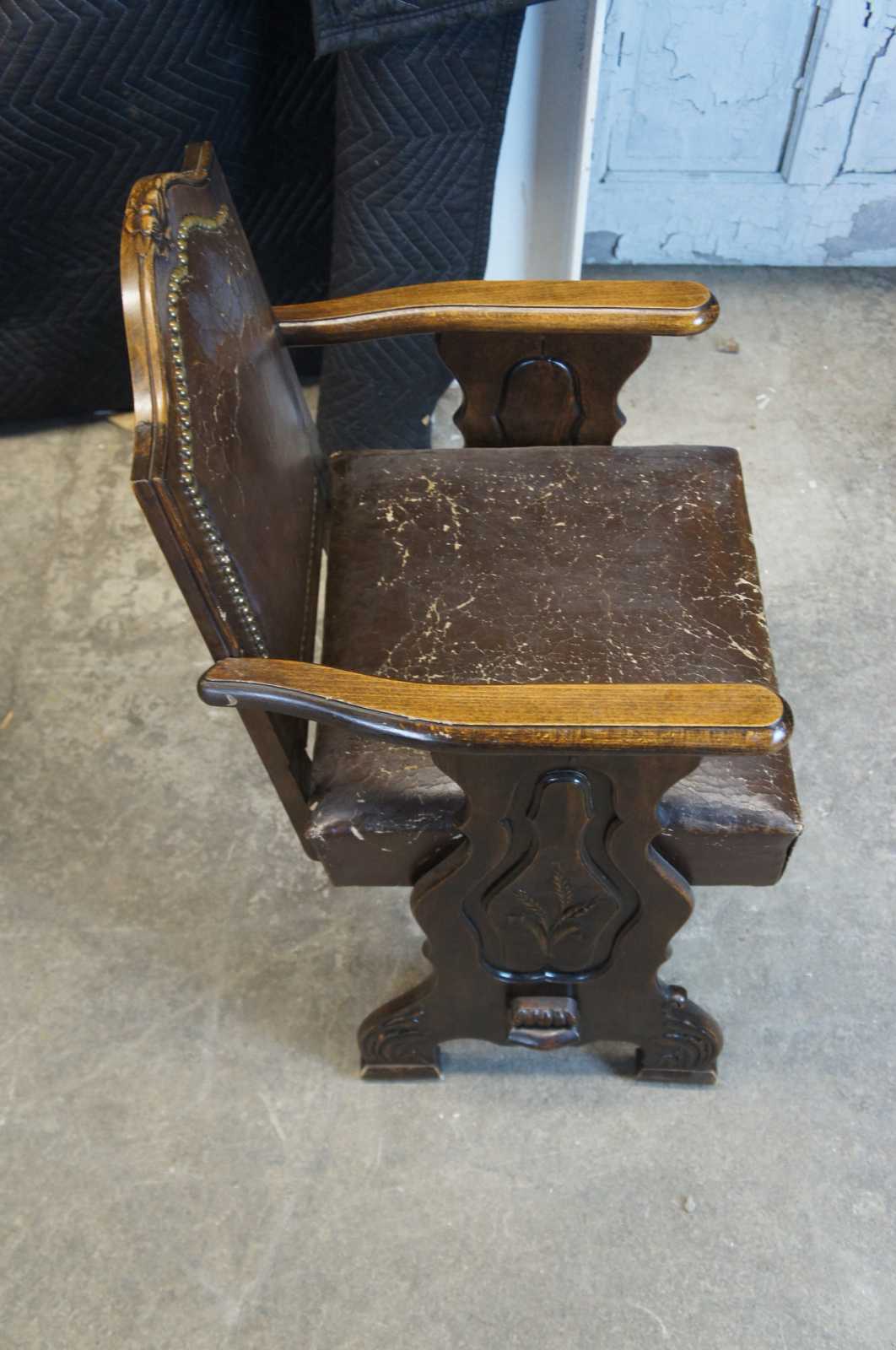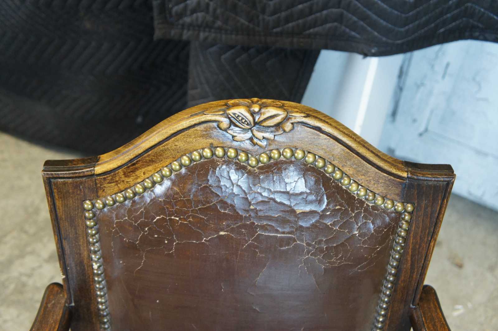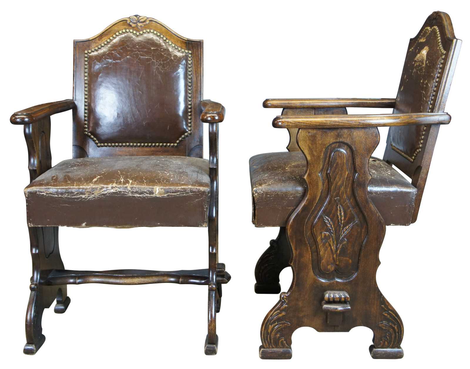 8 Antique French Country Old World oak dining chairs. An exquisite and unique form with molded side panels featuring wheat carvings and acanthus blocked feet. Upholstered in a brown leather with nailhead trim.