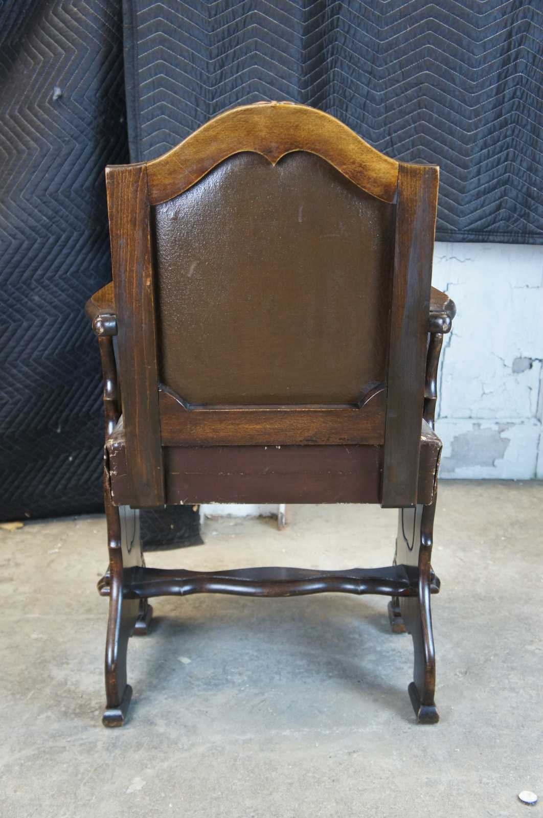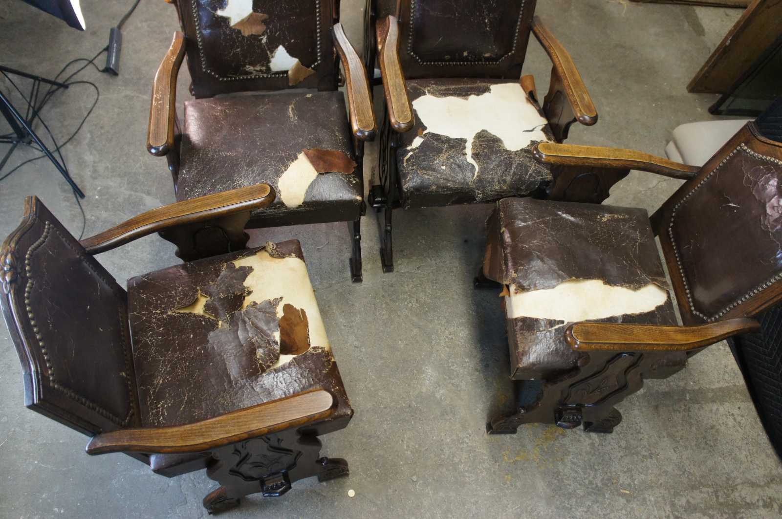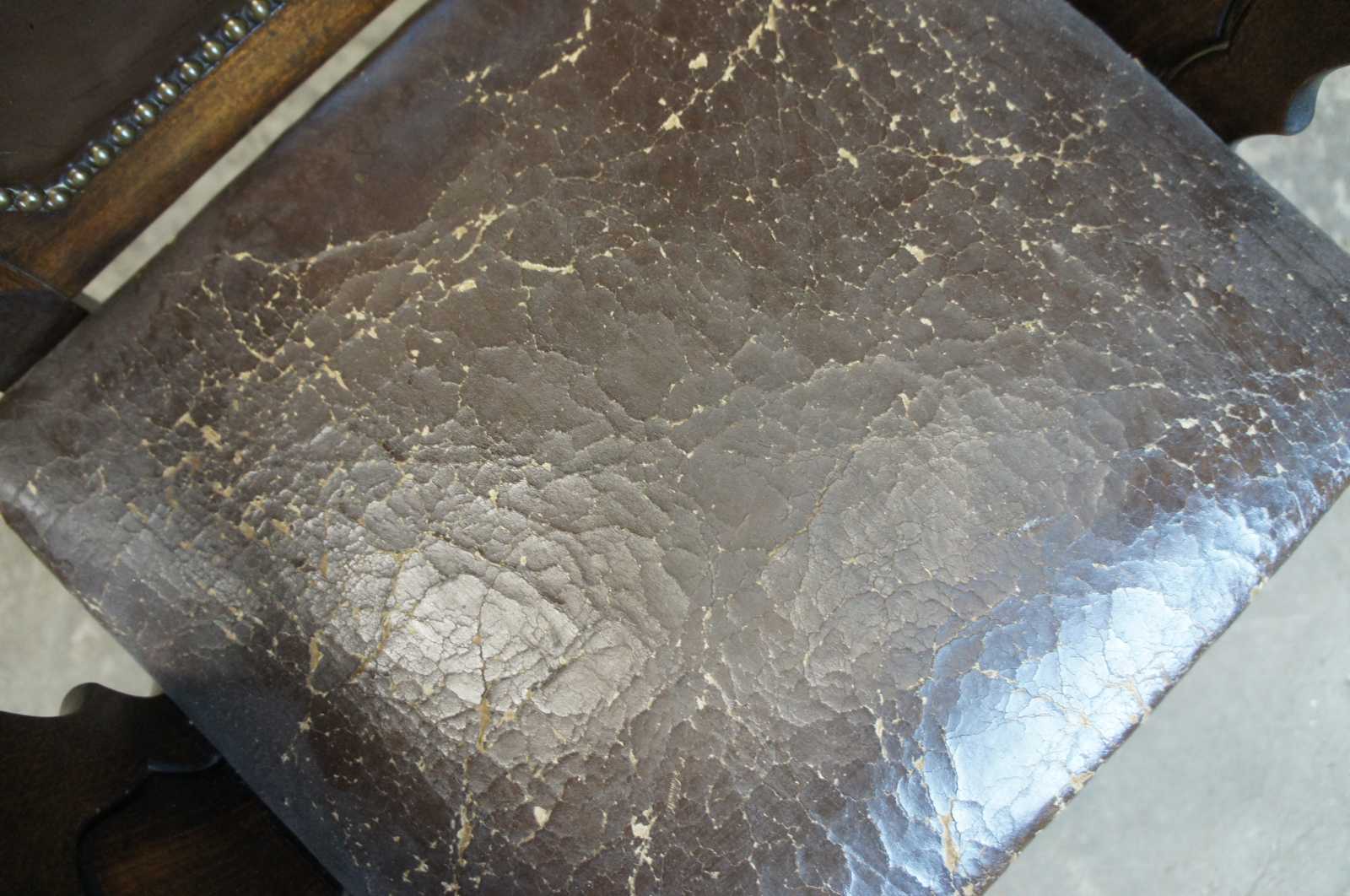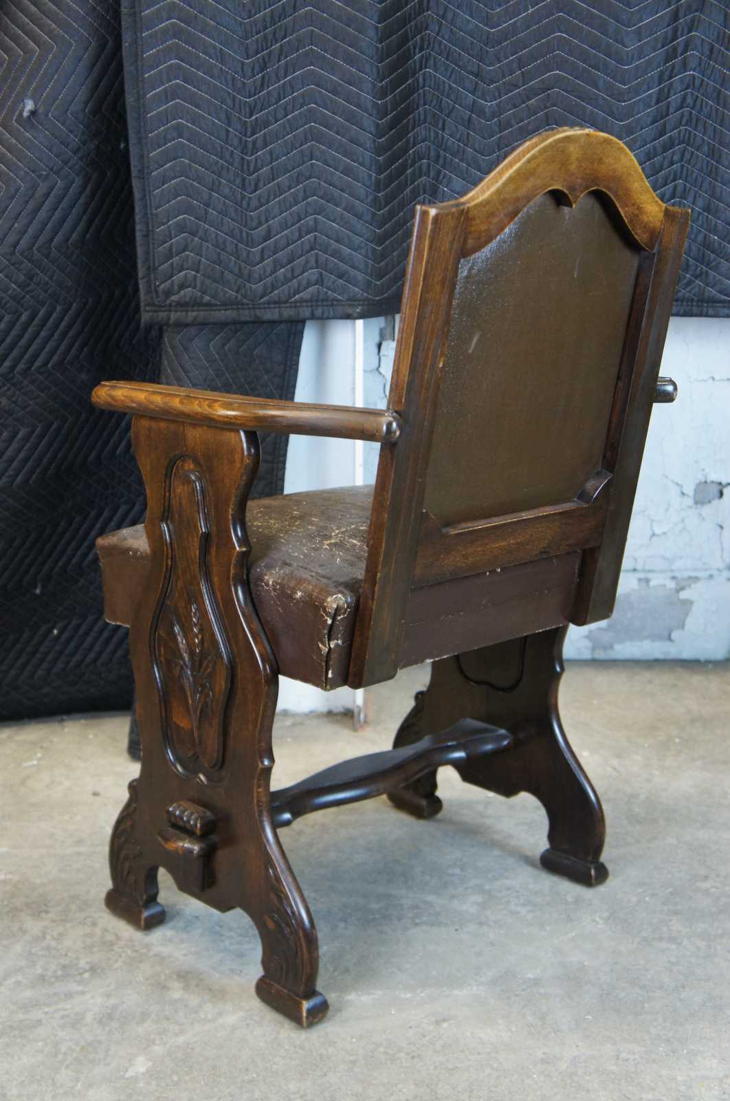 8 Antique French Country Old World oak dining chairs. An exquisite and unique form with molded side panels featuring wheat carvings and acanthus blocked feet. Upholstered in a brown leather with nailhead trim.