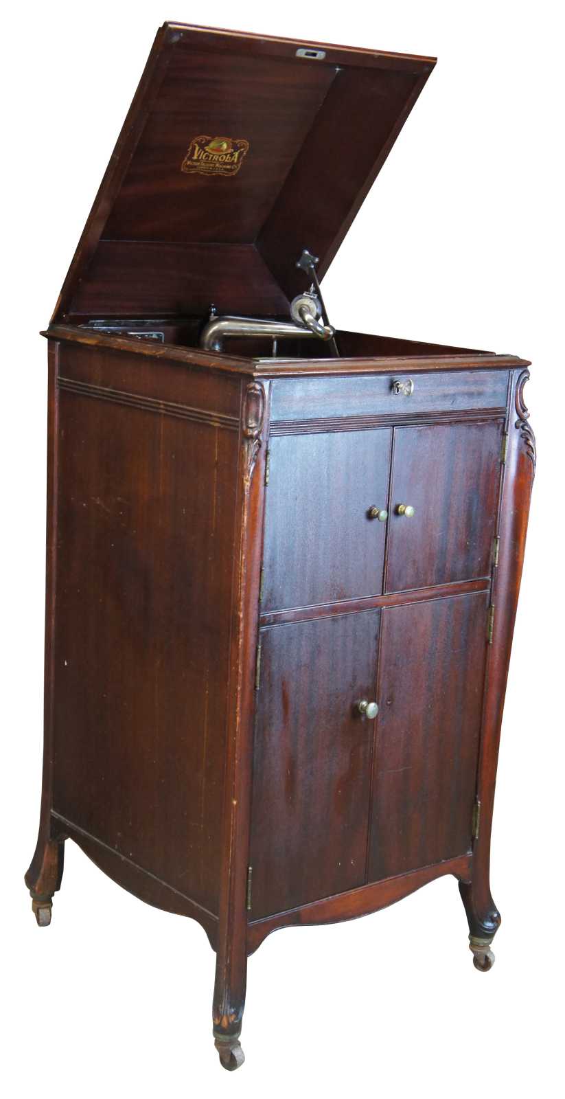 Good Overall; Crazing to the cabinet finish from age. Distressing and marking. Missing right door knob. The victrola seems to have a scratchy sound, unsure if it is the speaker or just in need of a new needle.