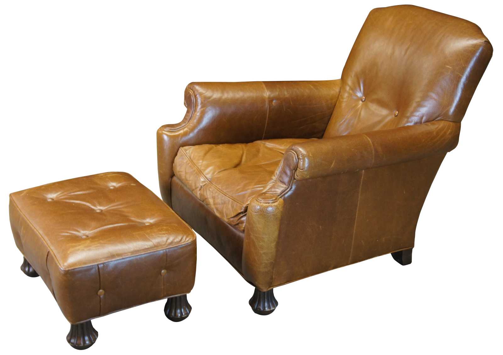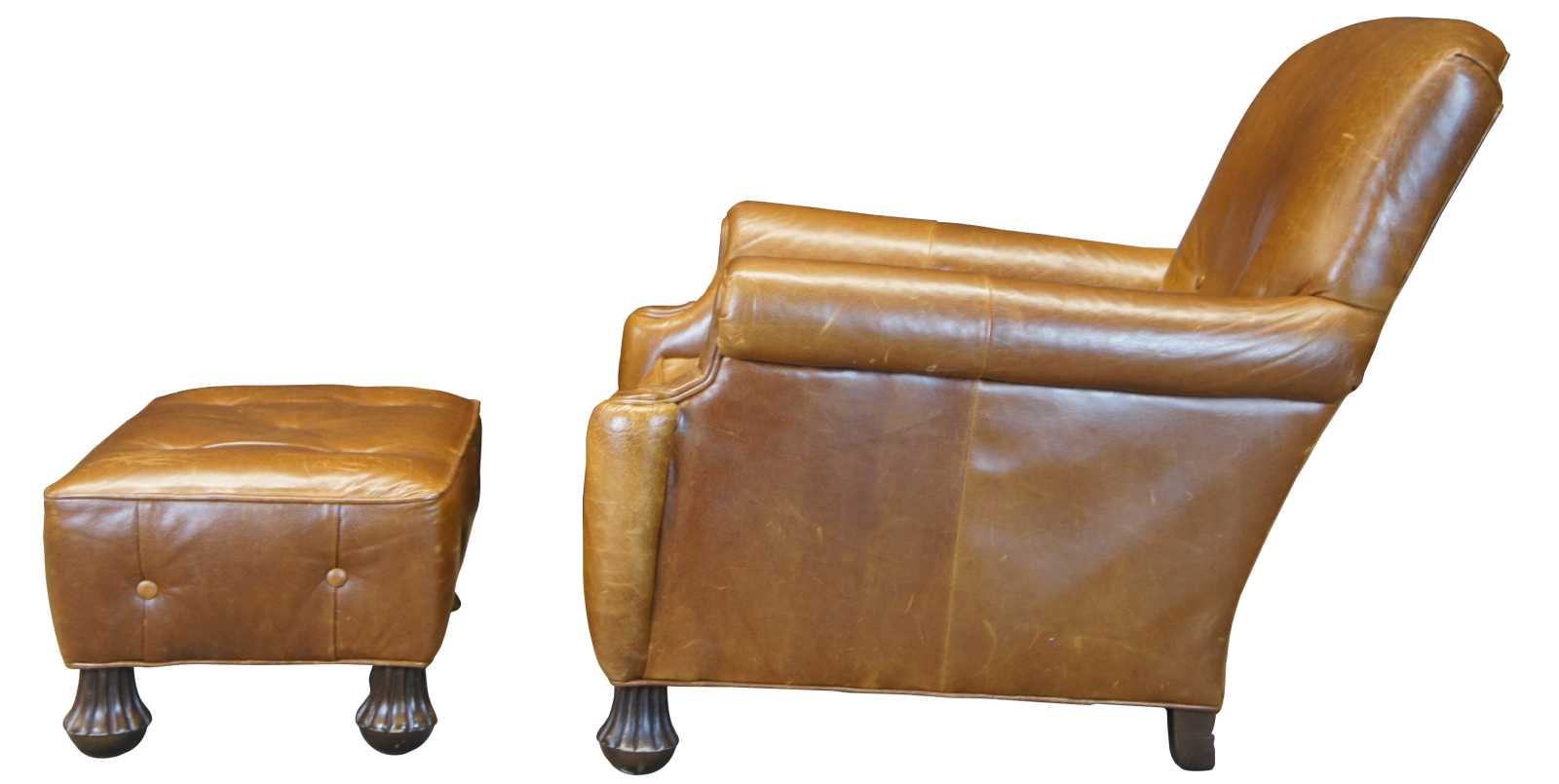 William Alan Inc brown leather club chair, circa 1999 Features a down cushion, rolled arms, tufted seat and ottoman and bun feet.