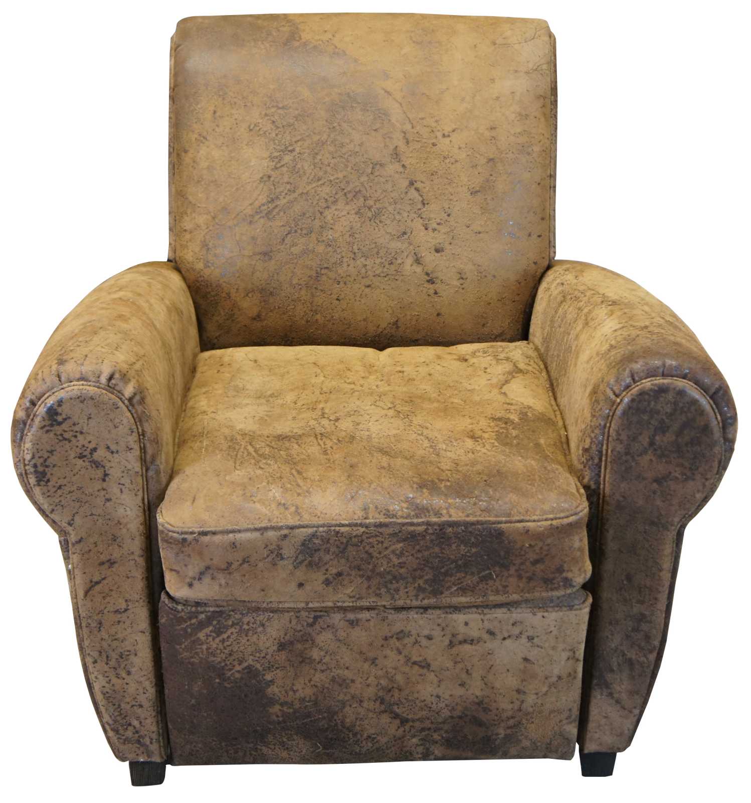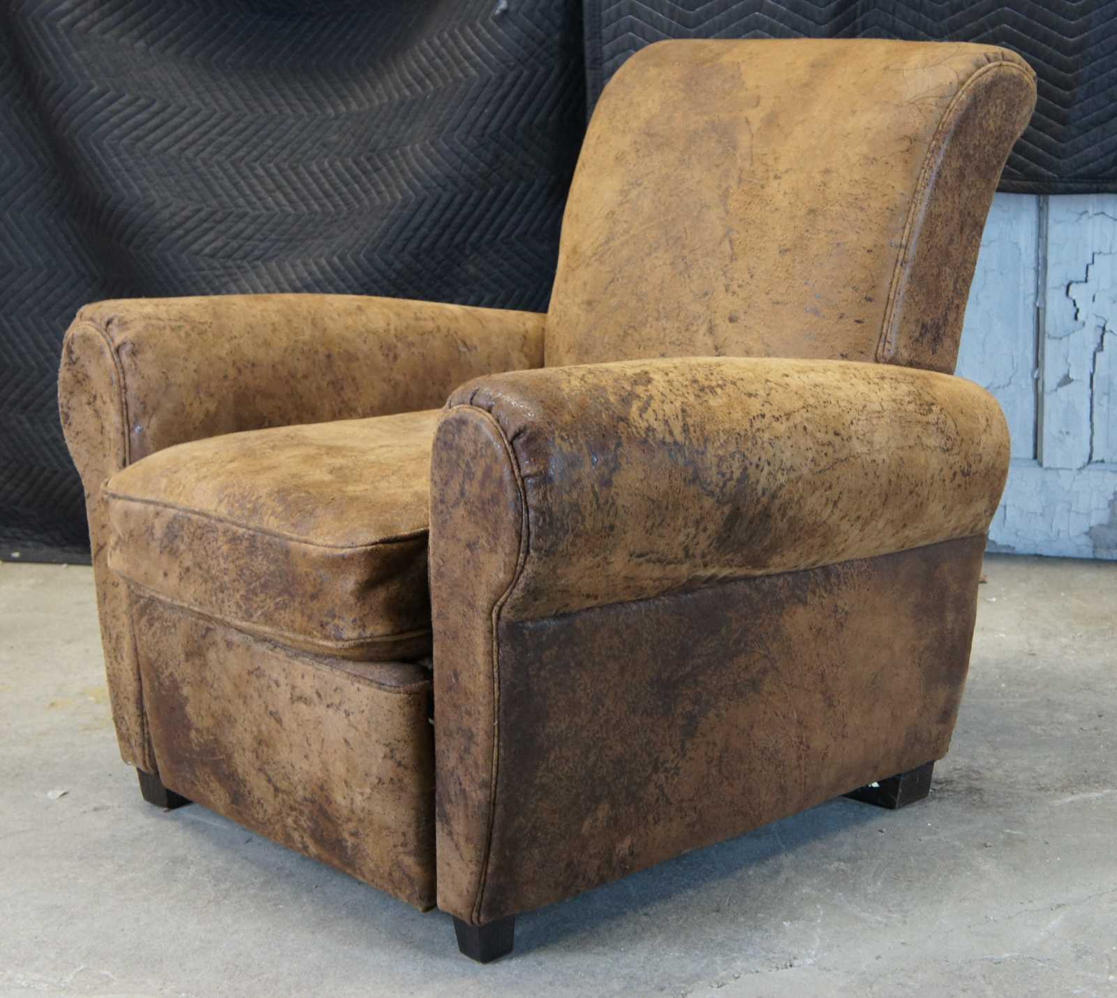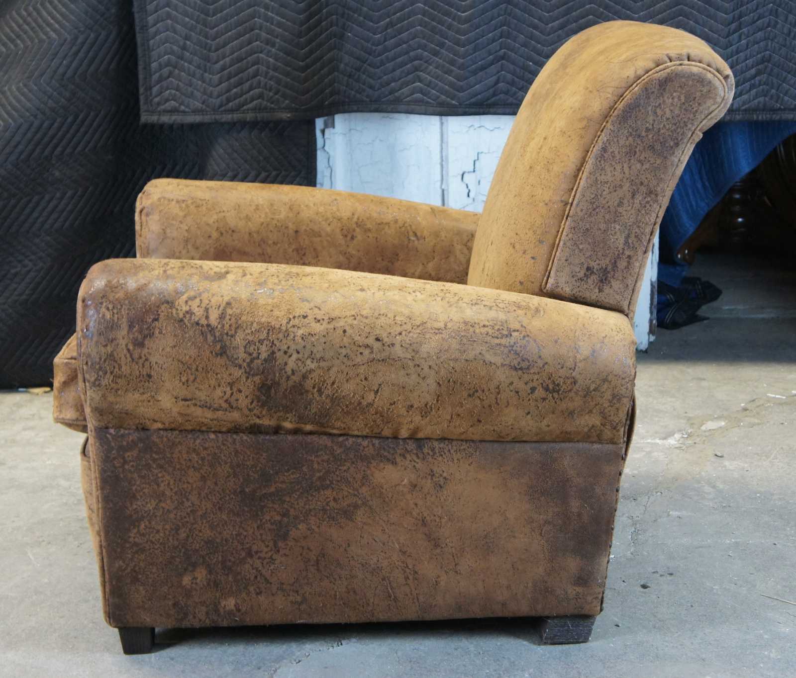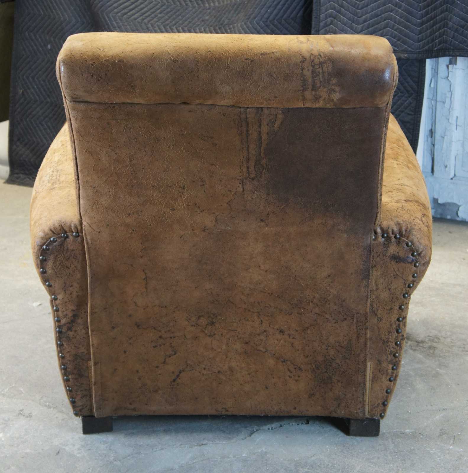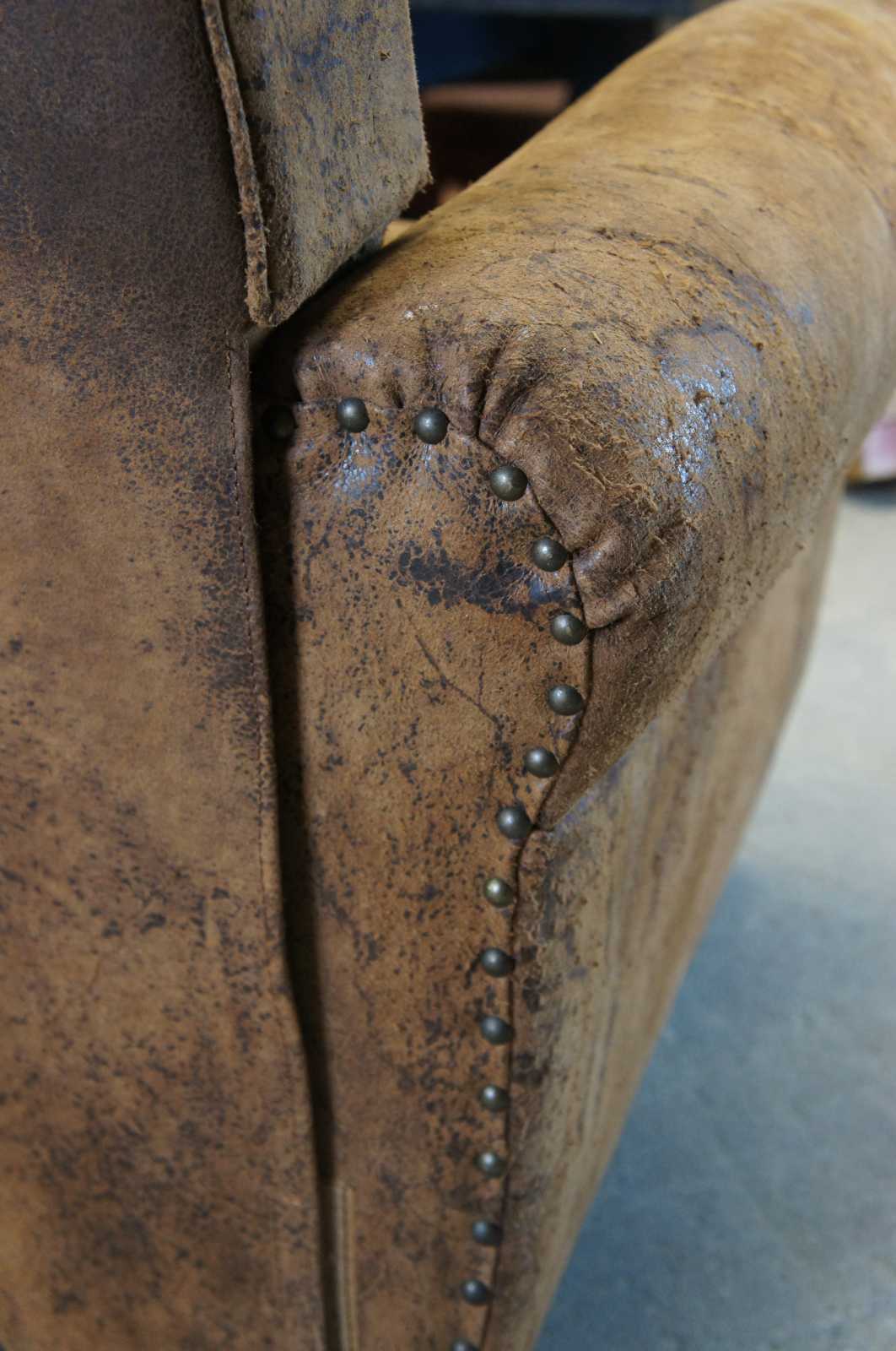 Upholstered in top grain naturally distressed brown leather.