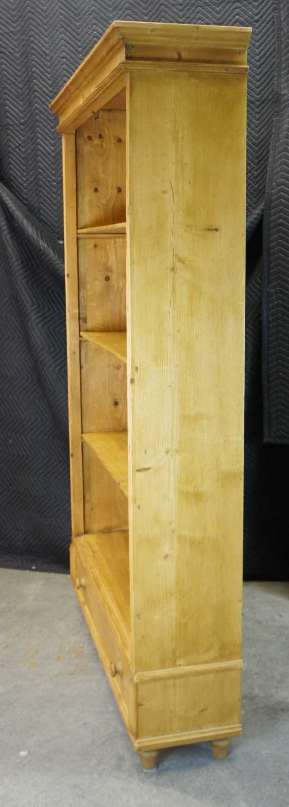 French Louis Philippe bookcase. Made from reclaimed pine with a paneled back, removable shelves and lower dovetailed drawer. Supported by turned peg feet. Great for display of books or collectibles.