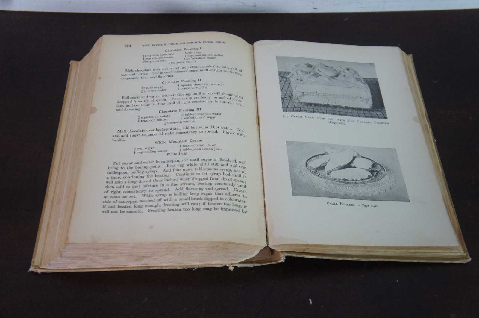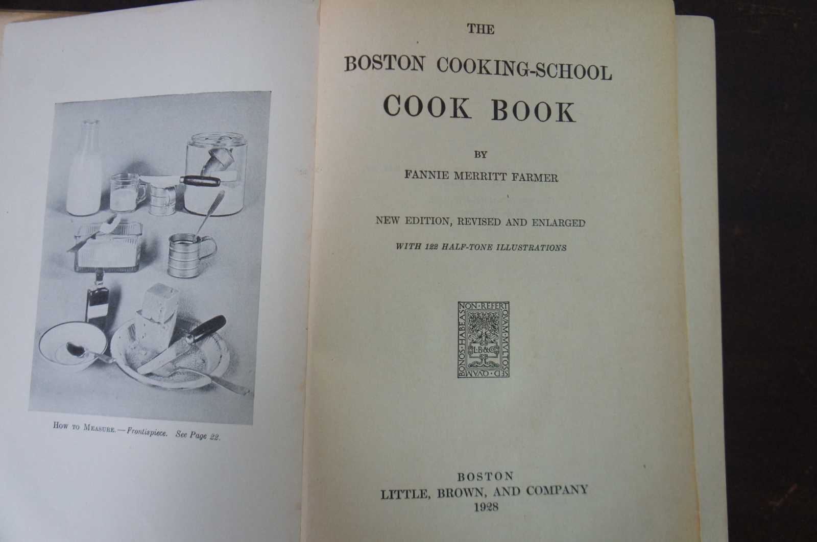 Antique cloth hard cover copy of “The Boston Cooking-School Cook Book” by Fannie Merritt Farmer, “New Edition, Revised and Enlarged with 122 half-tone illustrations,” published by Little, Brown & Company, 1928.
