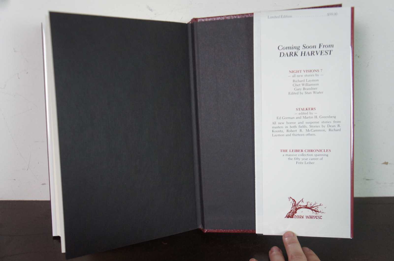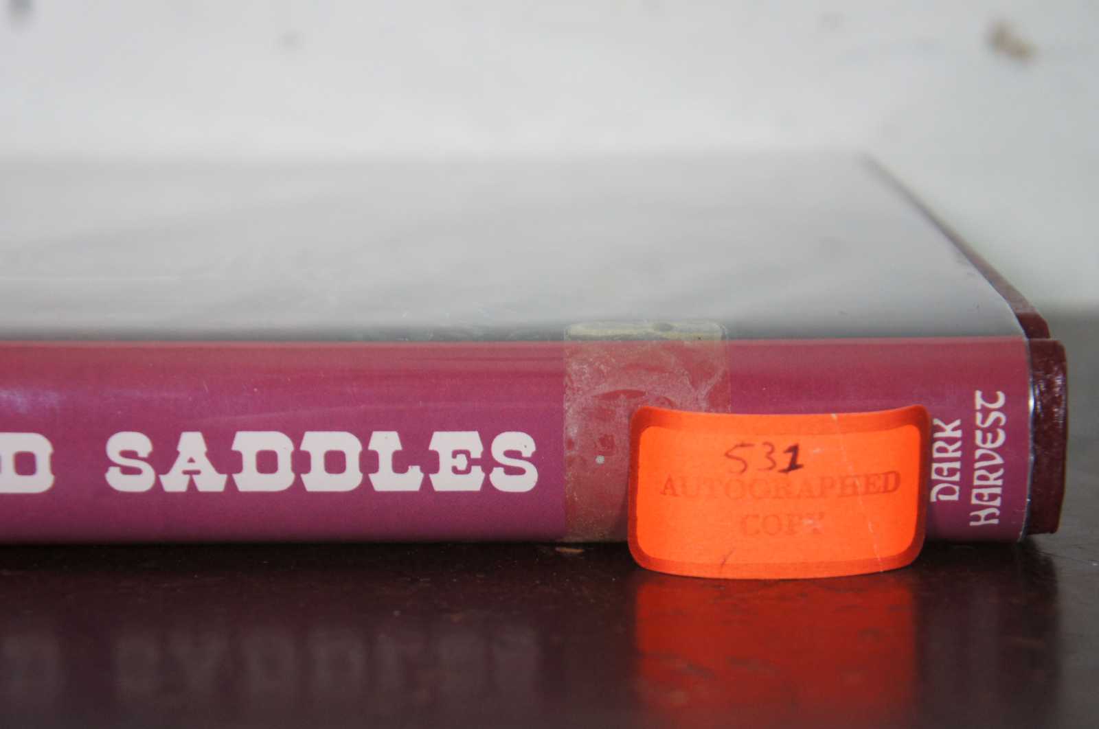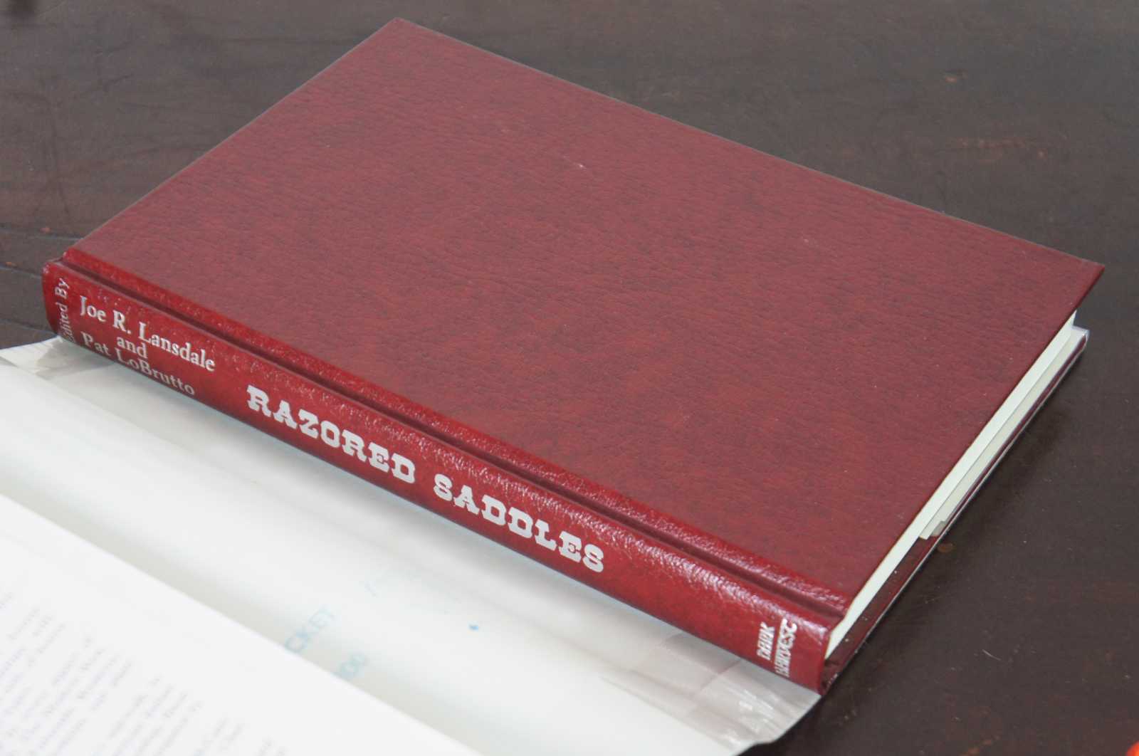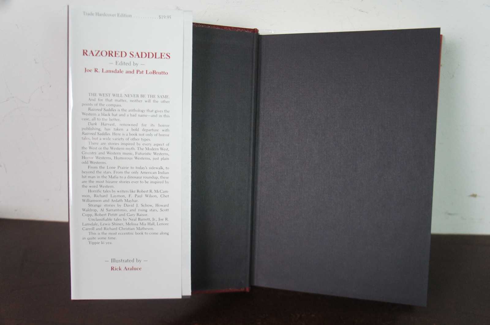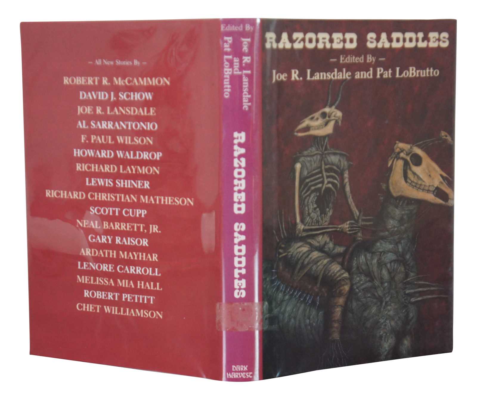 Vintage hard cover deluxe 1st edition copy of “Razored Saddles” edited by Joe R. Lansdale & Pat LoBrutto, illustrated by Rick Araluce, produced by Dark Harvest, 1989. Anthology containing stories by Robert R. McCammon, Joe R. Lansdale, Al Sarrantonio, Richard Laymon, Scott Cupp, Neal Bennett, Jr, Ardath Mayhar, Chet Williamson, F. Paul Wilson, David J. Schow, Howard Waldrop, Lewis Shiner, Richard Christian Matheson, Gary Raisor, Lenore Carroll, Melissa Mia Hall, and Robert Petitt. Numbered 531 of 600 and autographed by Richard Laymon, Robert R. McCammon, Al Sarrantonio, Chet Williamson, Richard Matheson(?), Ardath Mayhar, and Patrick LoBrutto.