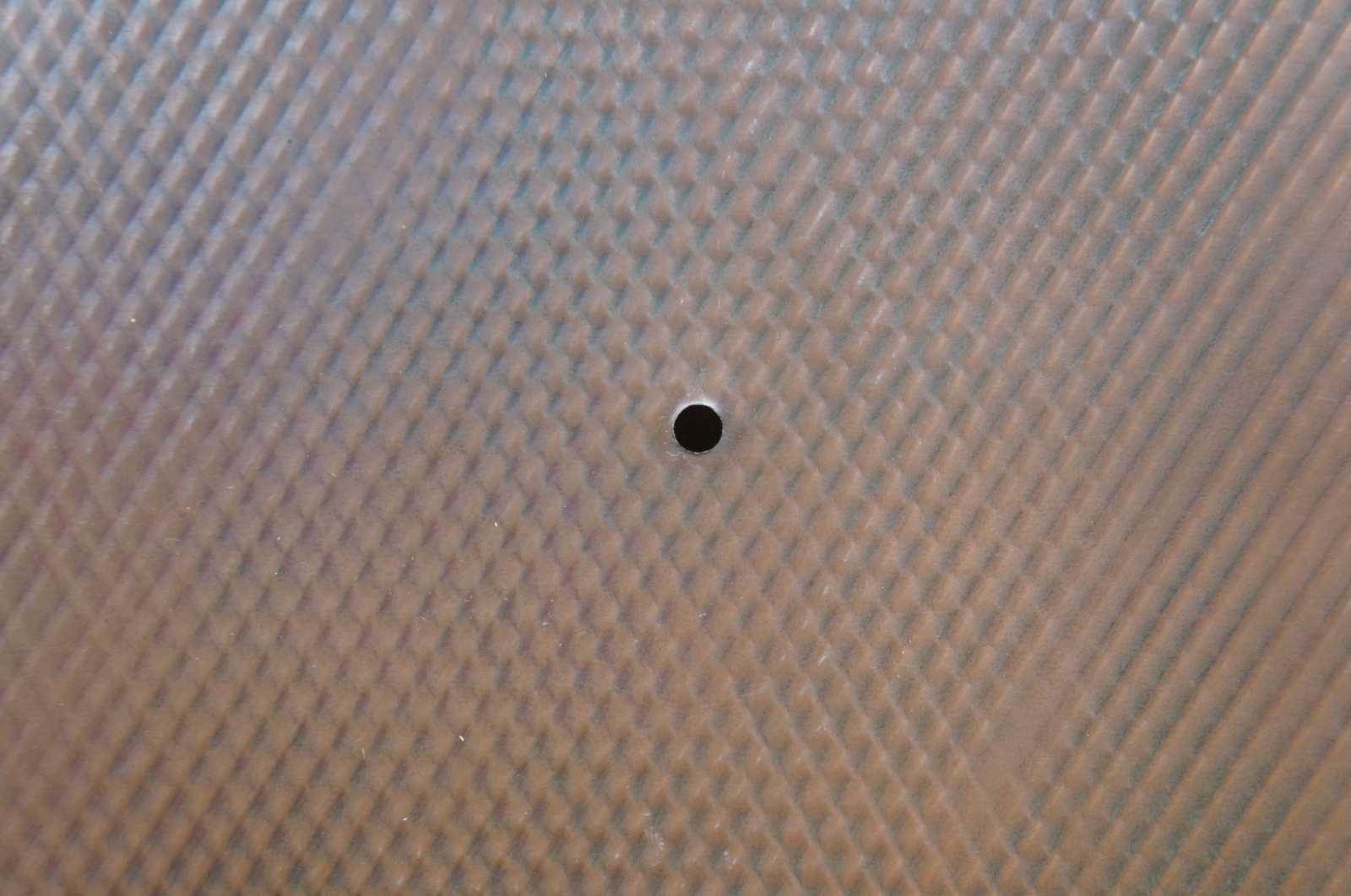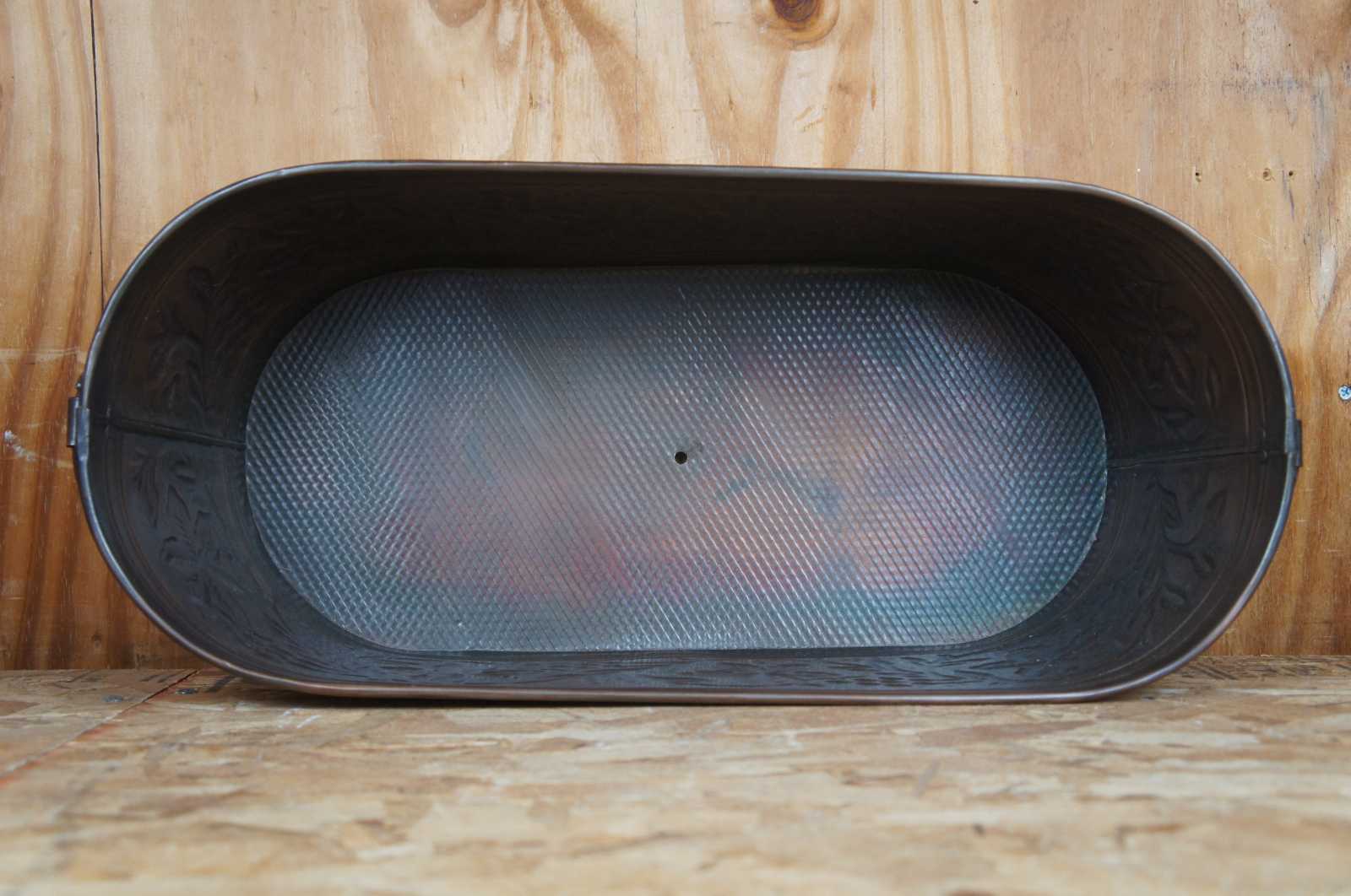 Vintage metal trough bin or planter featuring embossed metal design of grapes and leaves. Two ring shaped handles on the ends with drain hole at center.