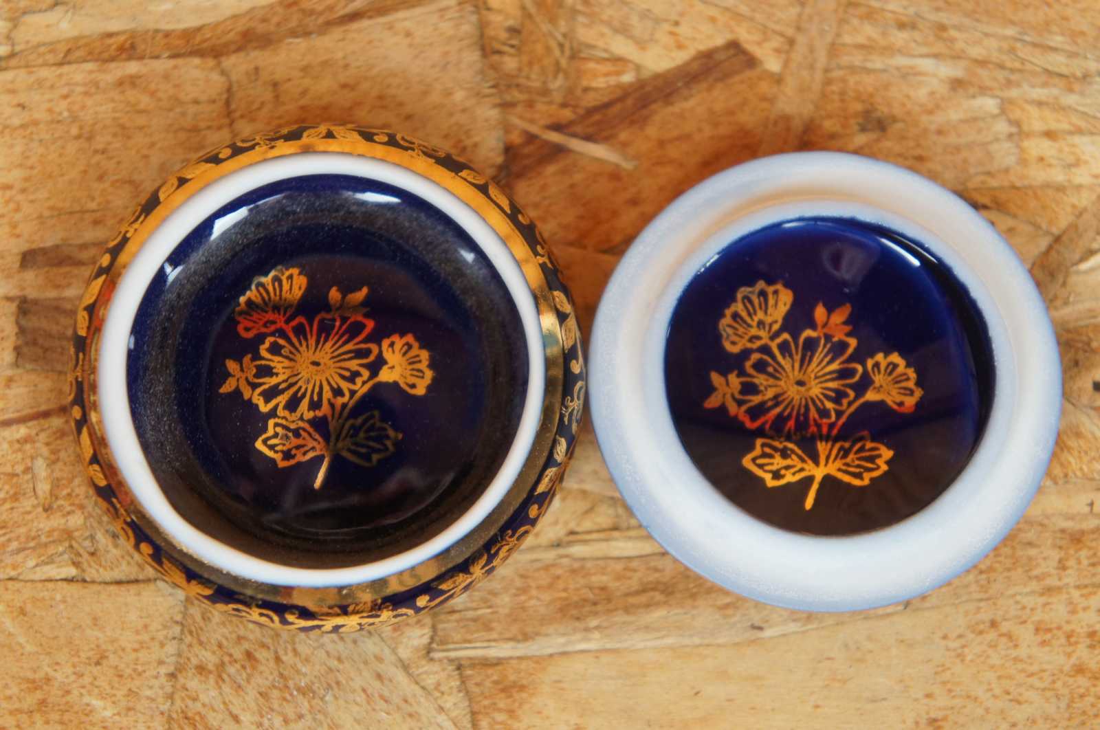 Three lidded limoge trinket boxes. Wedgwood Kutani Crane floral peacock / bird, England. Royal Collection Buckingham Palace 1999, English. Limoges 22k gold cobalt porcelain Courting Couple, France.