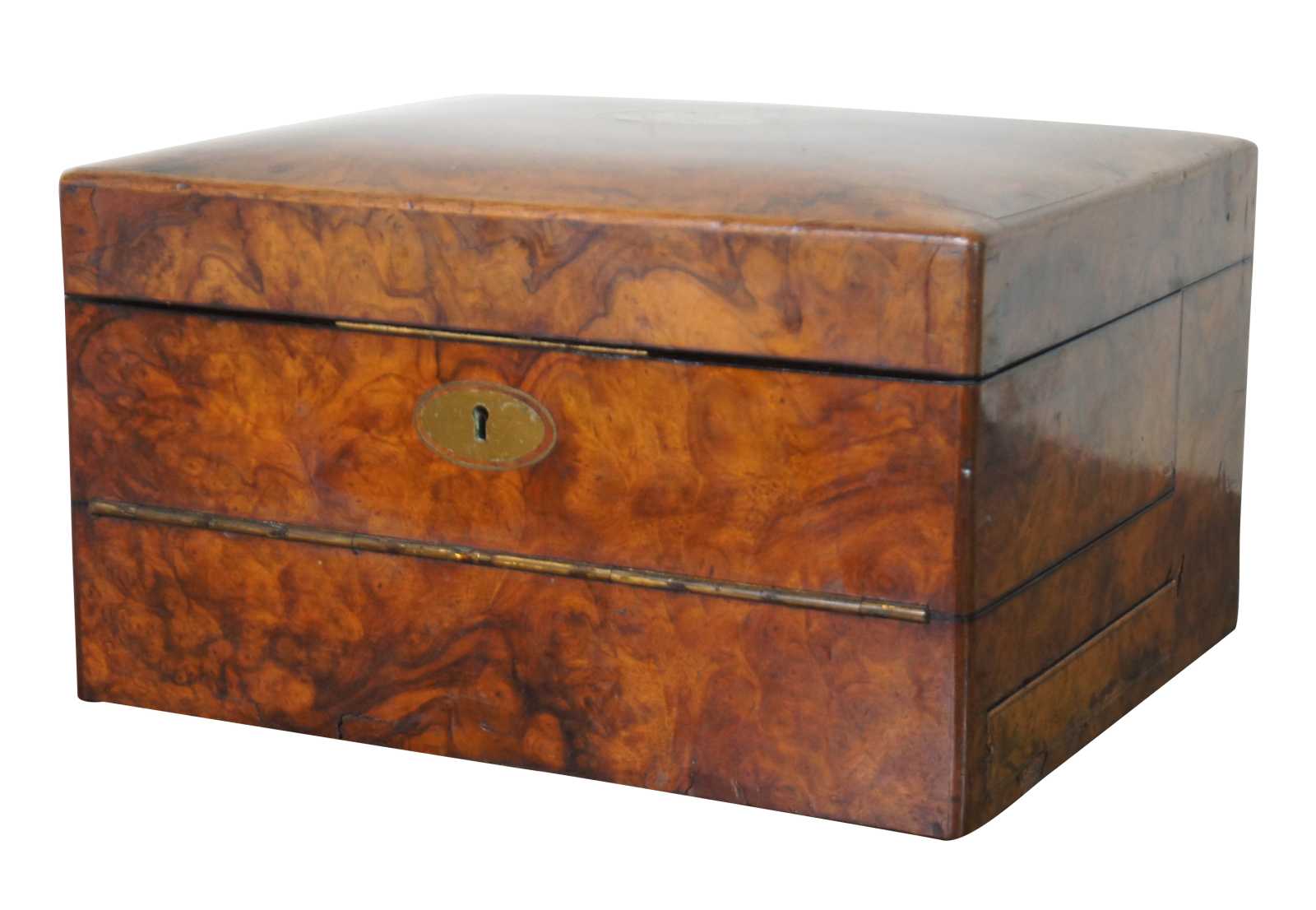 Antique mid 19th century English walnut burl wood vanity box, originally owned by Charles B. Hornby, employee of Spencer & Craig Printing Works of Cincinnati, OH. Engraved plaque on top reads “From His Brother Edward.” The interior feathers a leather framed mirror and folds open to reveal a variety of compartments, plus eight glass and repousse silver topped containers for toiletries. On the left hand side is a small button, which when pressed opens a small drawer that emerges from the bottom right side of the box. This velvet lined drawer has spaces for storing a variety of personal care tools, only three of which are extant: a small corkscrew and button hook (which match and appear original to the box) and a bodkin or awl which is of a slightly different length and material.